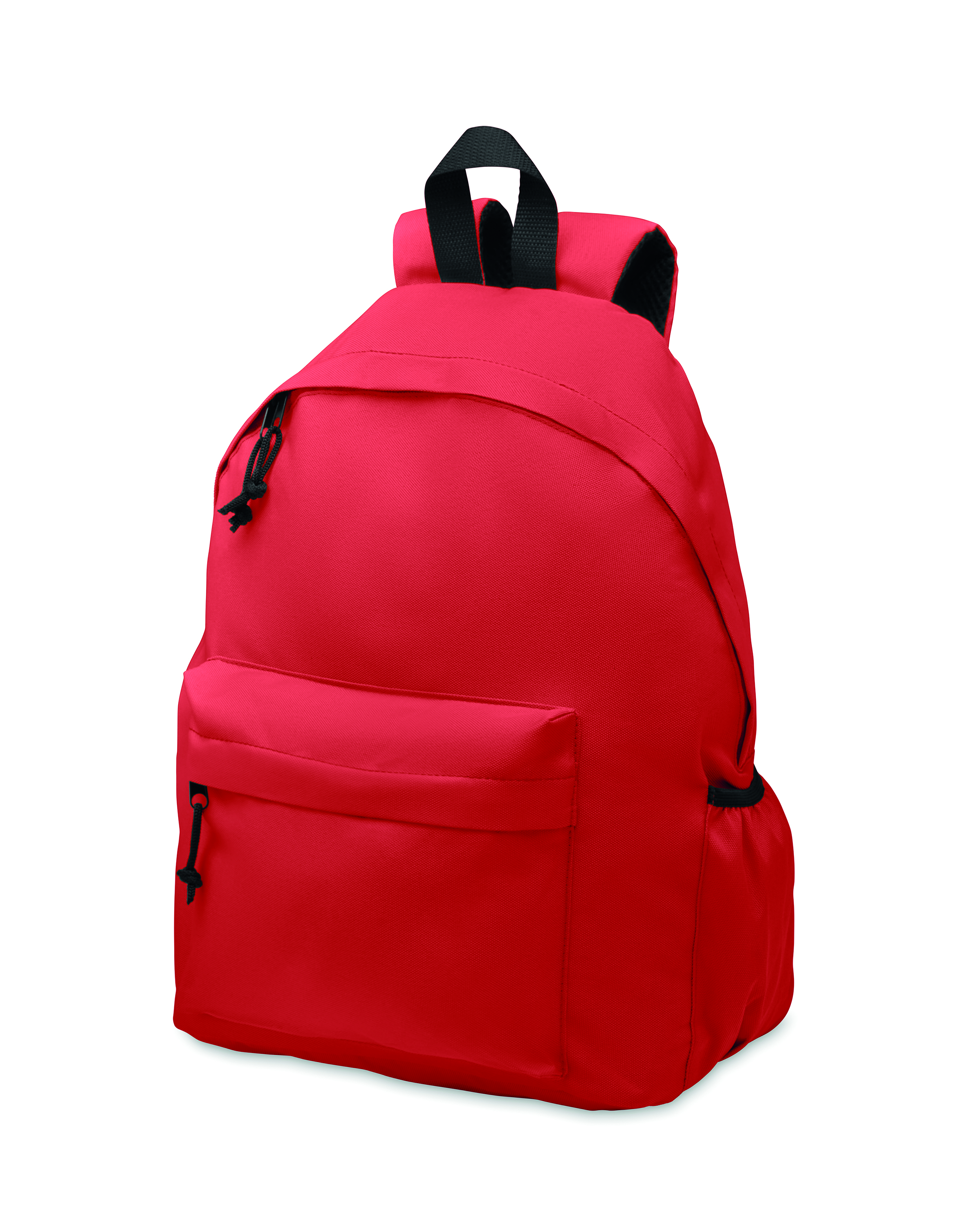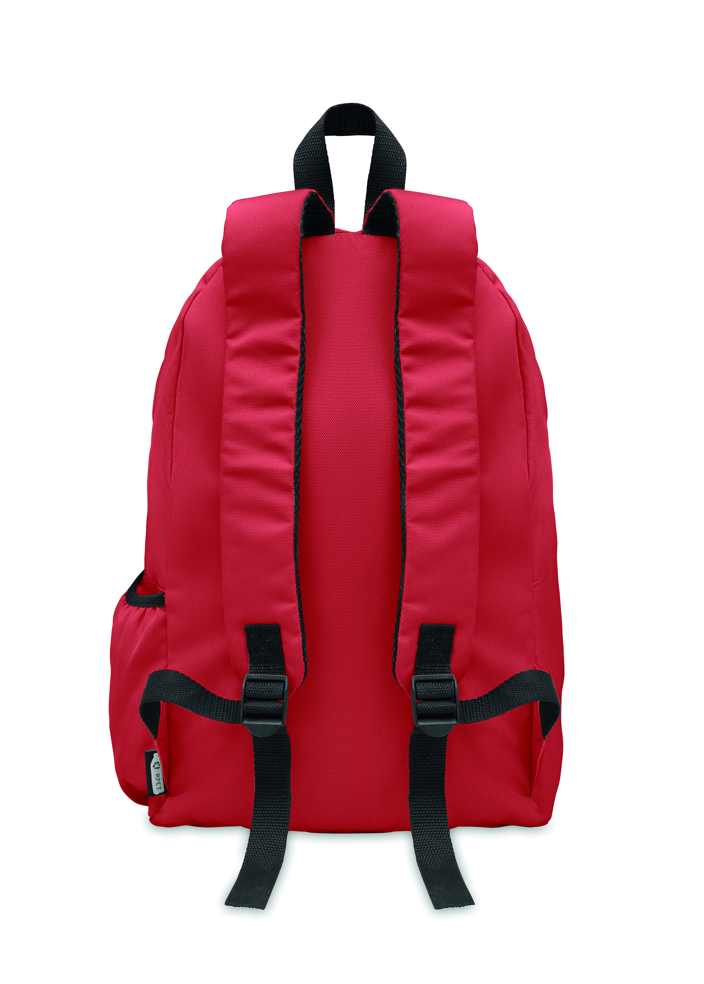 Plecak z poliestru 600D RPET z zewnętrzną kieszenią na zamek. Wyściełany tył i boczna przegródka na butelkę.