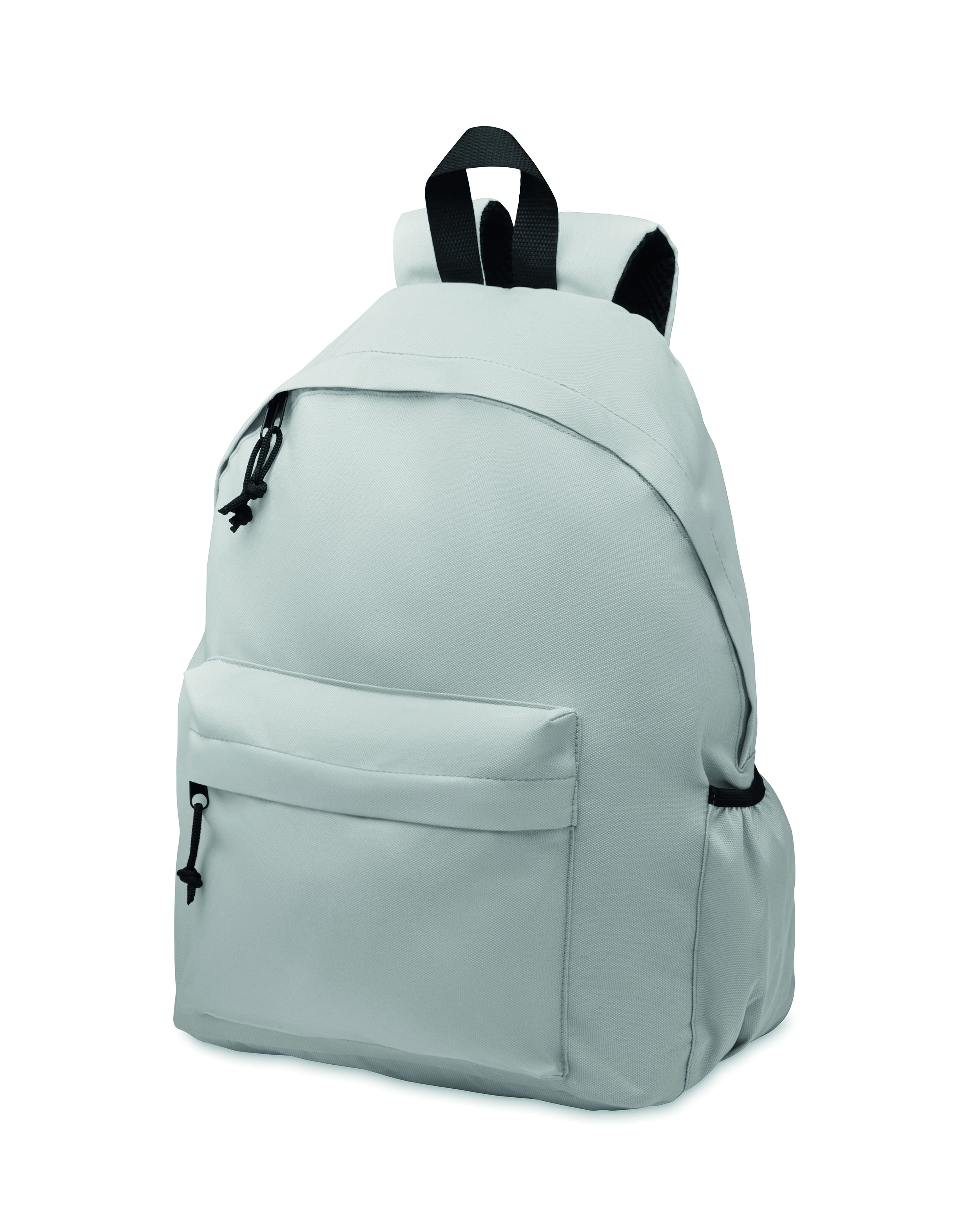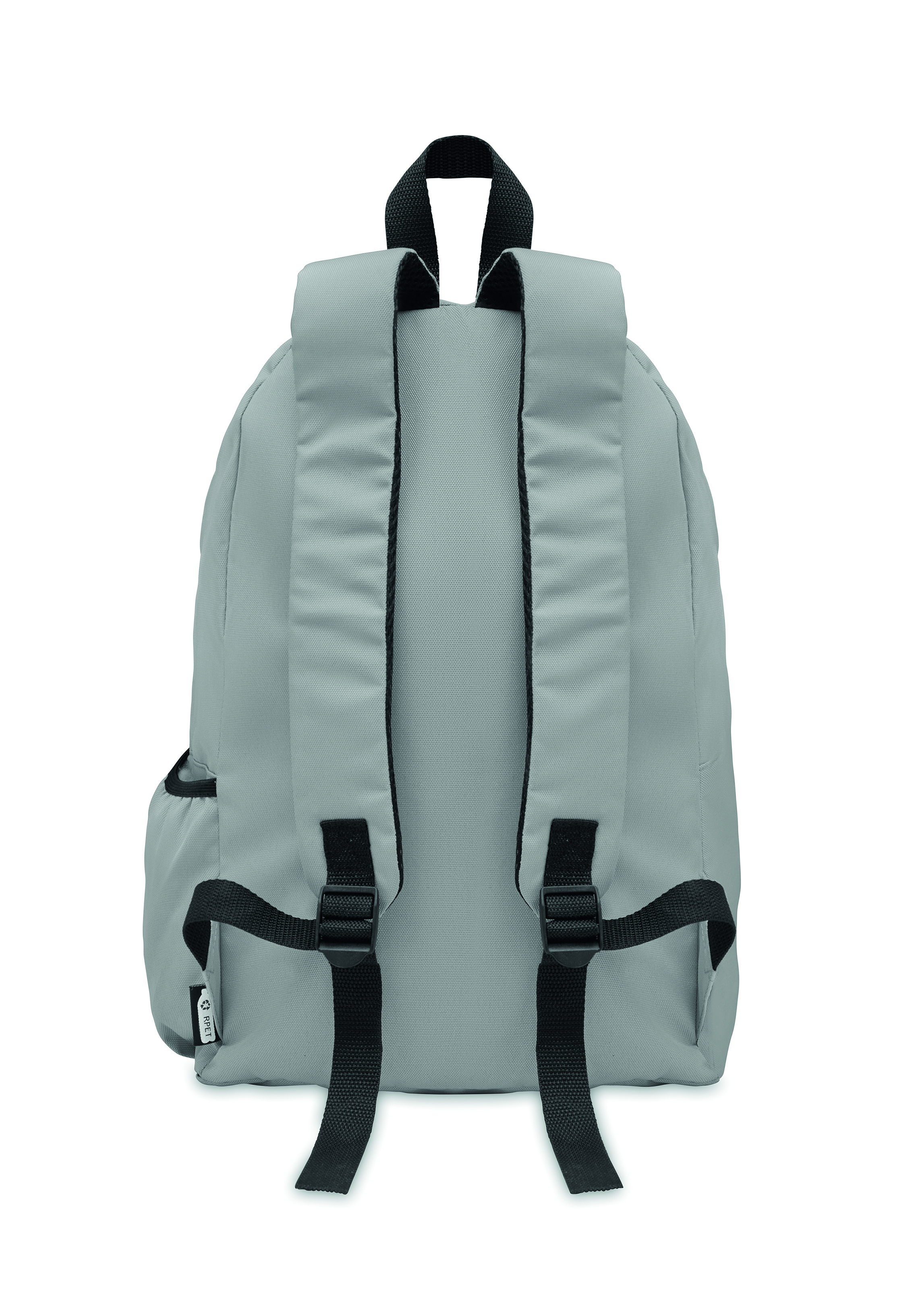 Plecak z poliestru 600D RPET z zewnętrzną kieszenią na zamek. Wyściełany tył i boczna przegródka na butelkę.