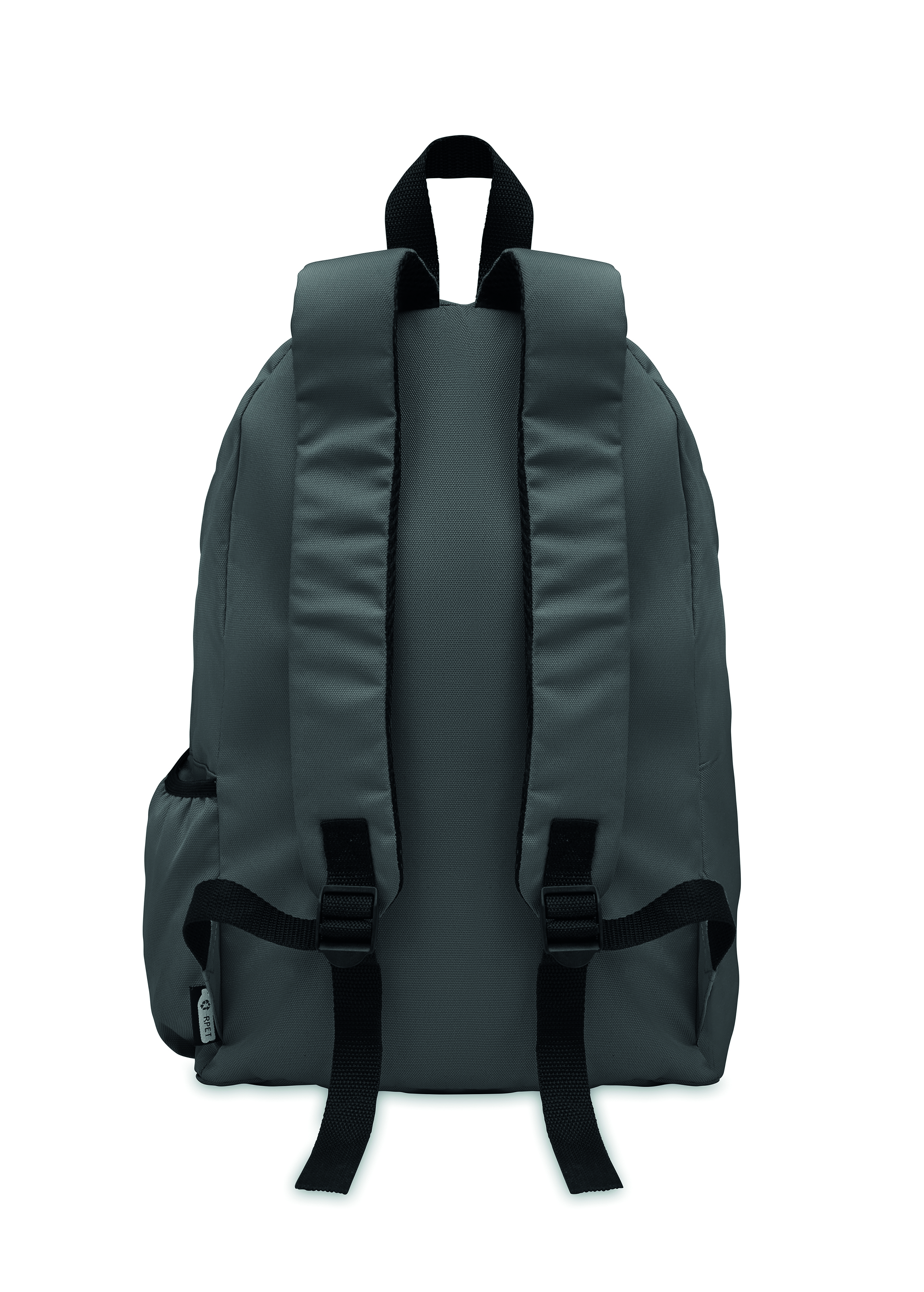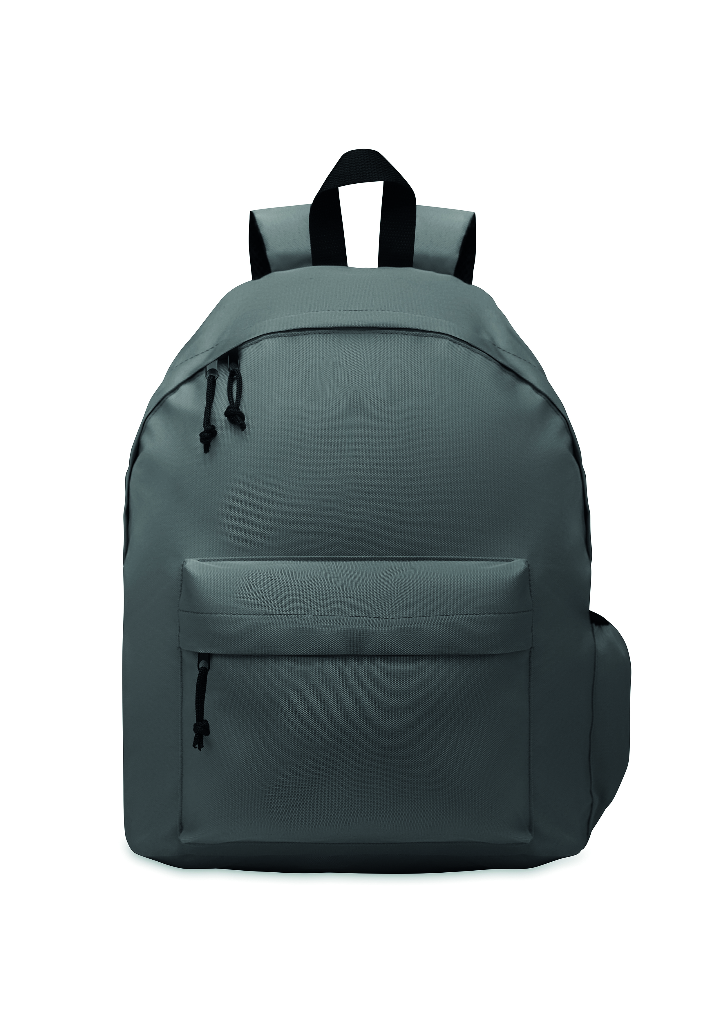 Plecak z poliestru 600D RPET z zewnętrzną kieszenią na zamek. Wyściełany tył i boczna przegródka na butelkę.