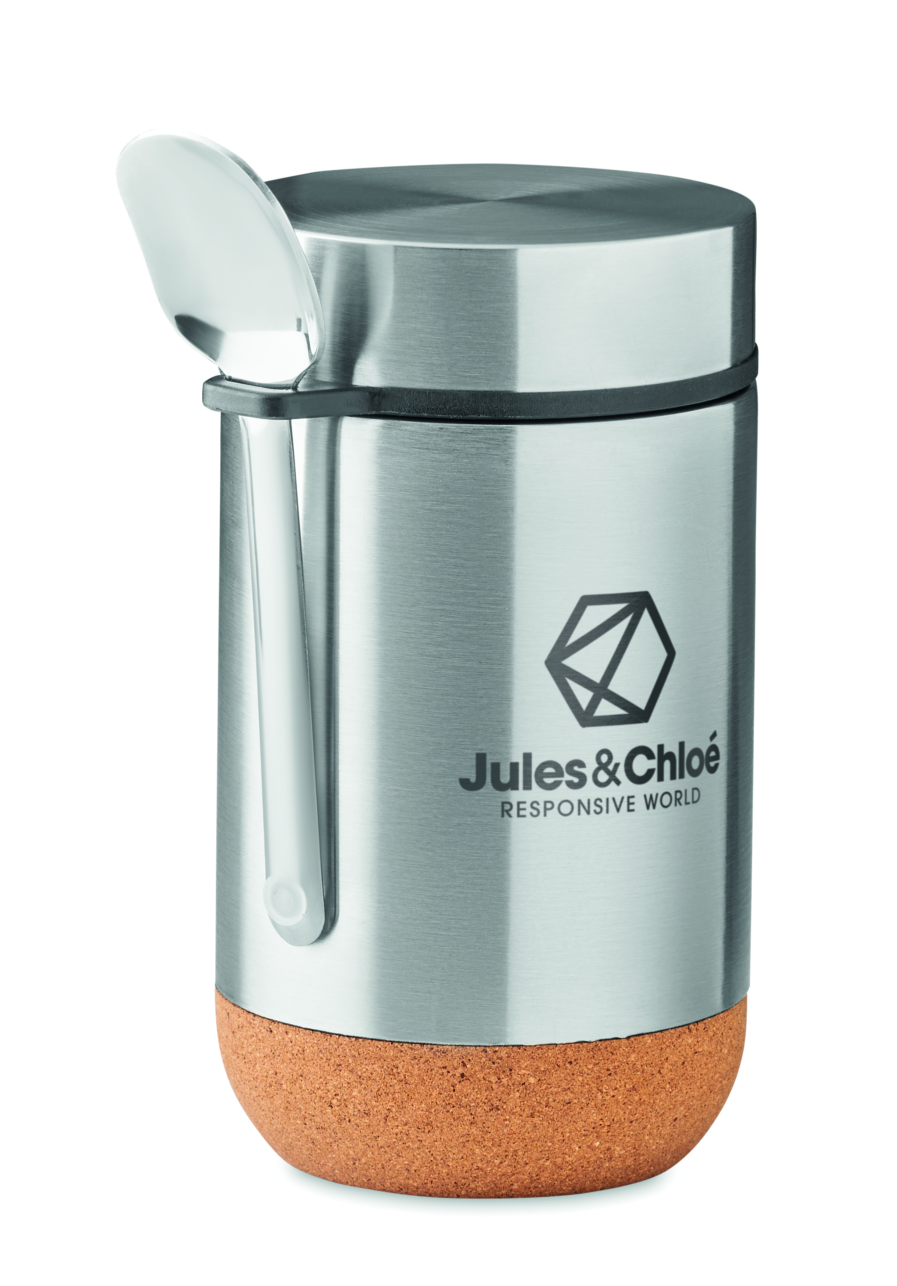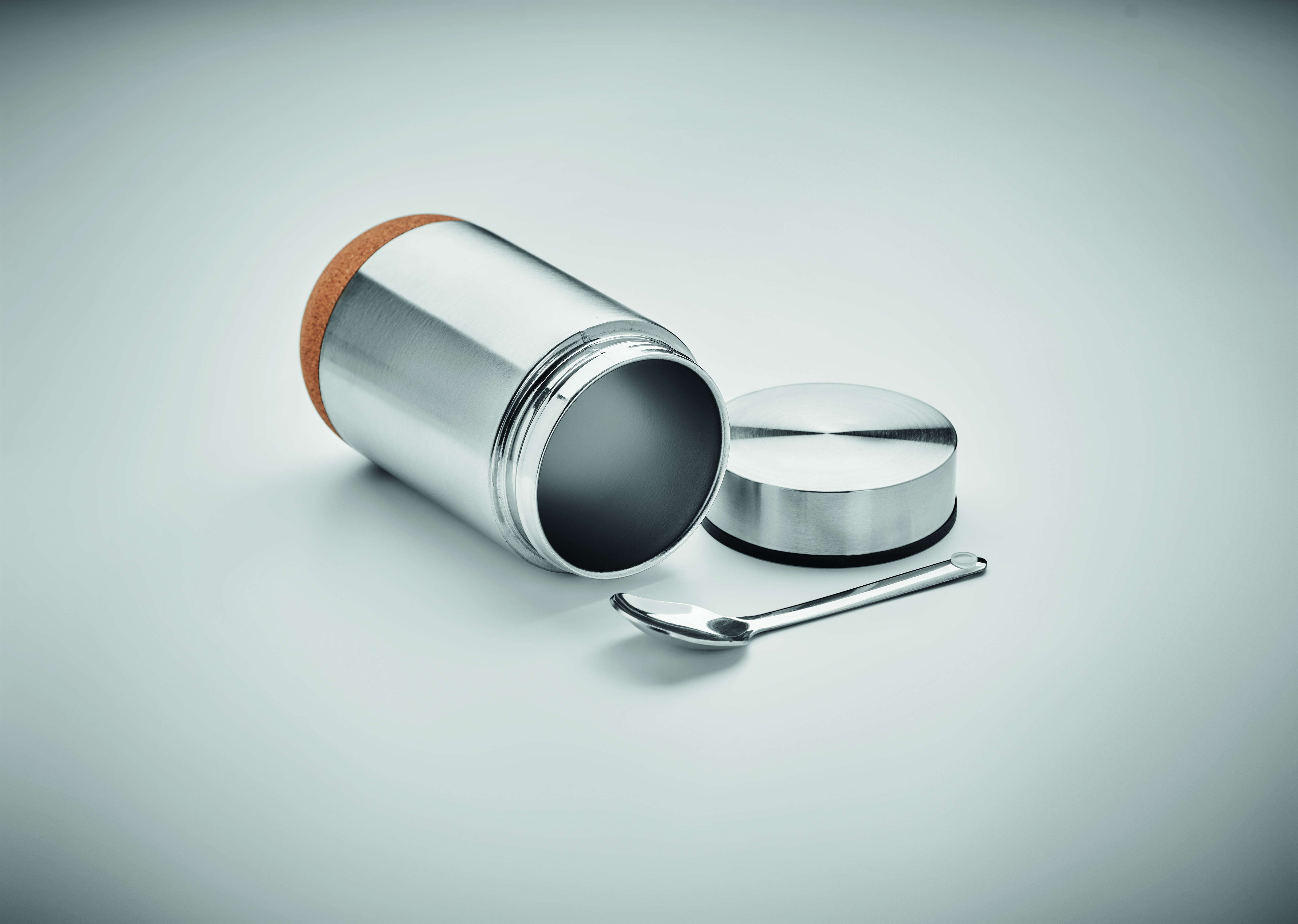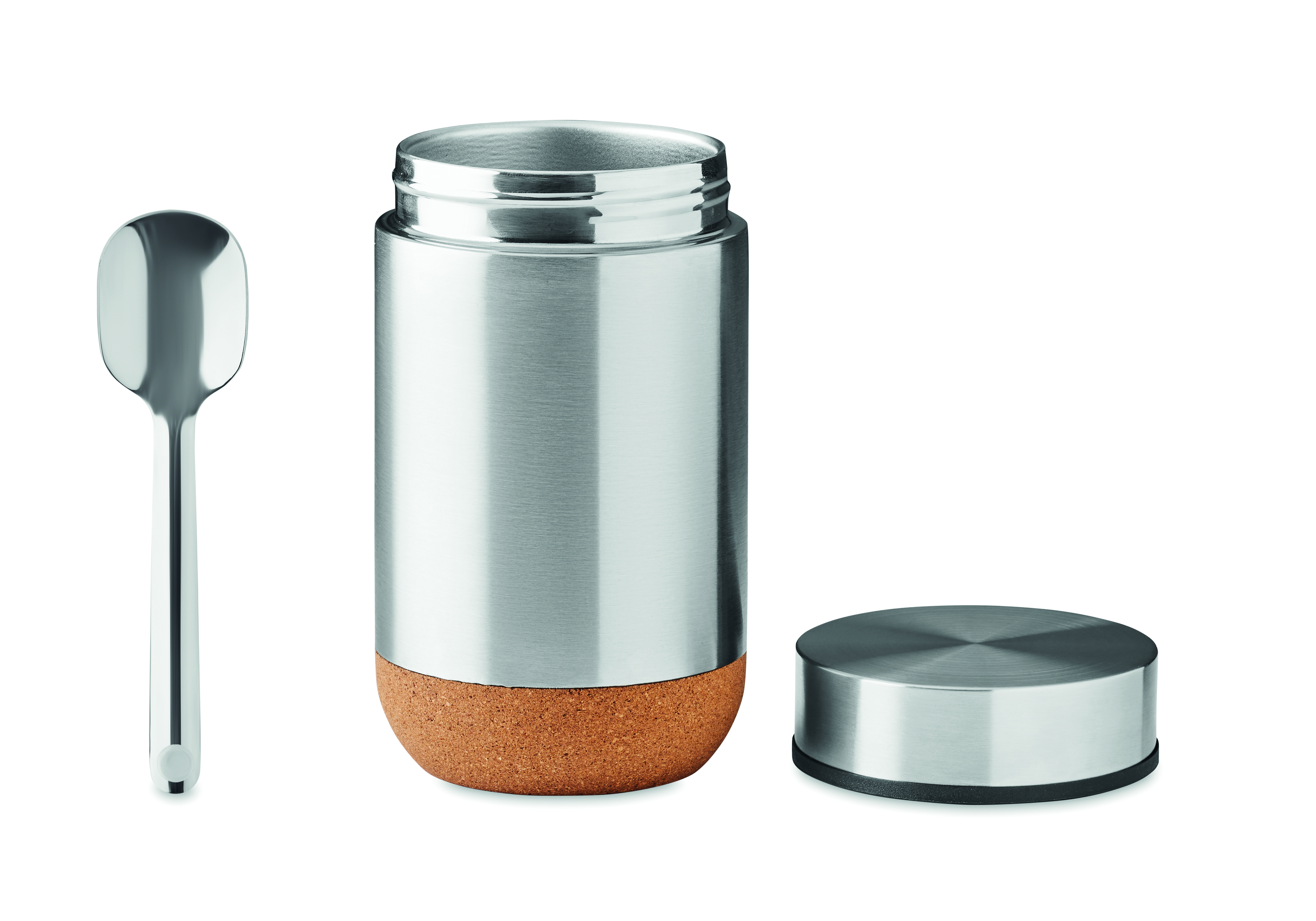 Wykonany ze stali nierdzewnej izolowany, dwuścienny pojemnik do przechowywania z zakręcanym wieczkiem i z korkowym elementem u podstawy. Zawiera łyżkę. Pojemność: 400ml. Korek jest materiałem w 100% naturalnym. Ze względu na jego strukturę i porowatość powierzchni ostateczny wygląd nadruku na każdym artykule może się różnić.