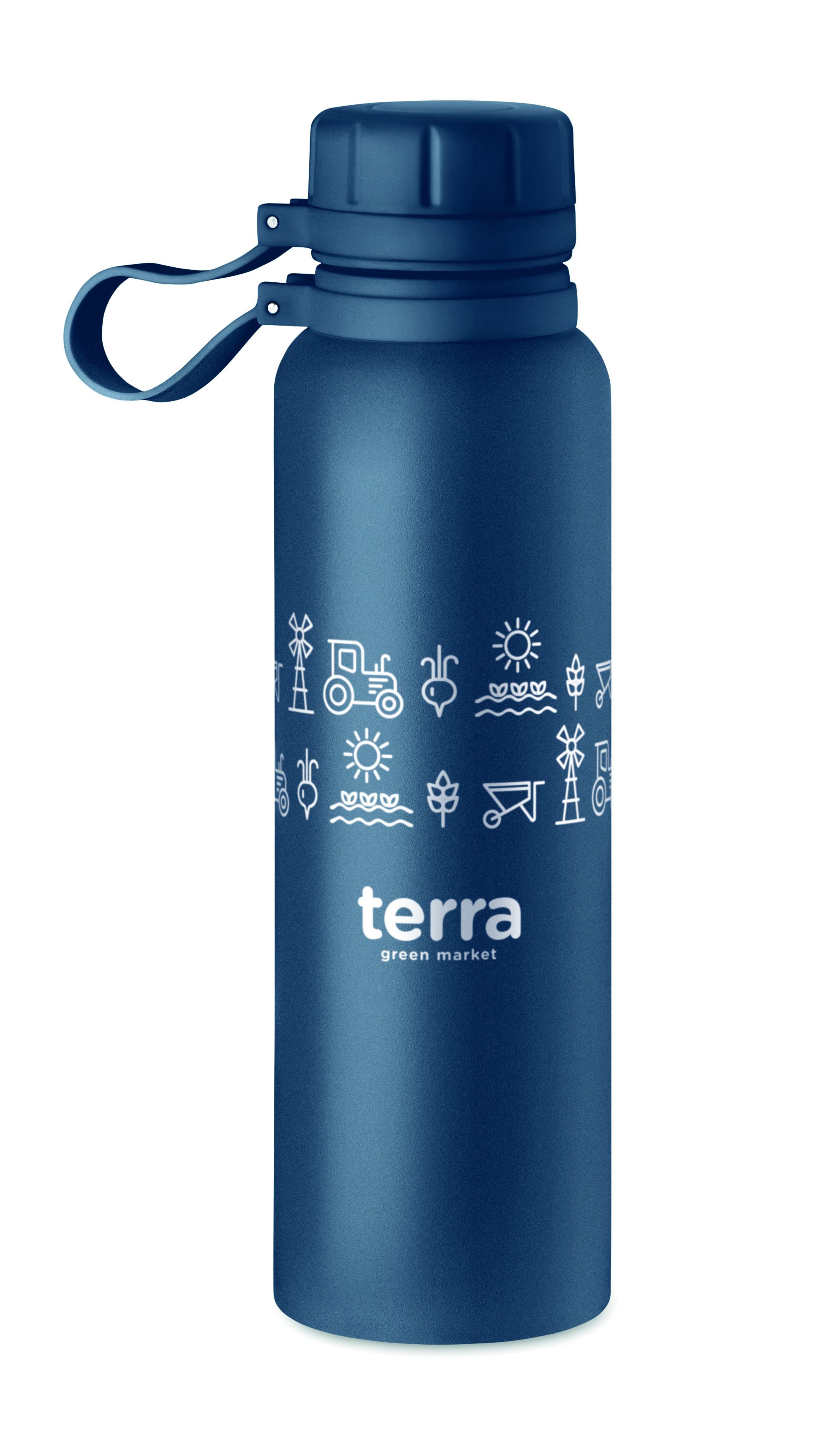 Dwuścienna butelka ze stali nierdzewnej izolowana próżniowo z zakrętką i silikonowym uchwytem. Pojemność: 780 ml.