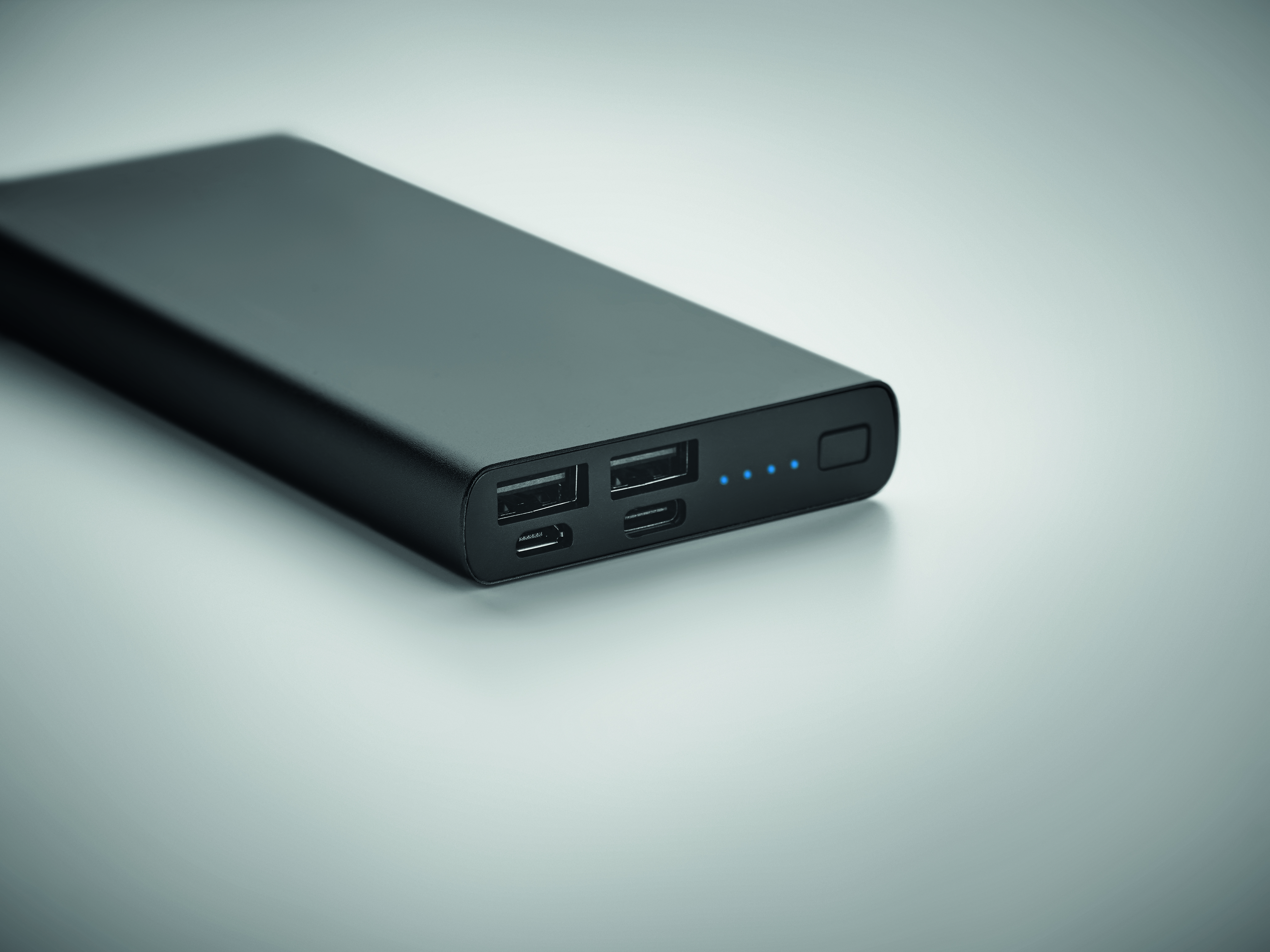 Power bank 10000 mAh z aluminium pochodzącego z recyklingu. Pojemność do smartfonów, prąd wyjściowy DC5V/1A i DC5V/2A. Zawiera lampkę kontrolną i kabel USB z wtyczką micro USB. Obsługuje technologię szybkiego ładowania (18 W). Wejście/wyjście: Typ-C. Obsługa Power Delivery (PD) do ładowania najnowszego laptopa MacPro®.