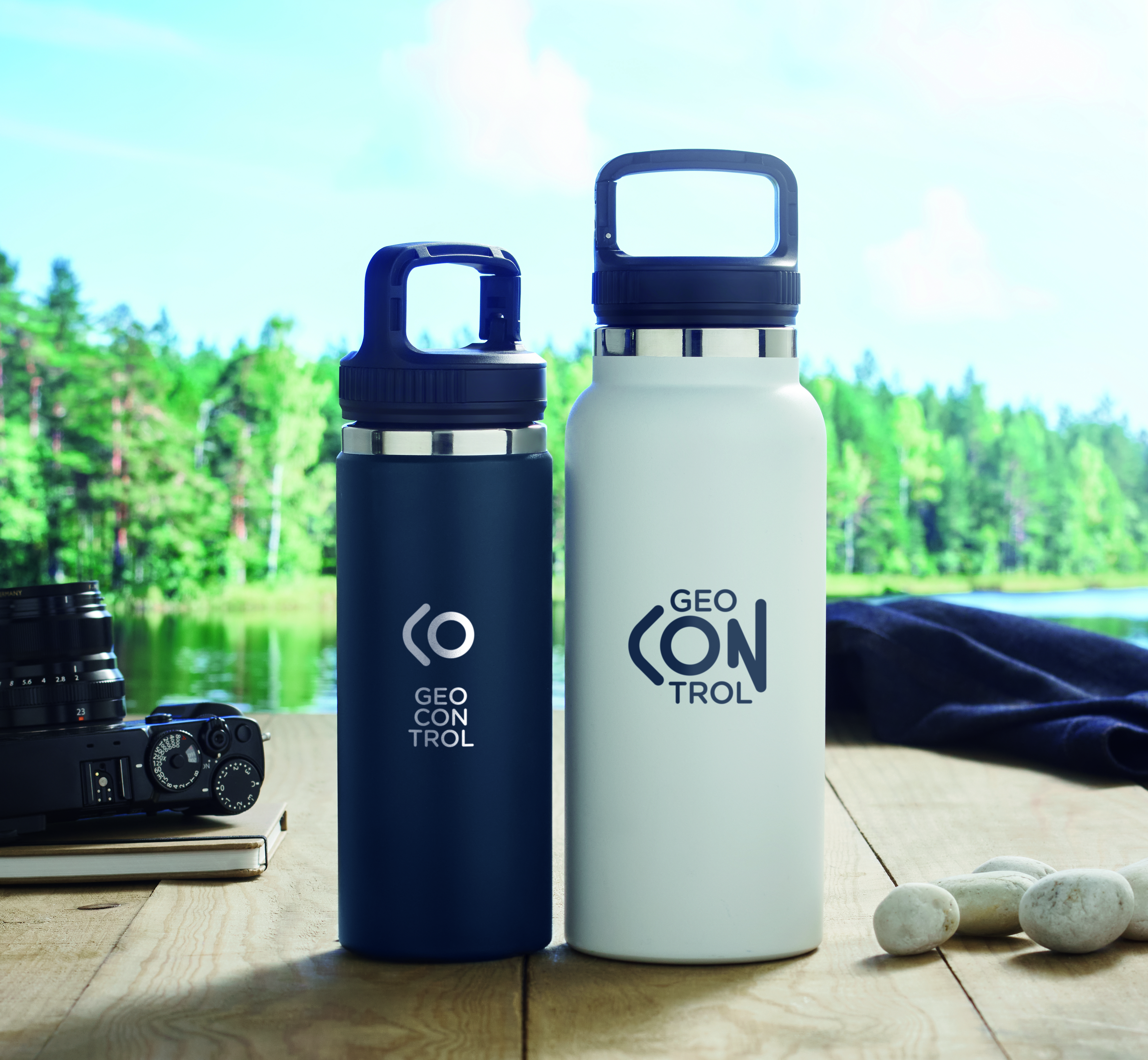 Dwuścienna butelka ze stali nierdzewnej, izolowana próżniowo z uchwytem. Pojemność: 970 ml.