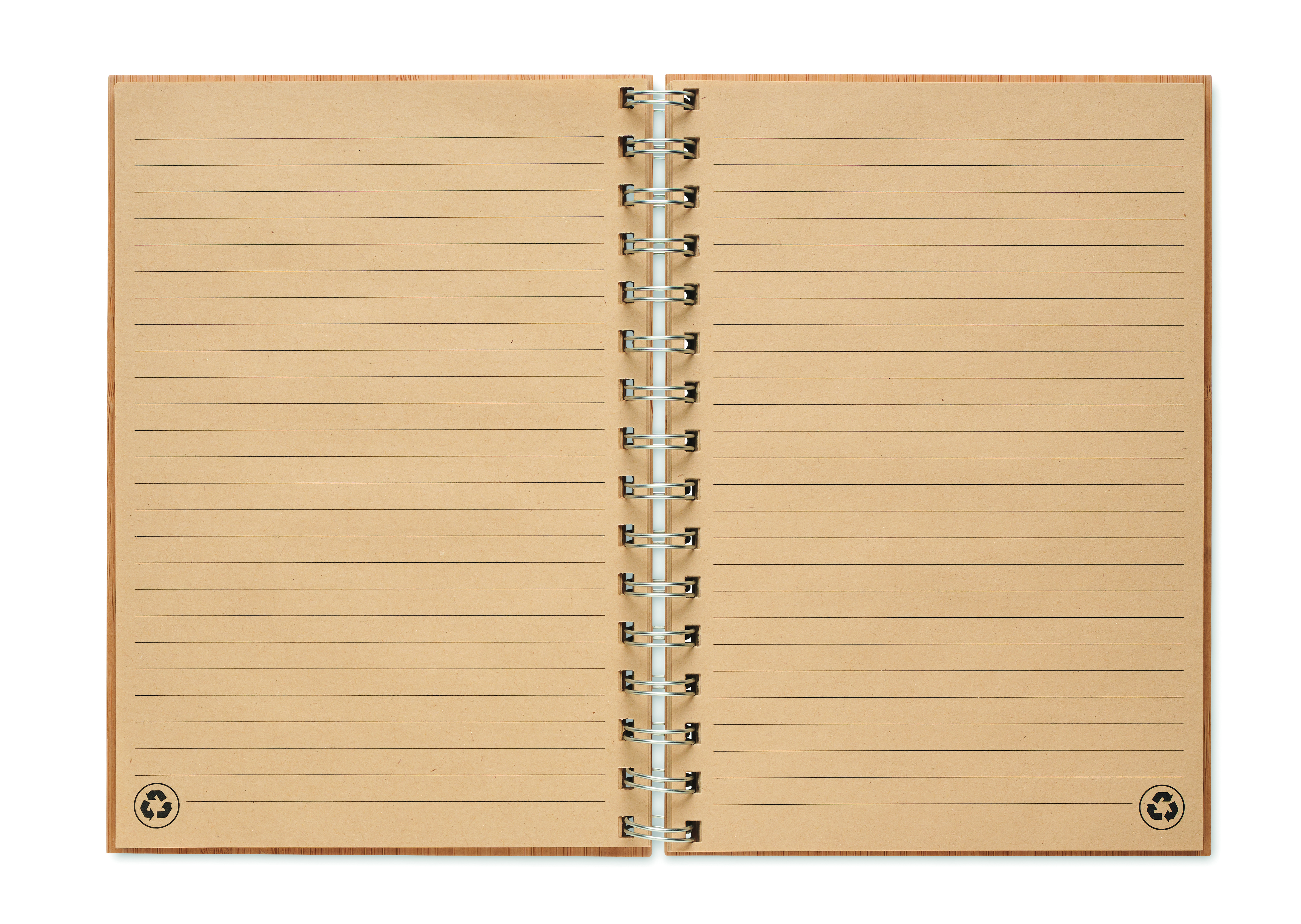 Notatnik, notes w bambusowej okładce, na podwójnej spirali. 140 stron w linie z papieru kraft (70 kartek). Bambus jest produktem naturalnym, dlatego mogą wystąpić nieznaczne różnice w kolorze, wzorze i rozmiarze.