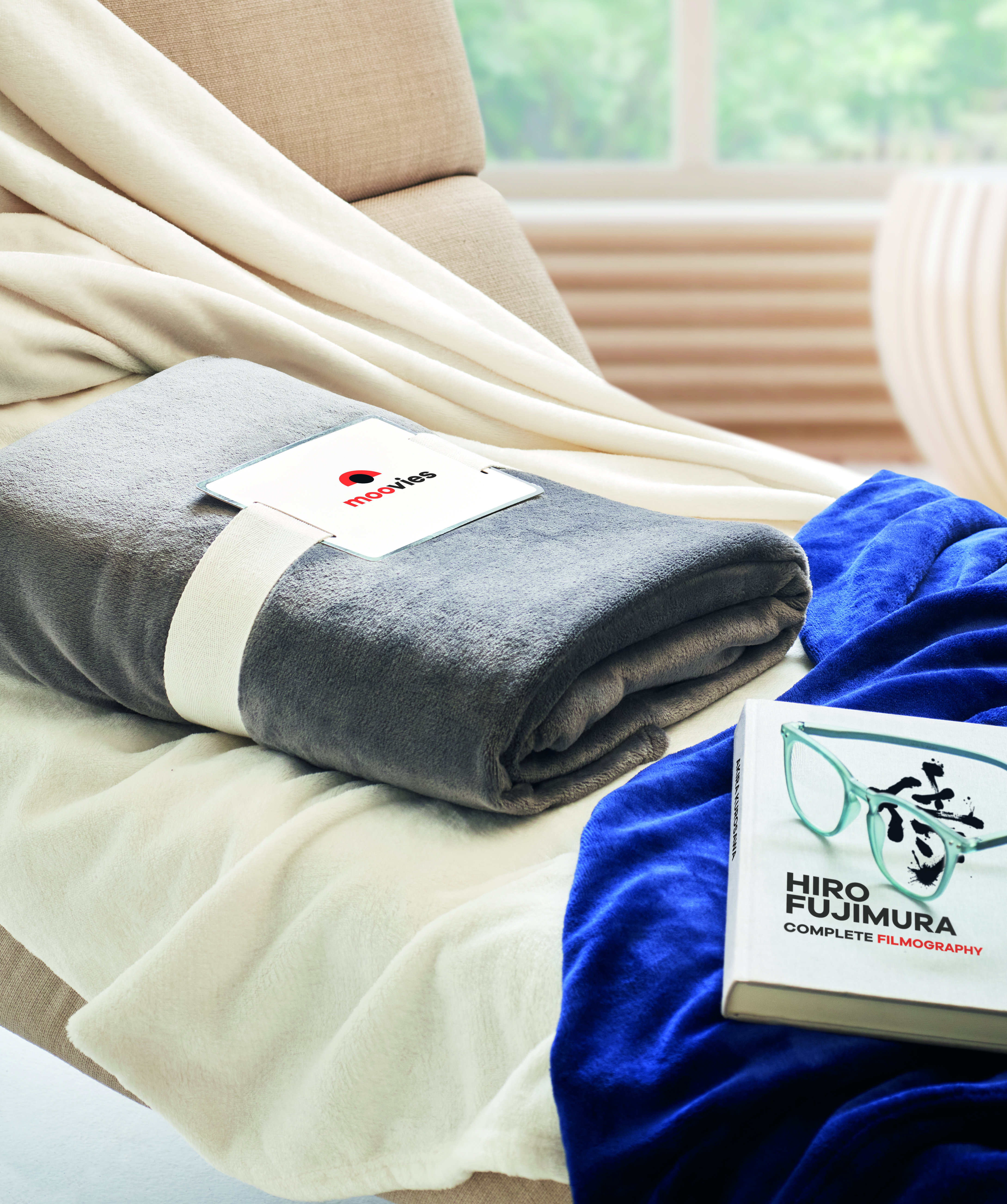 Koc z flaneli RPET 280 gr/m² ze wstążką i etykietą do nadruku.