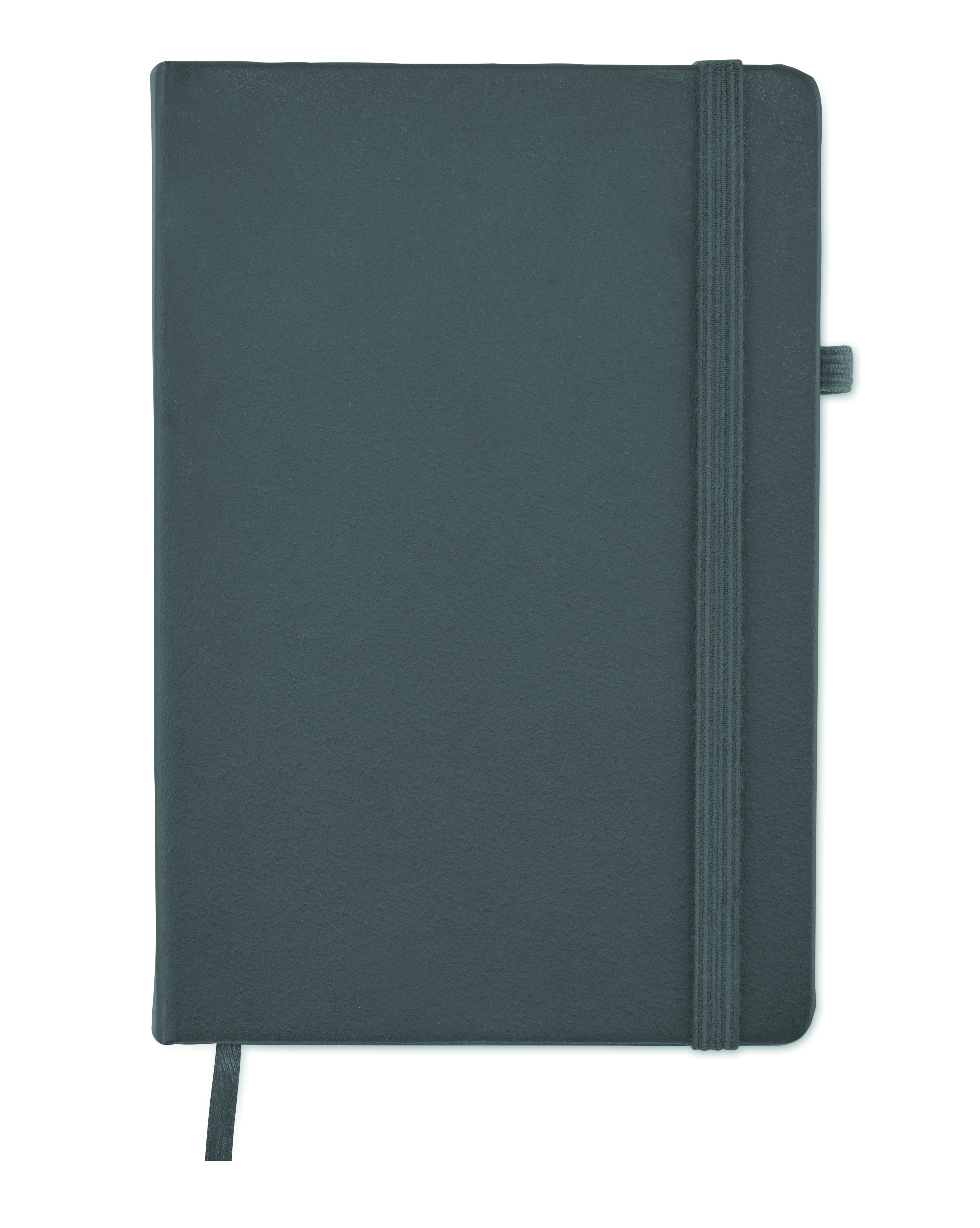 Notatnik A5 z okładką wykonaną w 70% ze skóry pochodzącej z recyklingu i w 30% z lateksowego PU. Obwoluta. 192 stron w linie na papierze z recyklingu (96 arkuszy). Dopasowany elastyczny bawełniany pasek i uchwyt na długopis.
