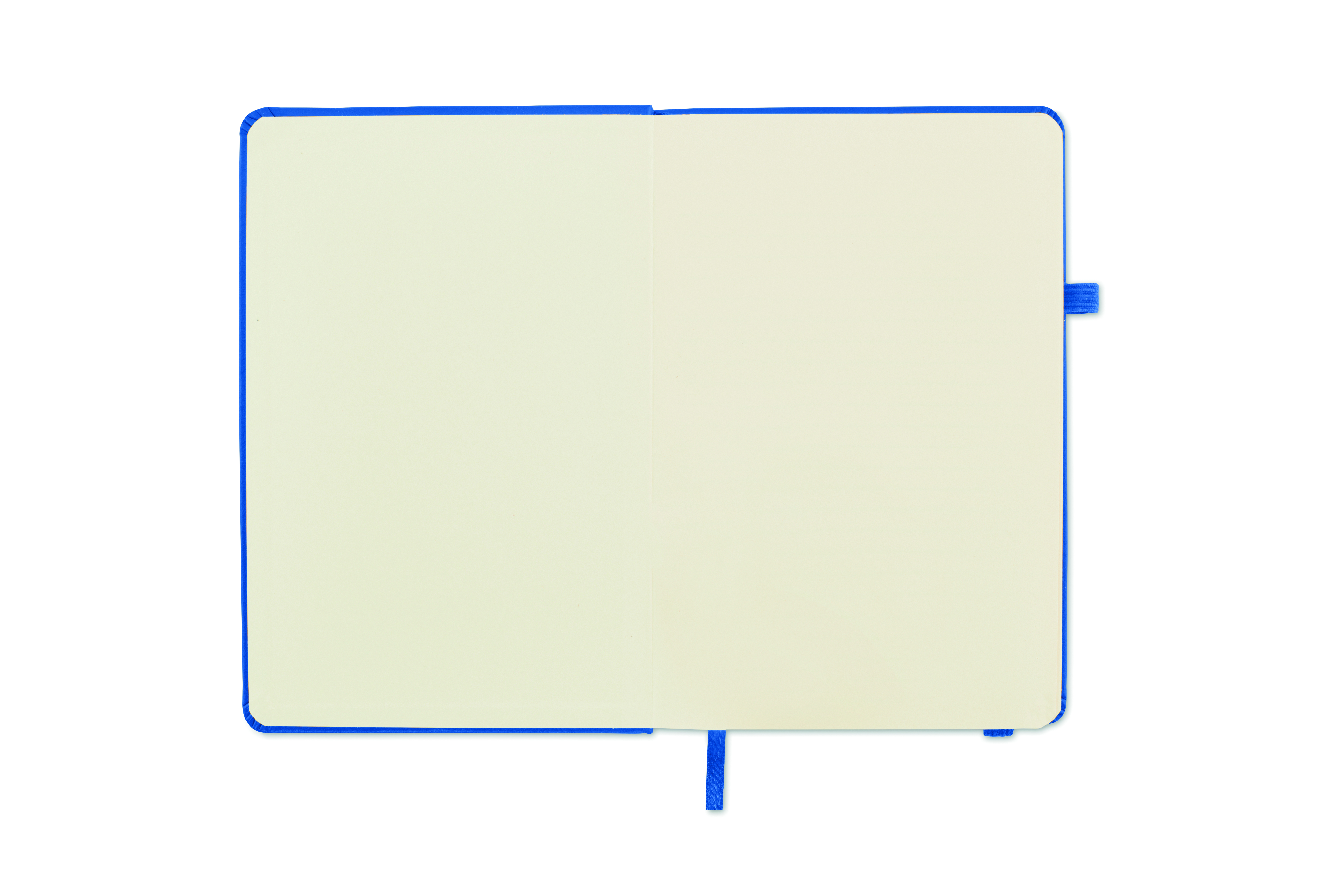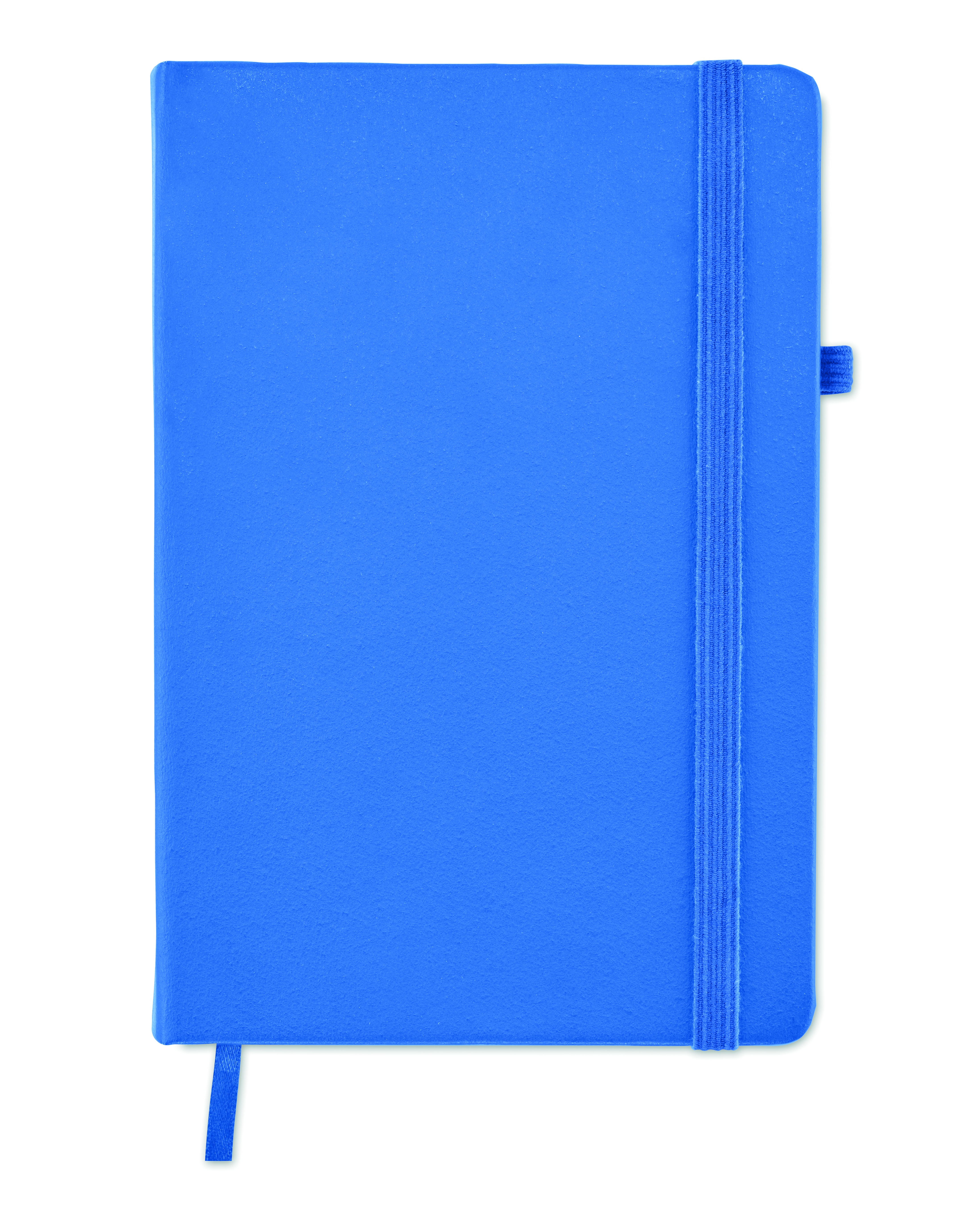 Notatnik A5 z okładką wykonaną w 70% ze skóry pochodzącej z recyklingu i w 30% z lateksowego PU. Obwoluta. 192 stron w linie na papierze z recyklingu (96 arkuszy). Dopasowany elastyczny bawełniany pasek i uchwyt na długopis.
