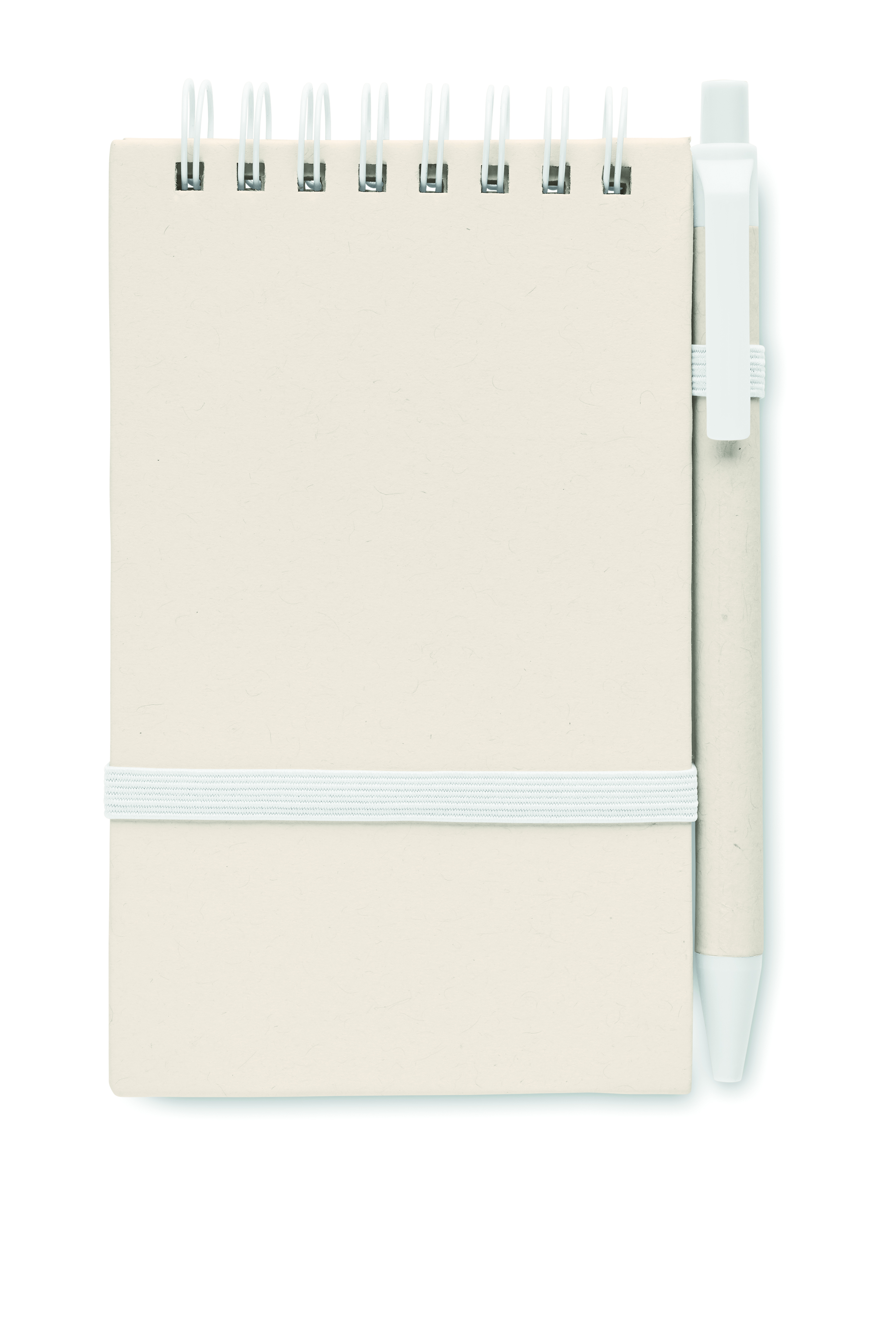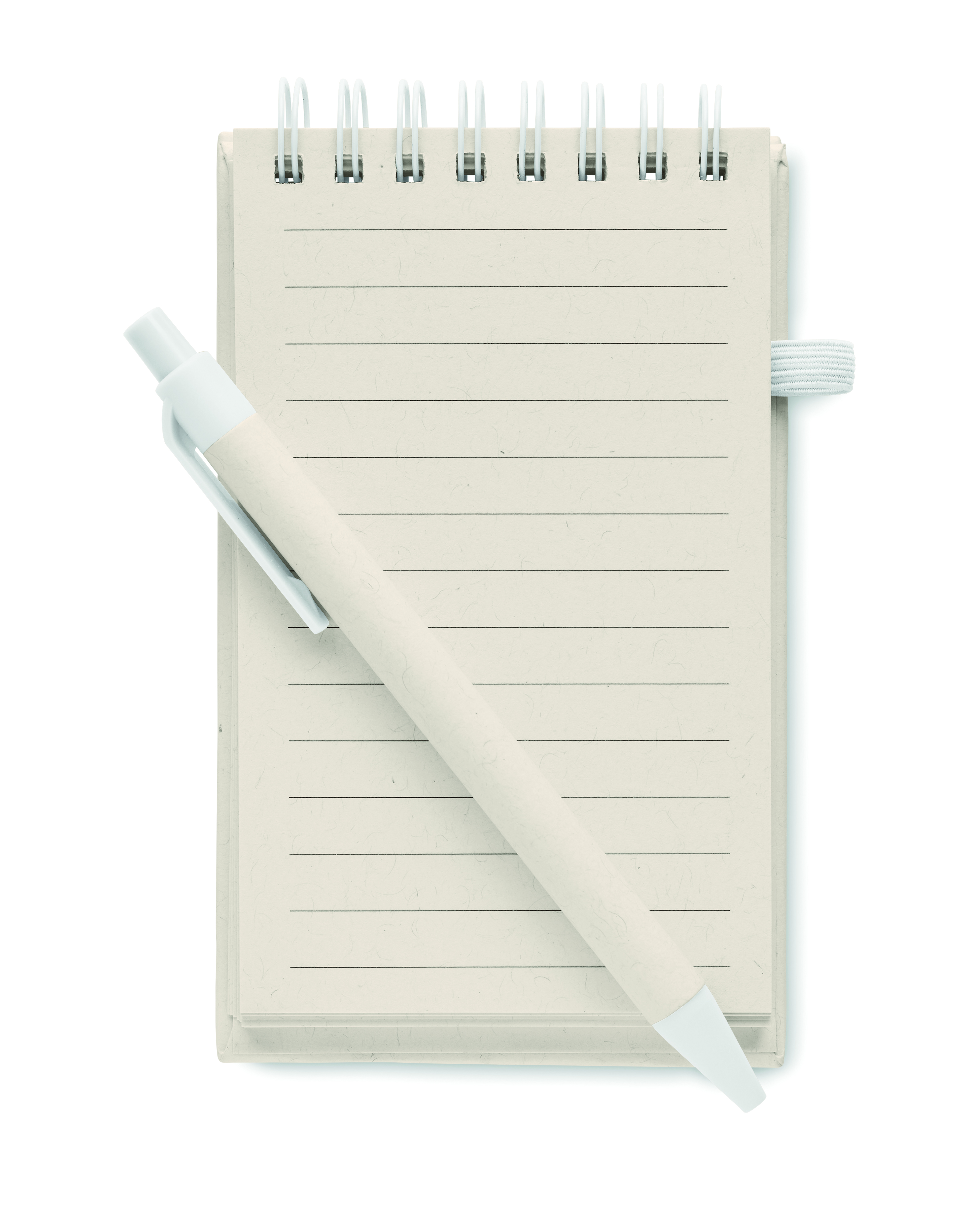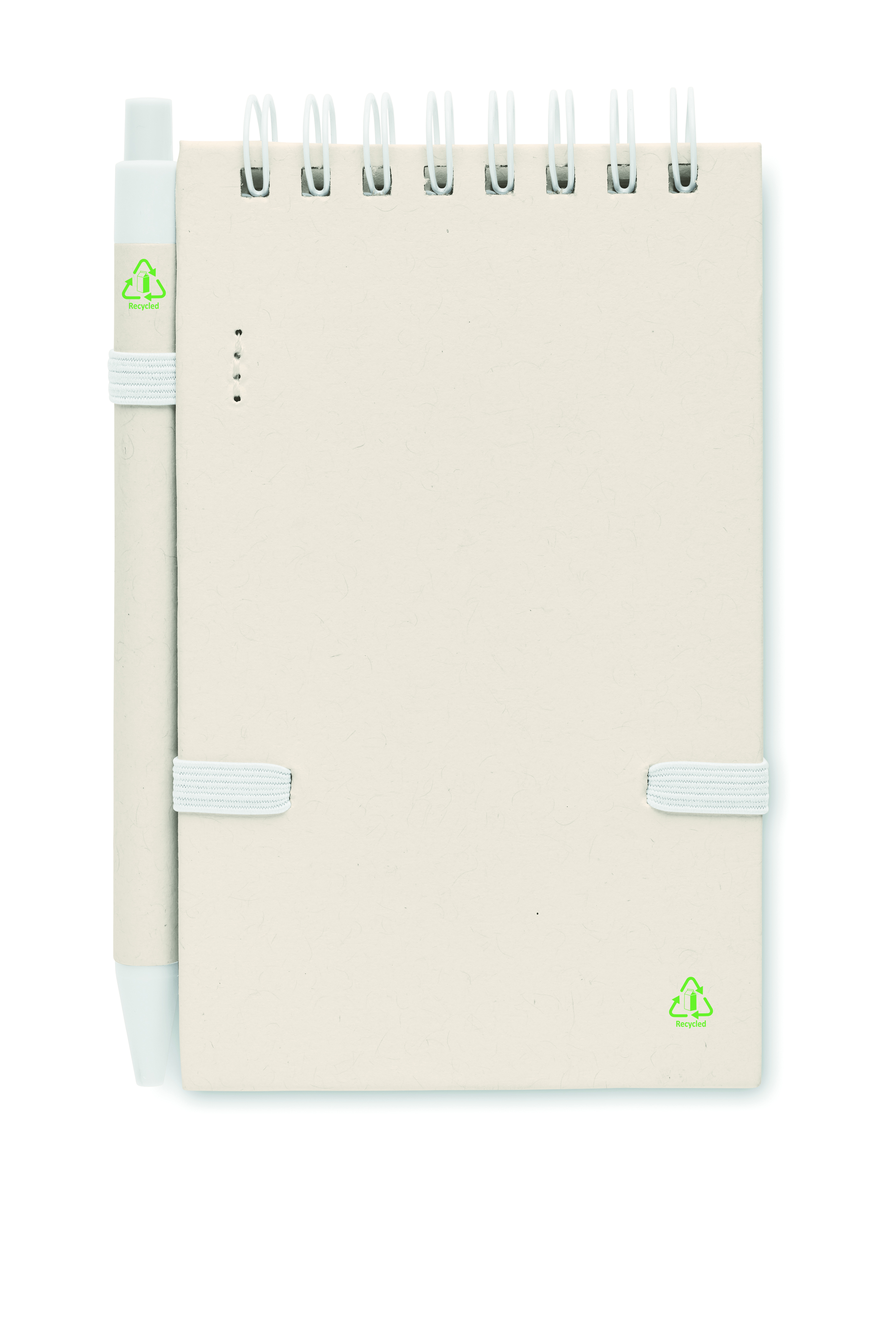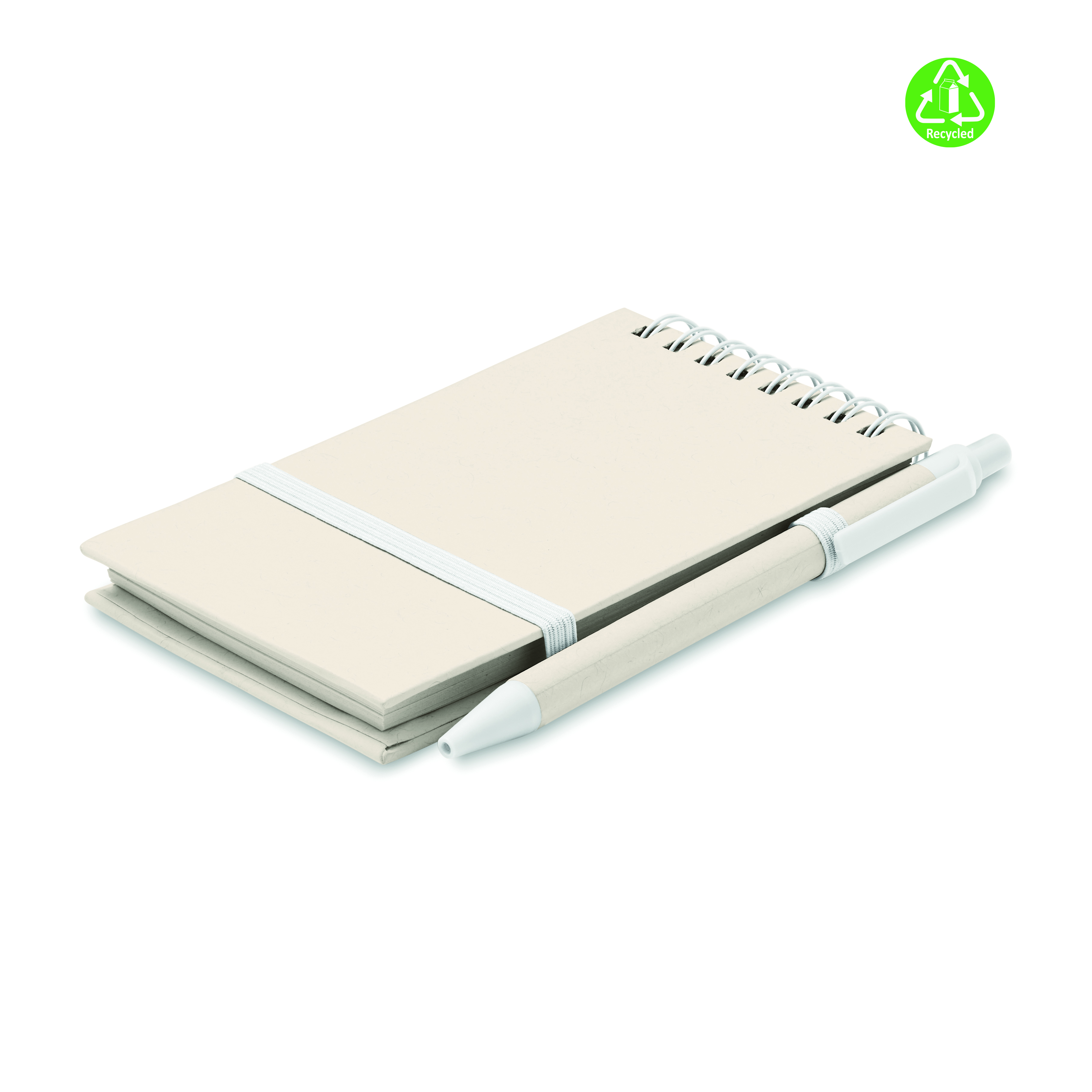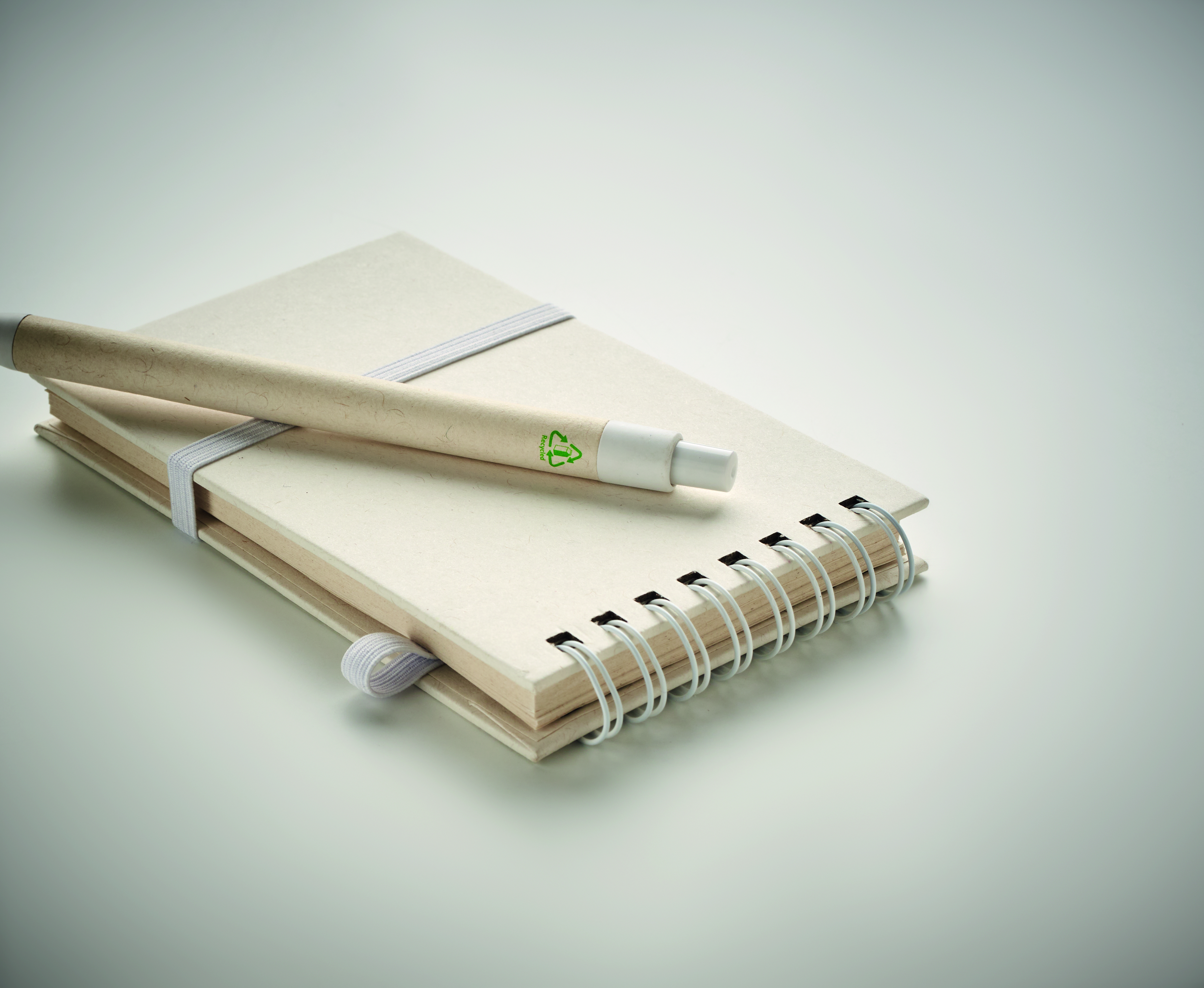 Zeszyt A6 70 kartek (w 70% z kartonów po mleku z recyklingu i w 30% z papieru z recyklingu). Pasujący długopis z przyciskiem. Niebieski tusz. Opaska zamykająca i uchwyt na długopis z gumki.