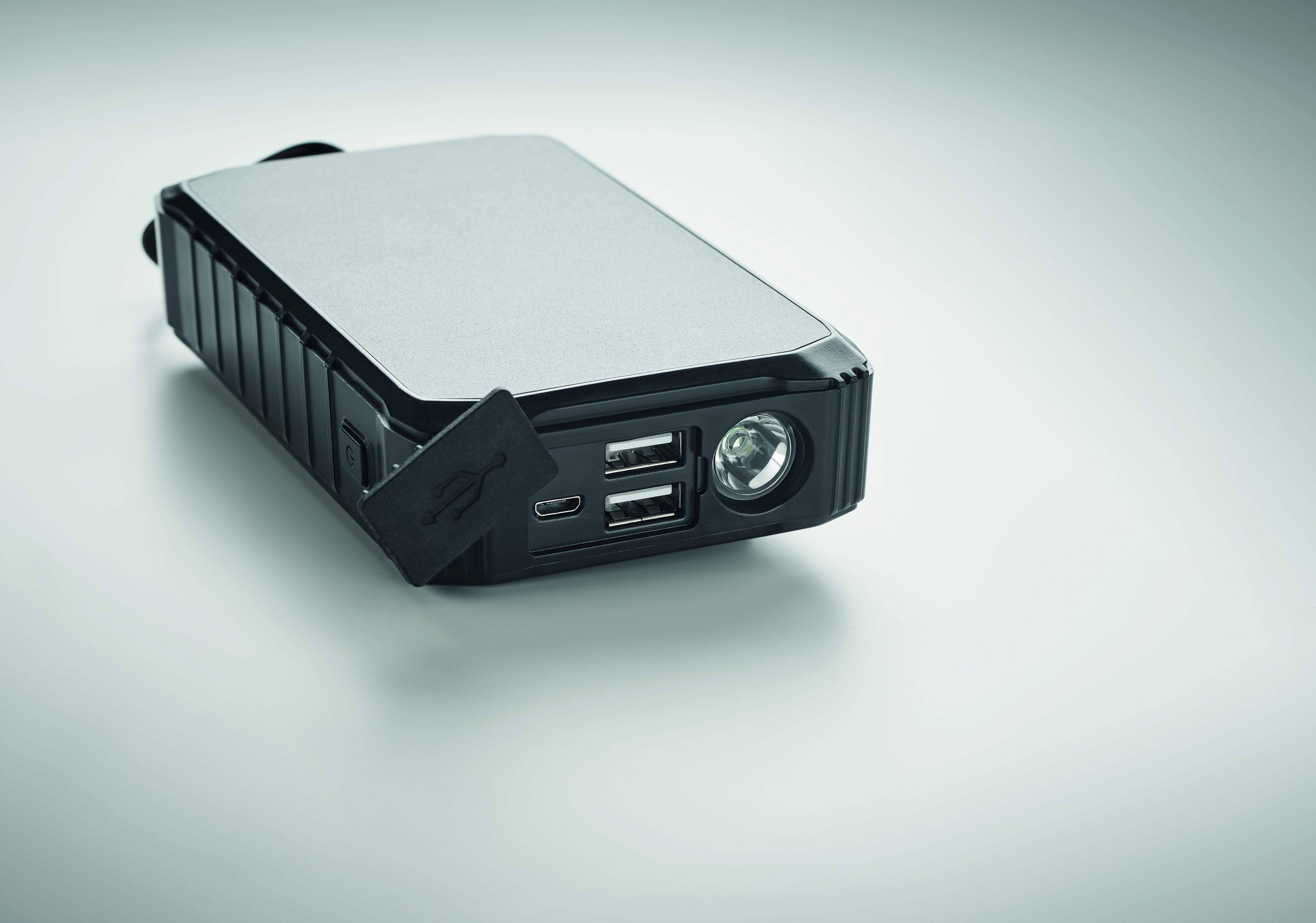 Solarny power bank 8000 mAh z dynamem na korbkę. W zestawie 1 lampka LED o mocy 100 lumenów. Wejście/wyjście typu C, 2 wyjścia USB-A. Wyjście DC 5V/2.1A.