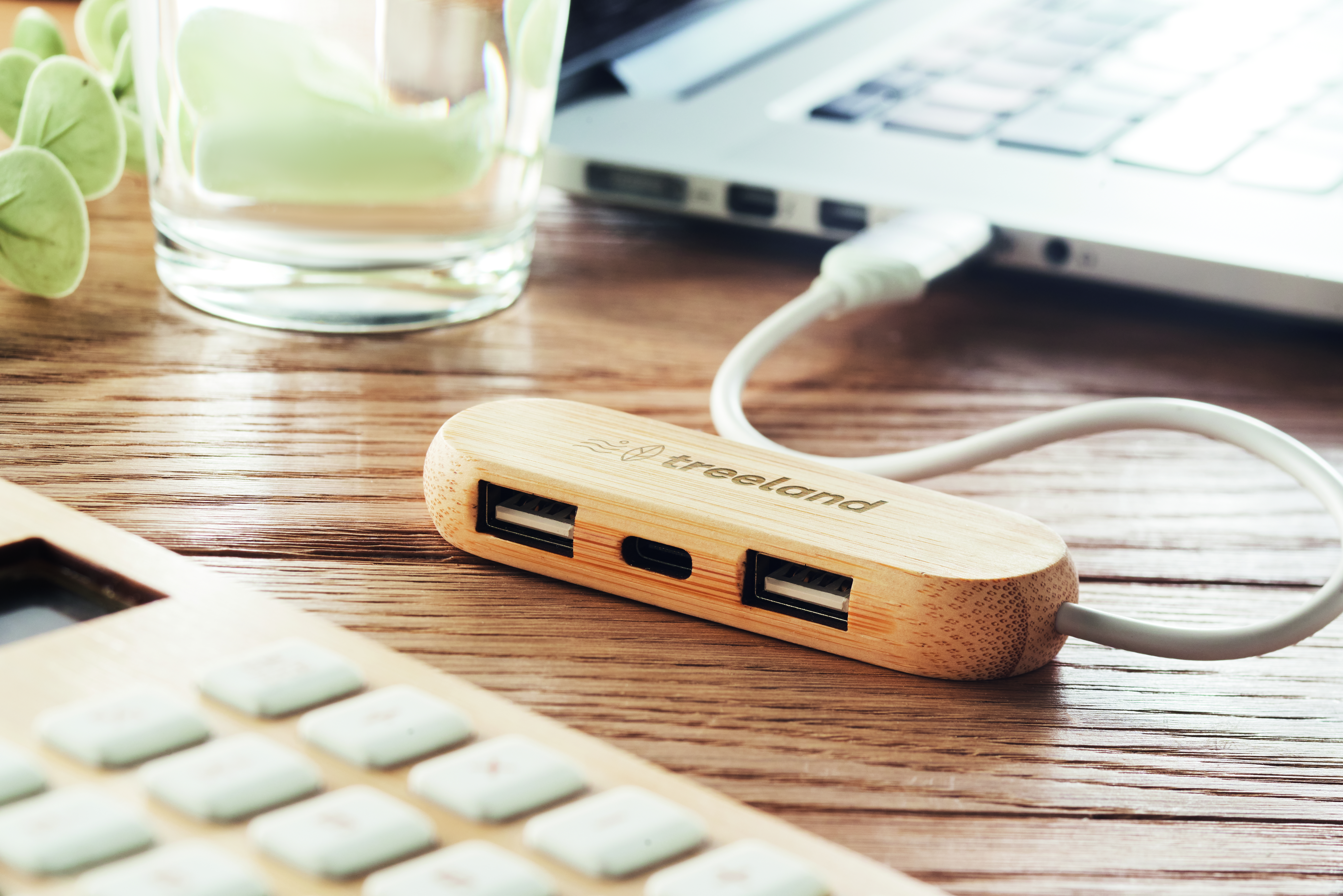 3 portowy 2.0 Typ-C USB hub w bambusowym etui. Długość kabla 24 cm. Bambus jest produktem naturalnym, dlatego mogą wystąpić nieznaczne różnice w kolorze, wzorze i rozmiarze.