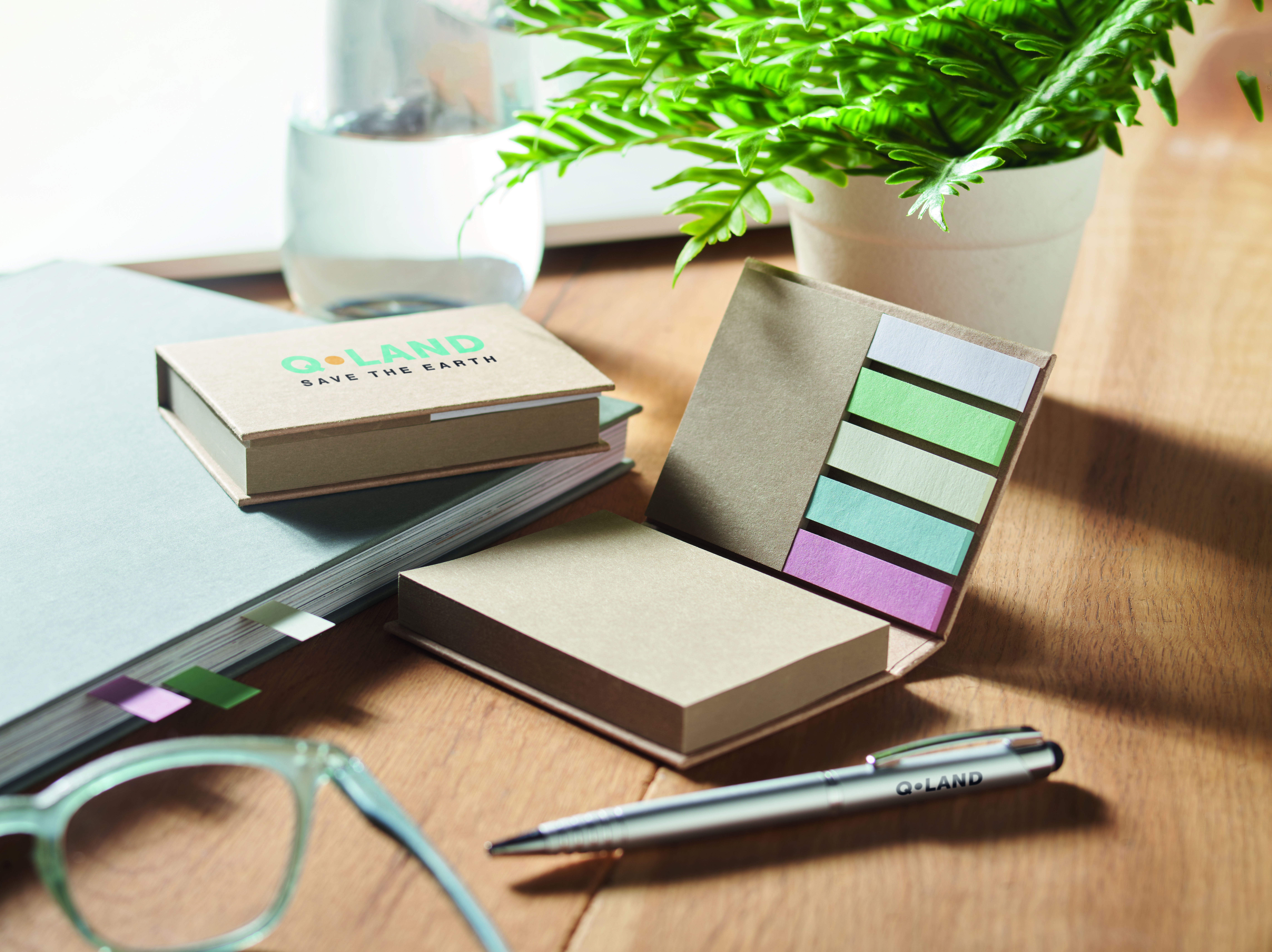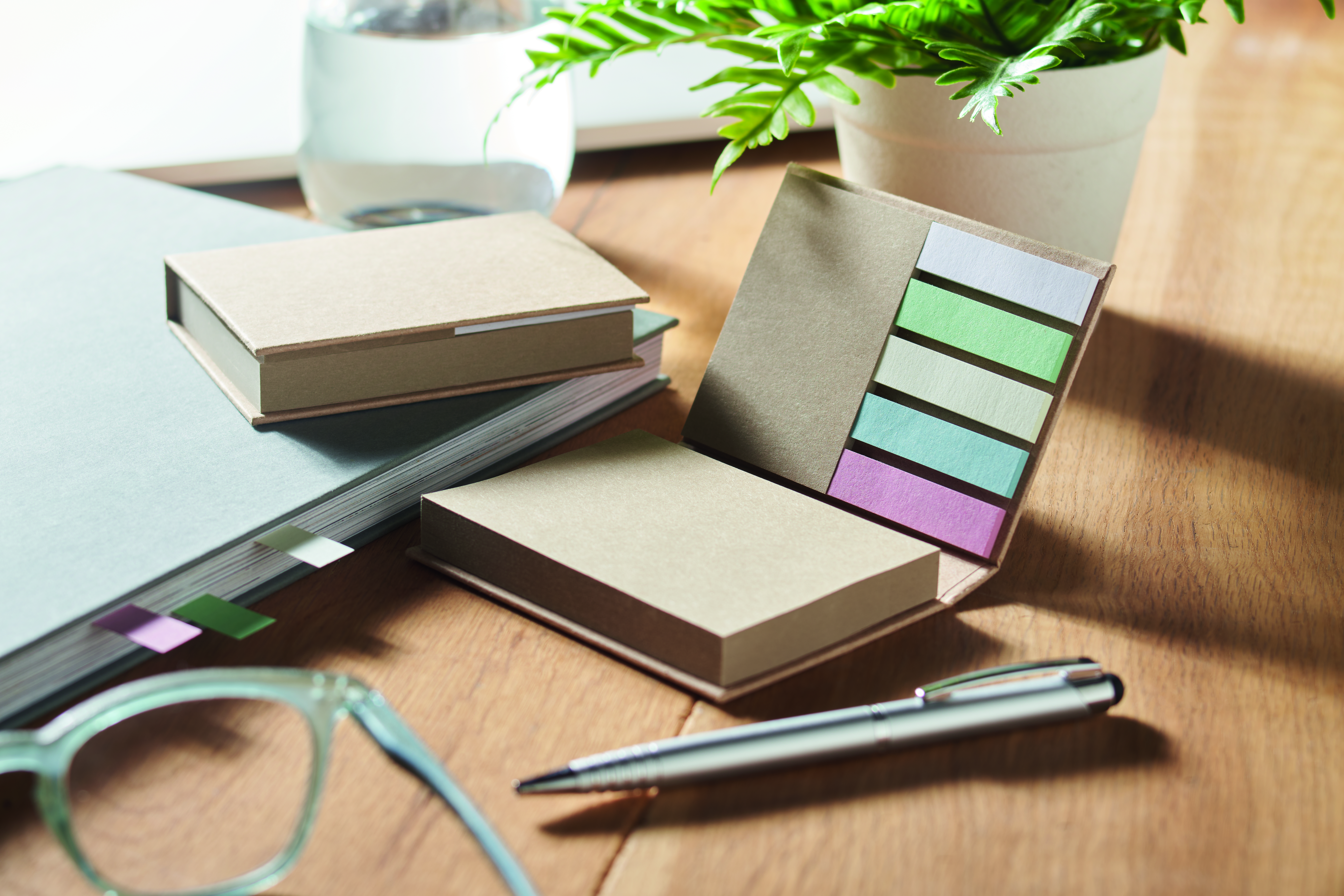 3-częściowy zestaw karteczek samoprzylepnych z papieru z recyklingu. Duże i średnie karteczki samoprzylepne oraz 5 znaczników w różnych kolorach. Made in EU.