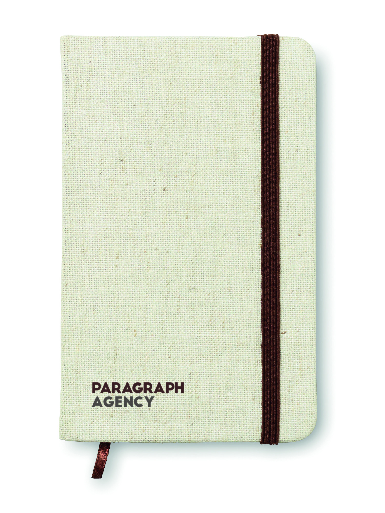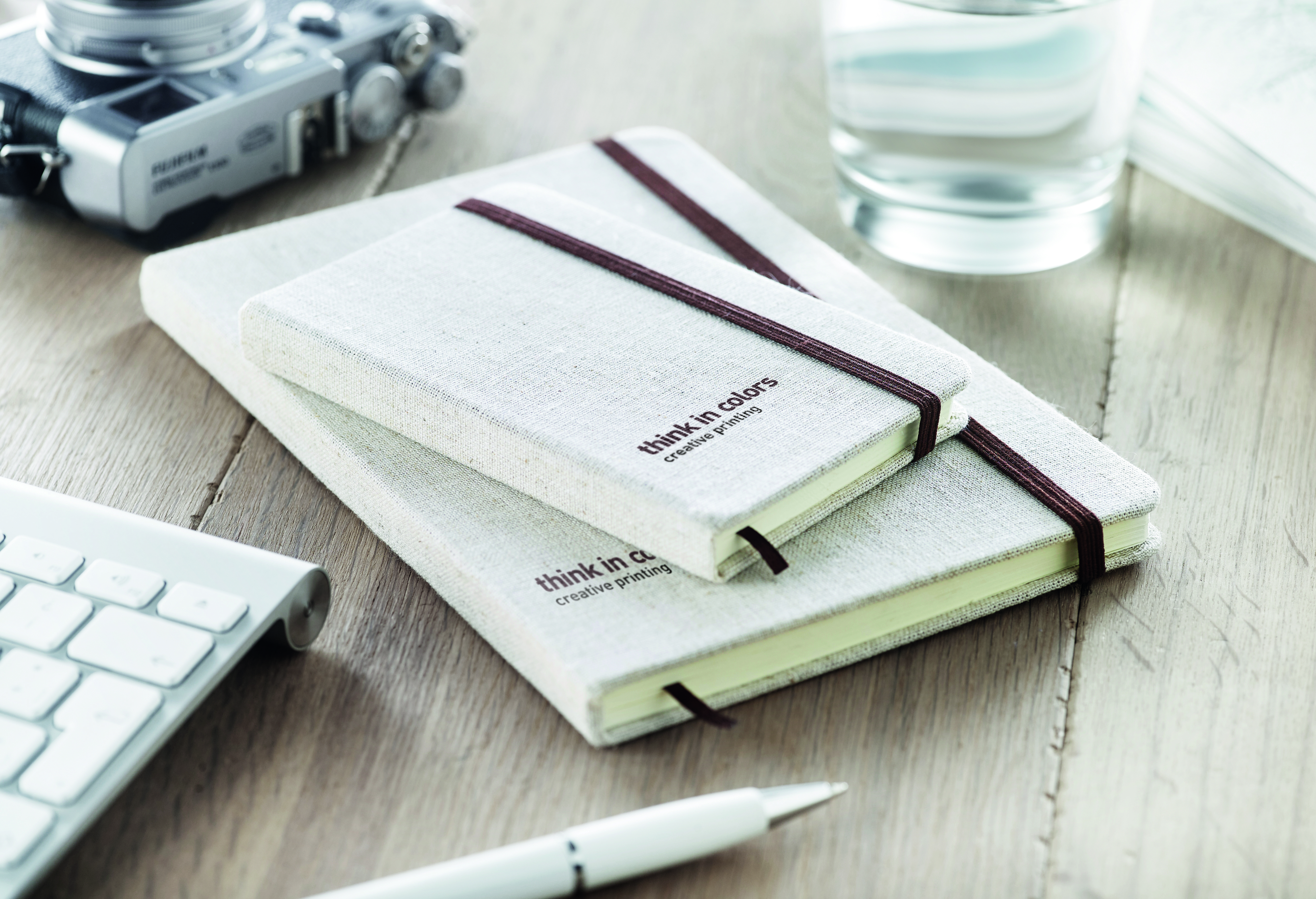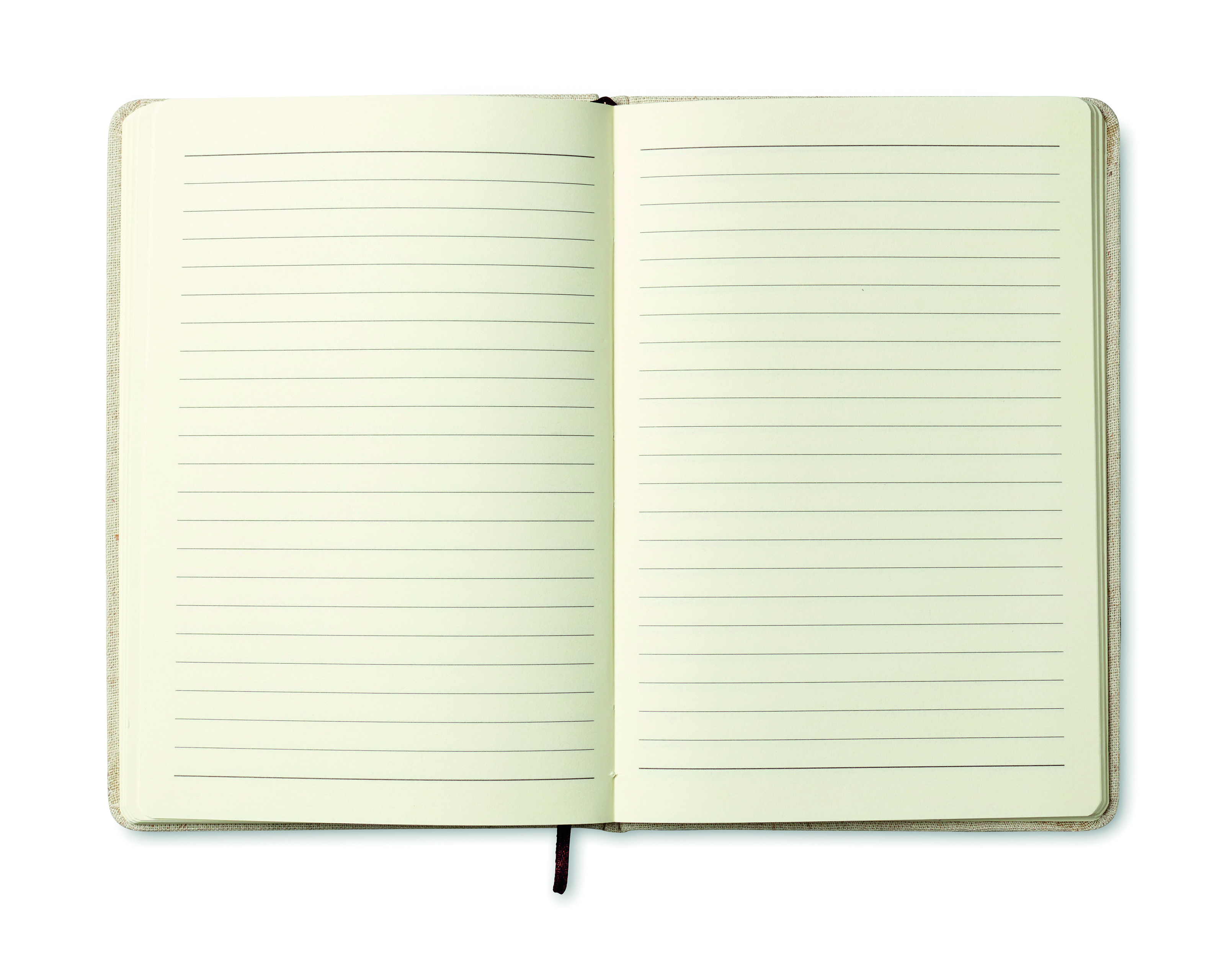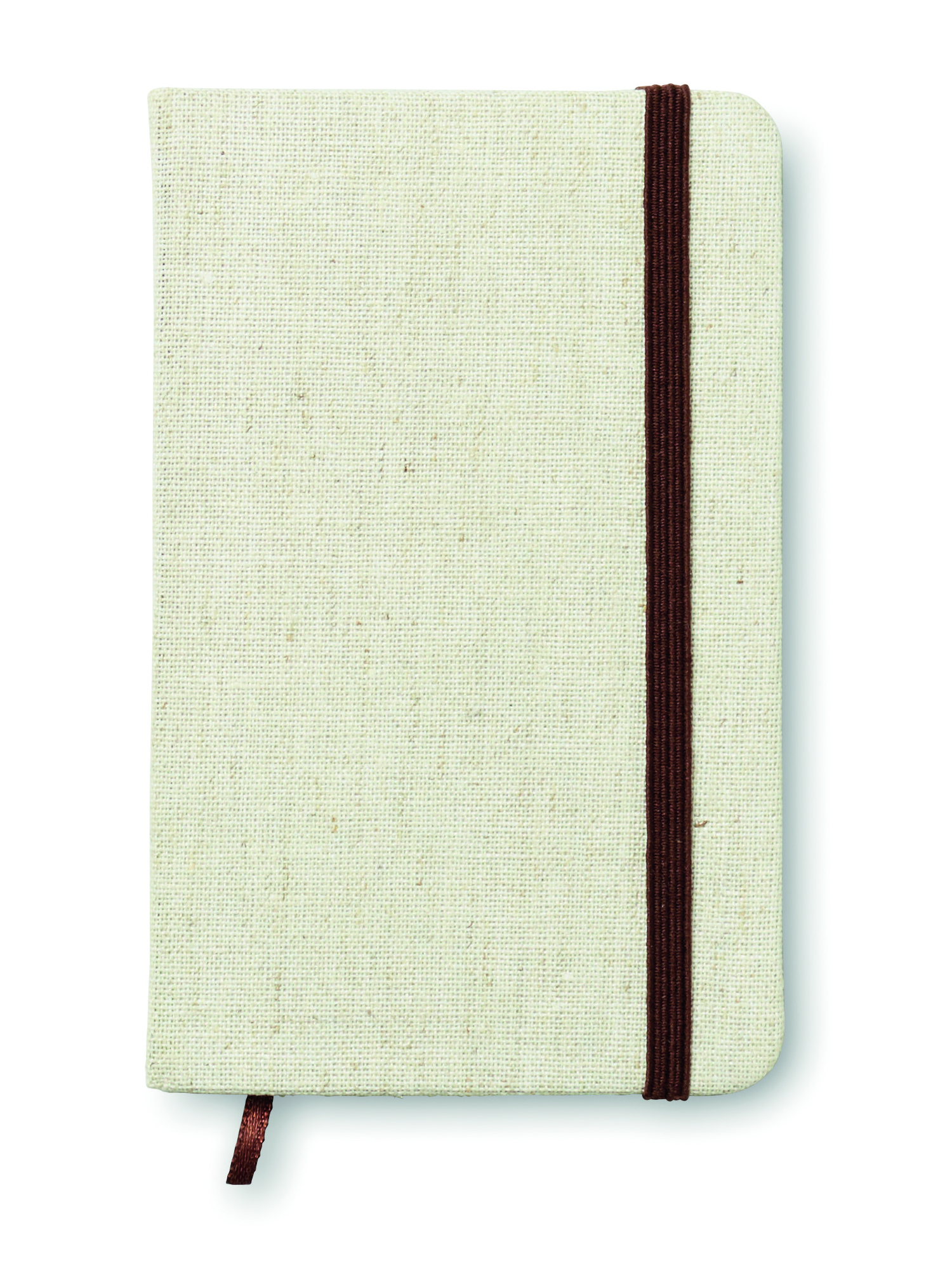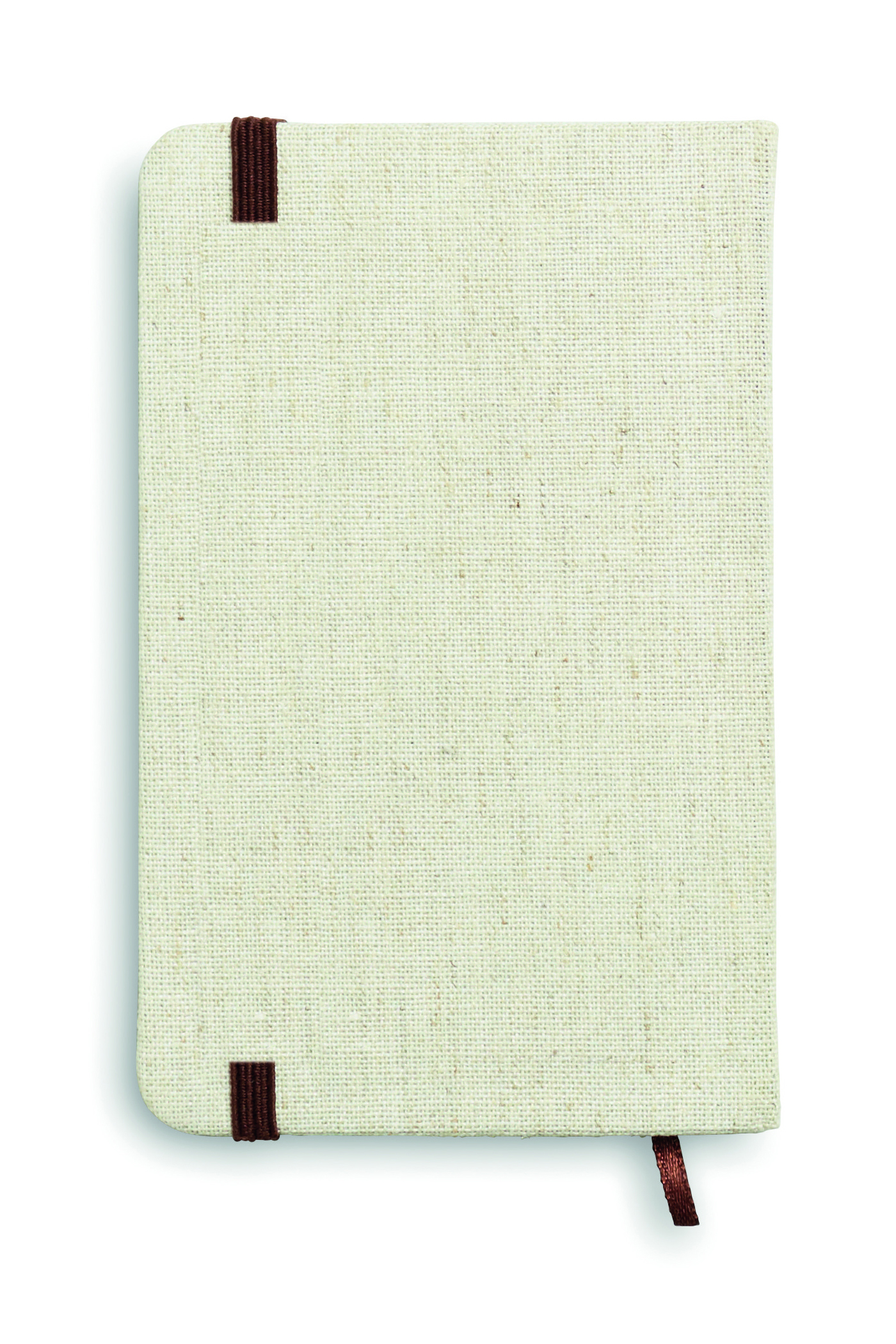 Notatnik A6 z twardą płócienną okładką. Oprawiony. 192 strony w linie z papieru z recyklingu (96 arkuszy). Kontrastowy elastyczny pasek i wstążka do oznaczania stron.