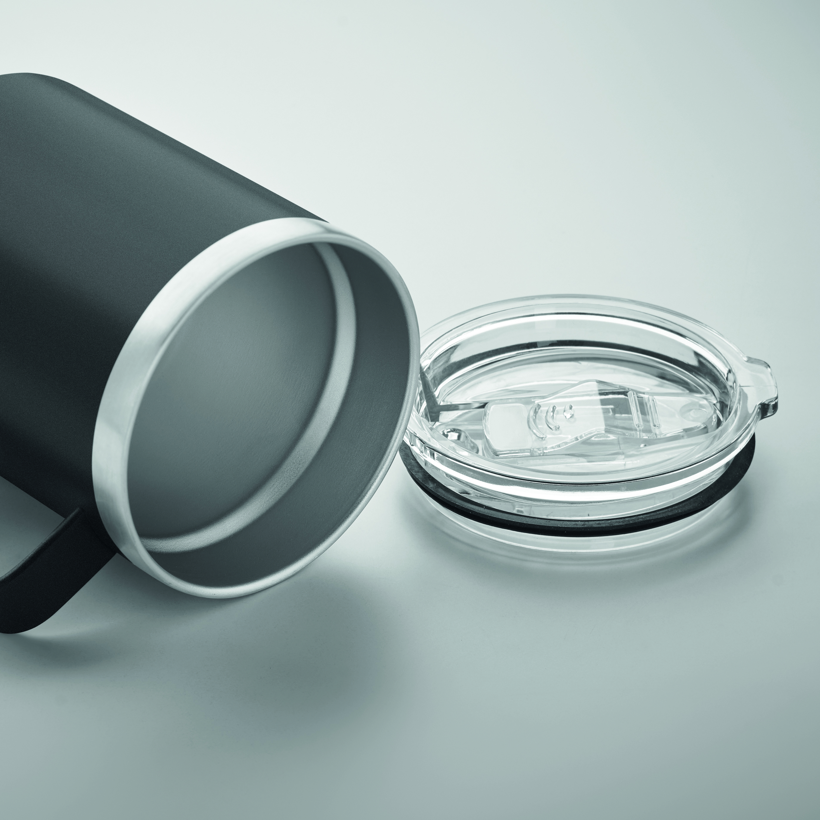 Dwuścienny kubek ze stali nierdzewnej z recyklingu (90% recyklingowanej stali nierdzewnej i 10% stali nierdzewnej) z pokrywką z zasuwanym otworem do picia. Pojemność: 300 ml.