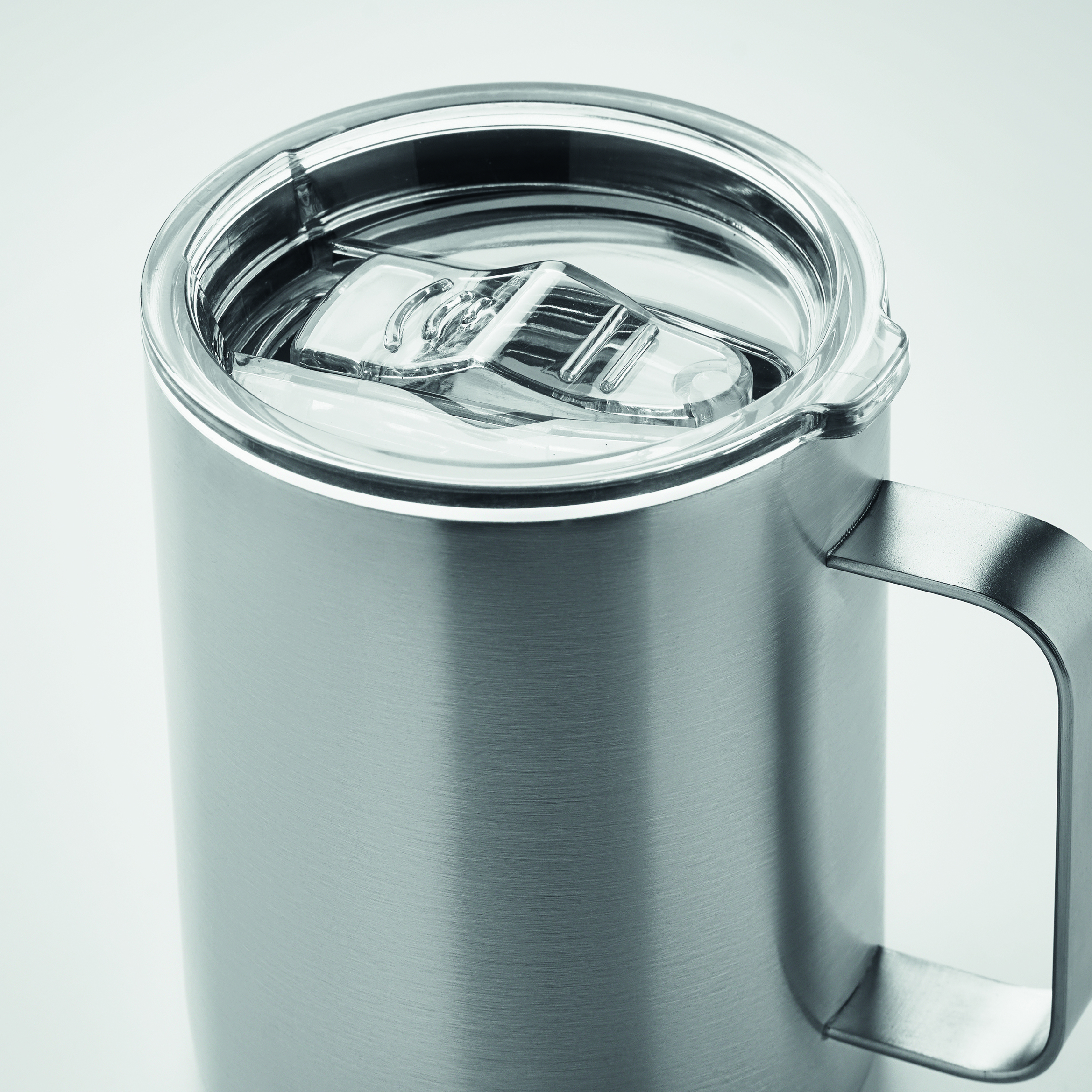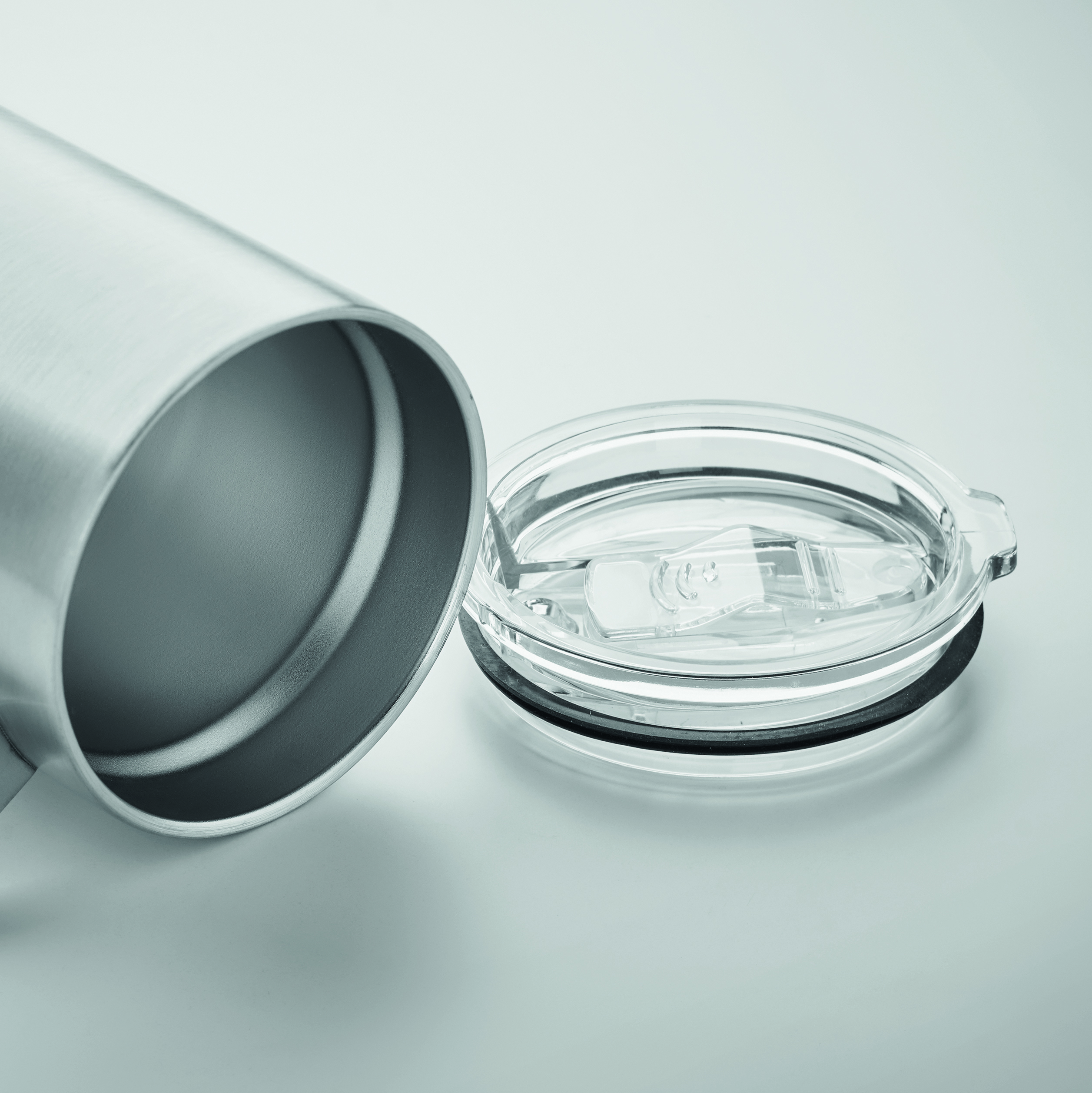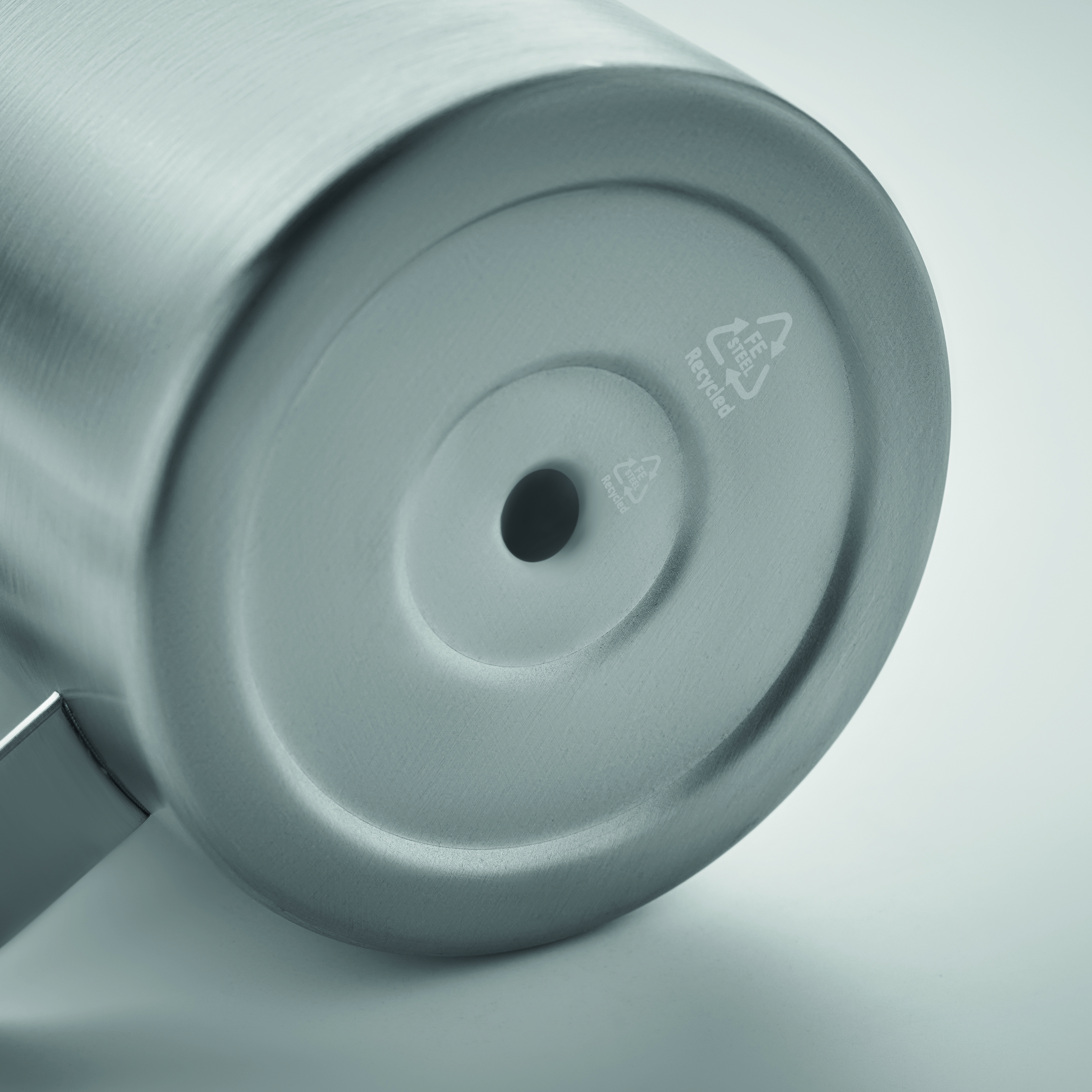 Dwuścienny kubek ze stali nierdzewnej z recyklingu (90% recyklingowanej stali nierdzewnej i 10% stali nierdzewnej) z pokrywką z zasuwanym otworem do picia. Pojemność: 300 ml.