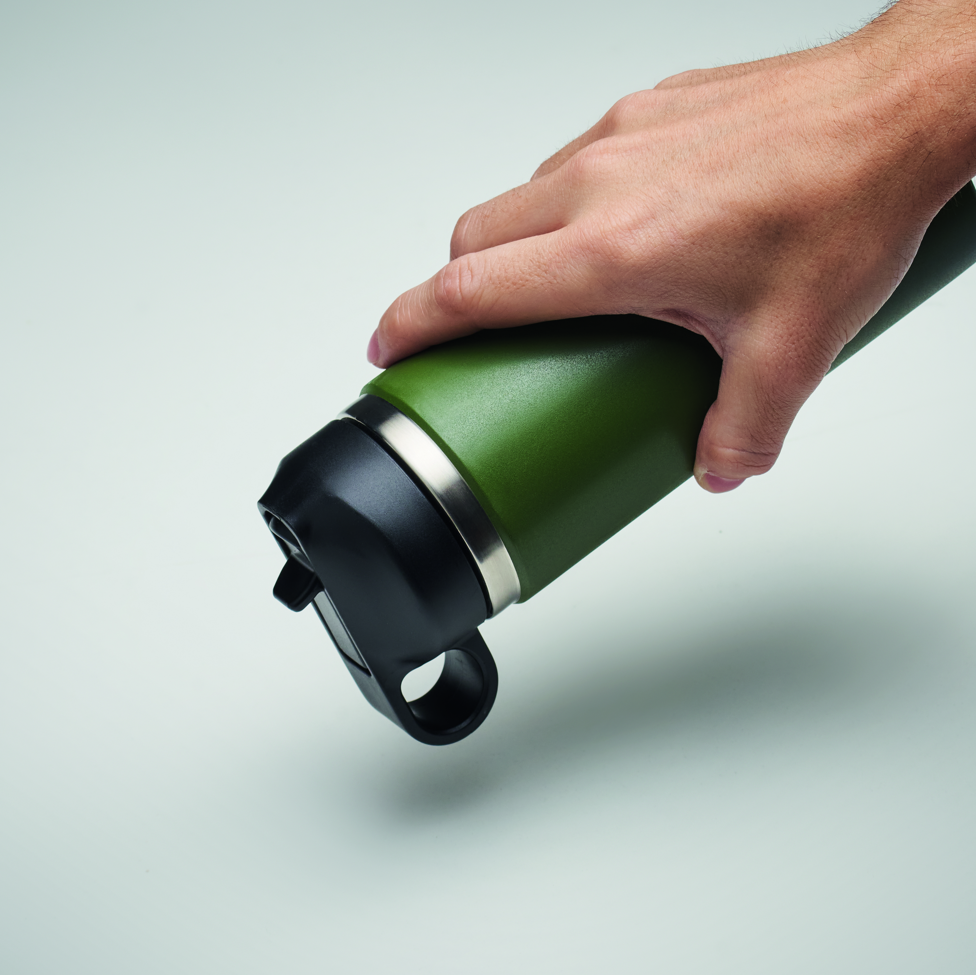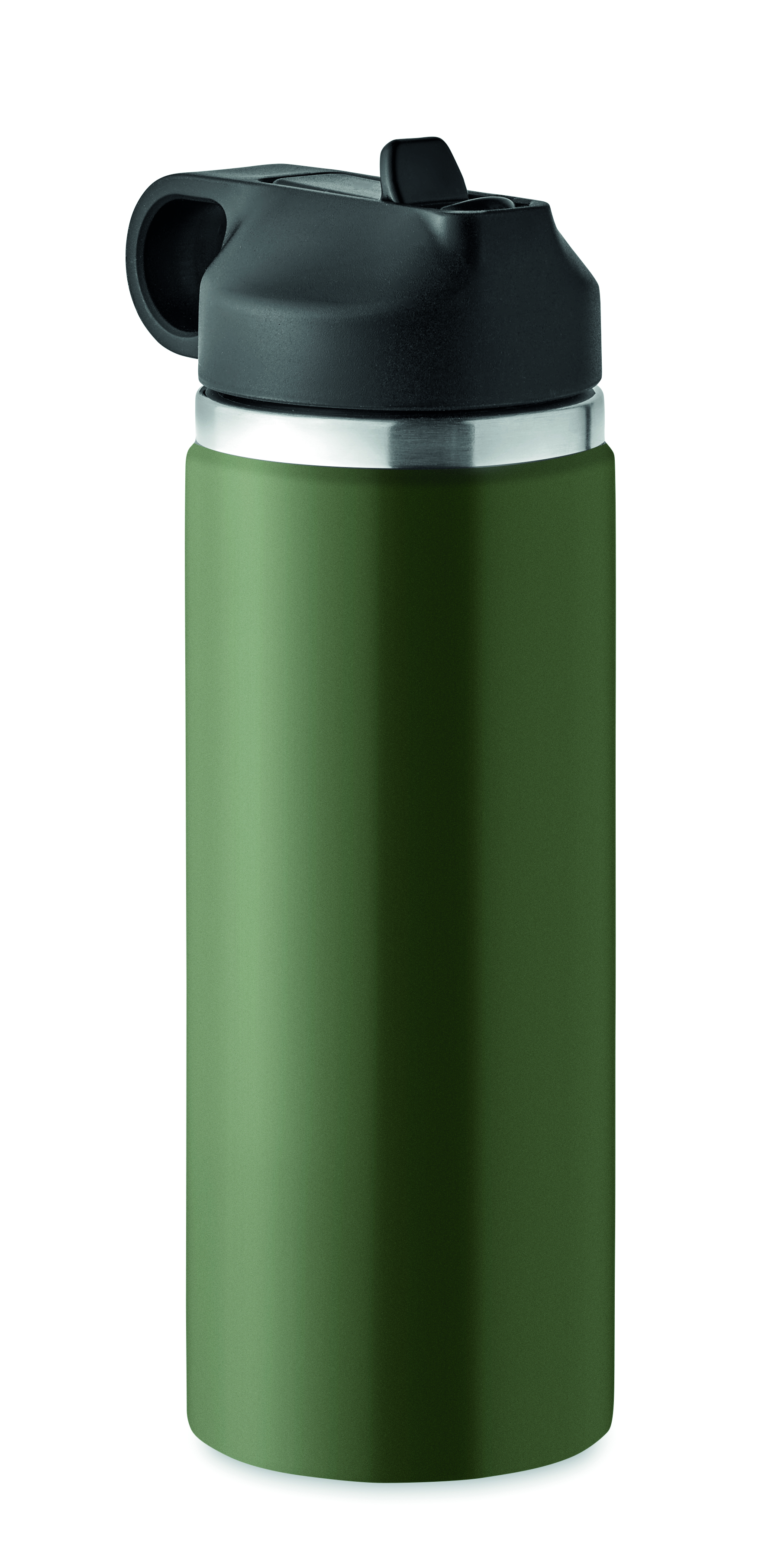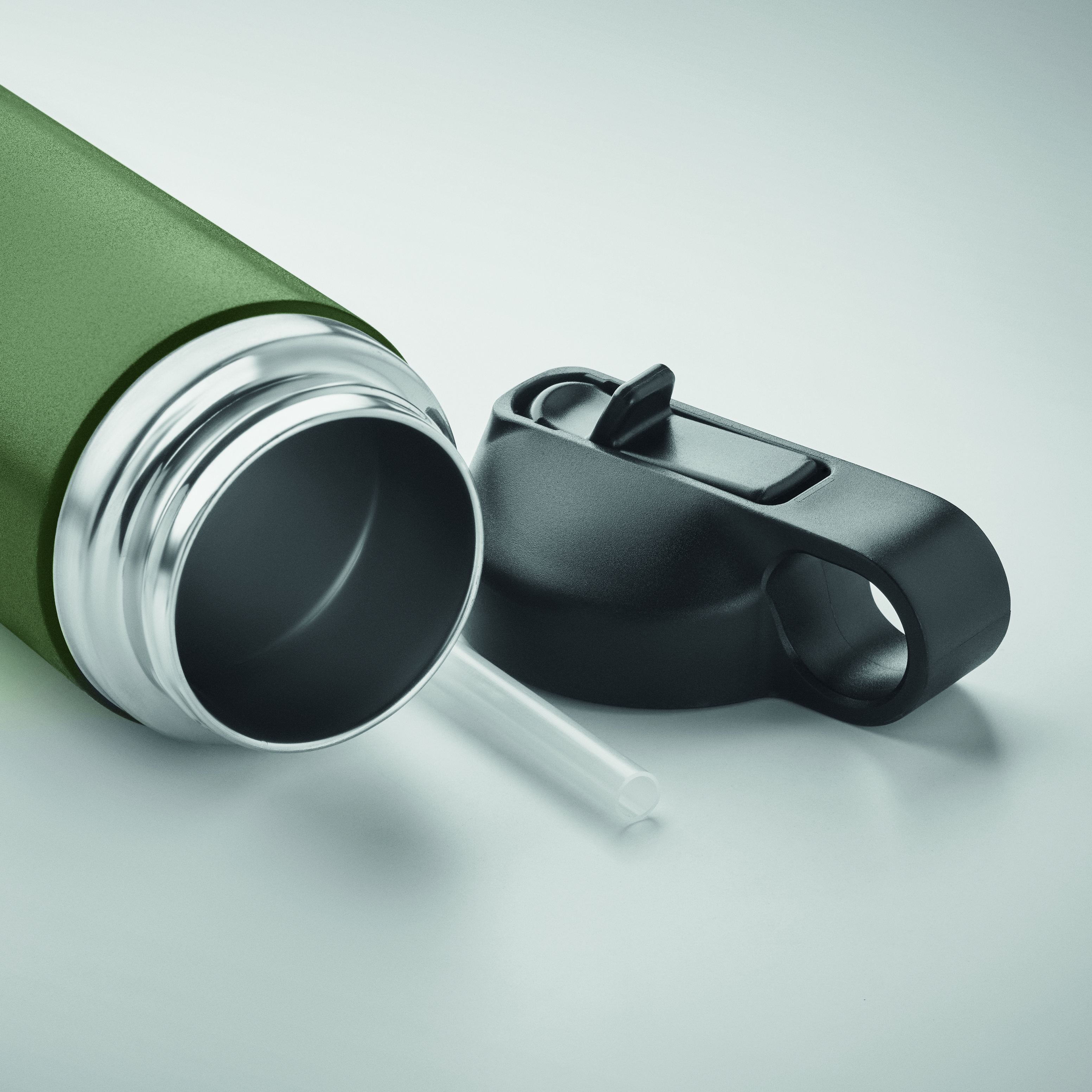 Izolowana próżniowo butelka z podwójnymi ściankami ze stali nierdzewnej z recyklingu (90% ze stali nierdzewnej z recyklingu i 10% ze stali nierdzewnej) z pokrywką z PP i wbudowaną słomką. Szczelna. Pojemność: 500 ml.