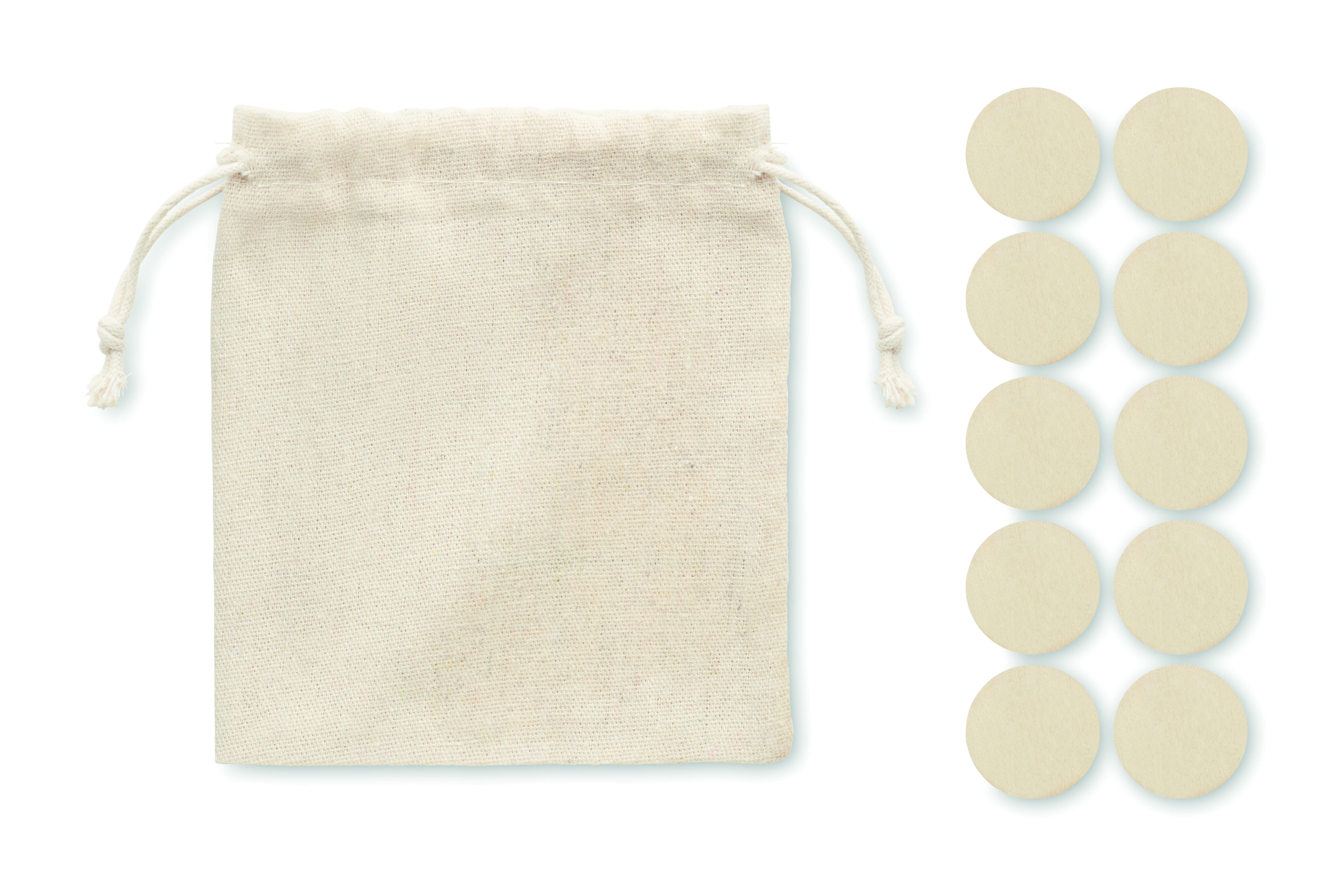 Drewniana gra kółko i krzyżyk w bawełnianym woreczku ze szurkiem. Drewno jest produktem naturalnym, dlatego mogą występować niewielkie różnice w kolorze i rozmiarze poszczególnych elementów, co może mieć wpływ na ostateczny efekt zdobienia.