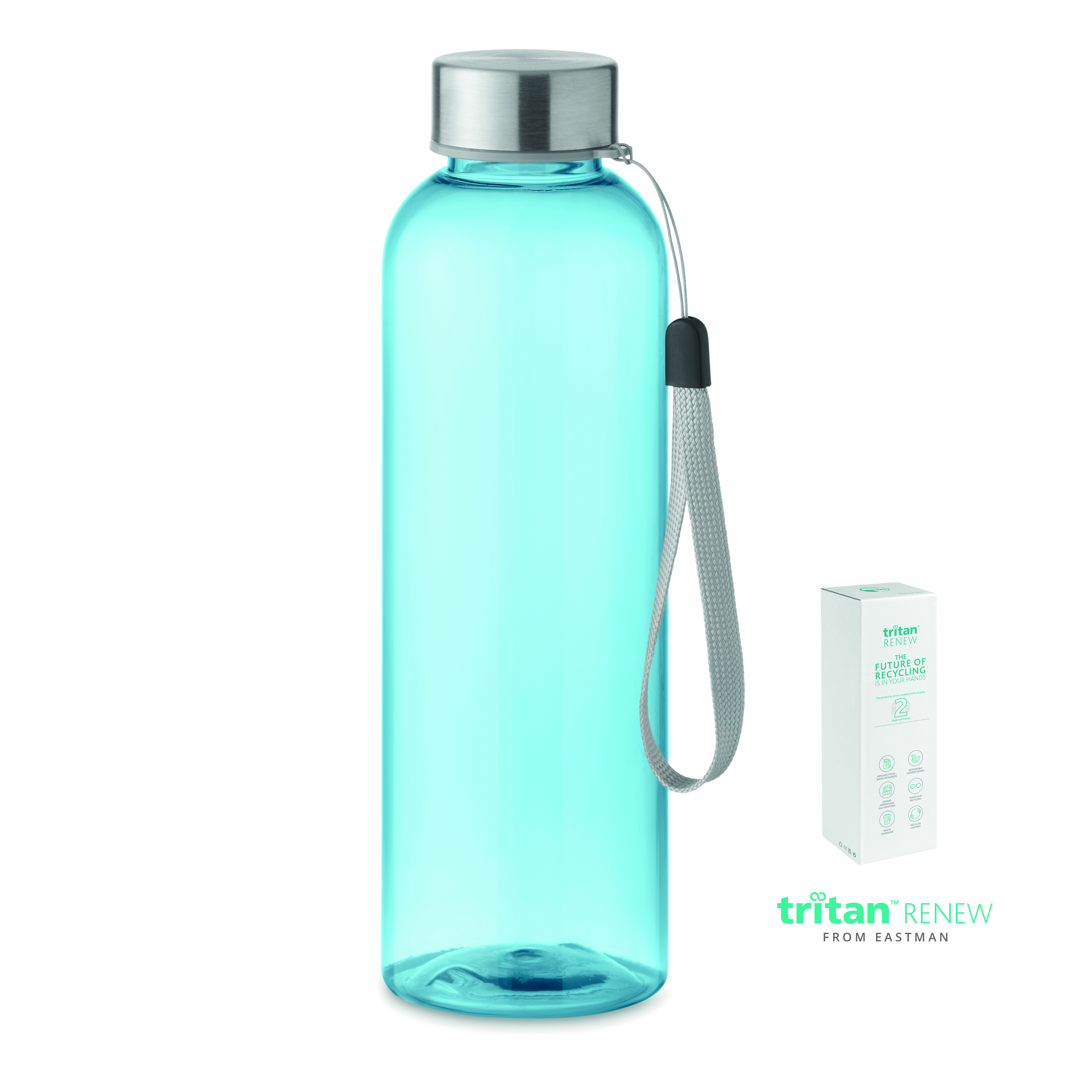 Butelka do picia z materiału Tritan Renew™, który nie zawiera BPA, z zakrętką z uchwytem ze stali nierdzewnej. Szczelna. Pojemność 500 ml. Ten produkt jest wykonany w 50% z odpadów z tworzyw sztucznych przy użyciu certyfikowanego bilansu masy ISCC.