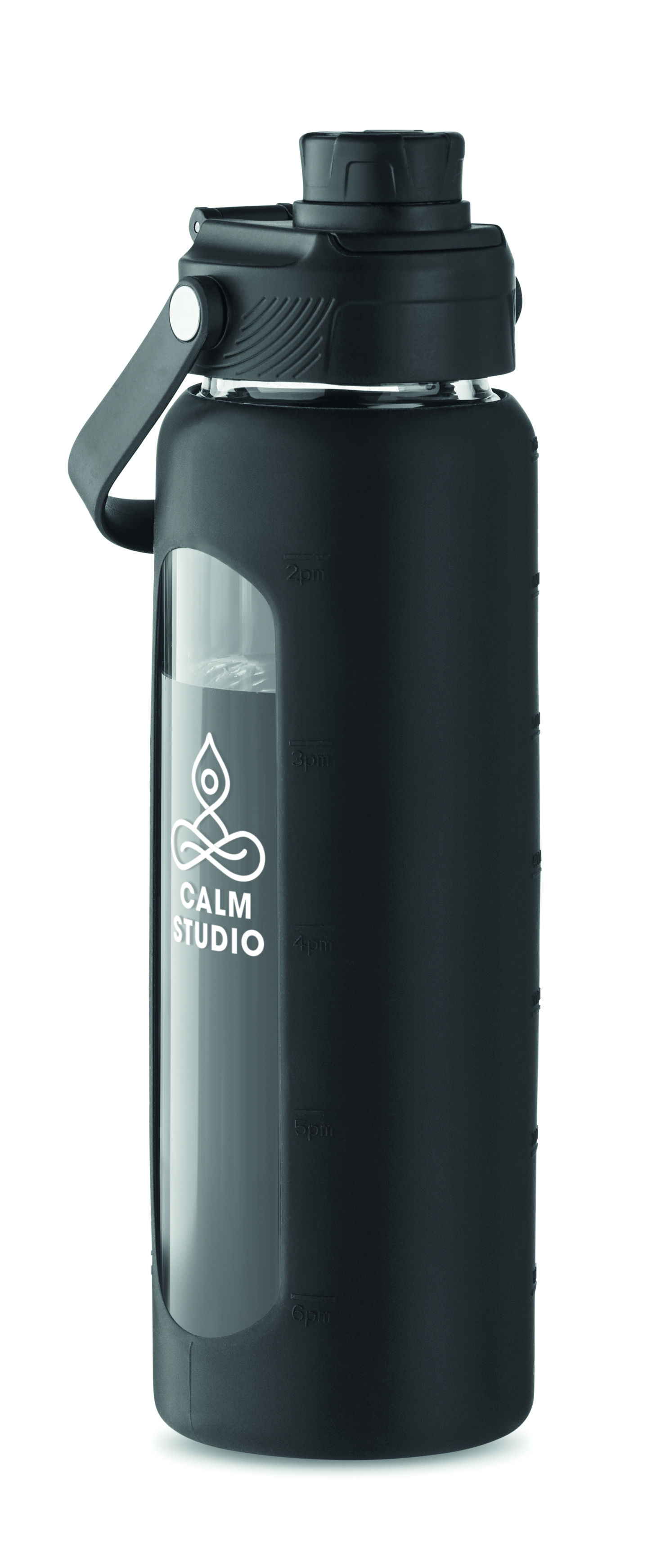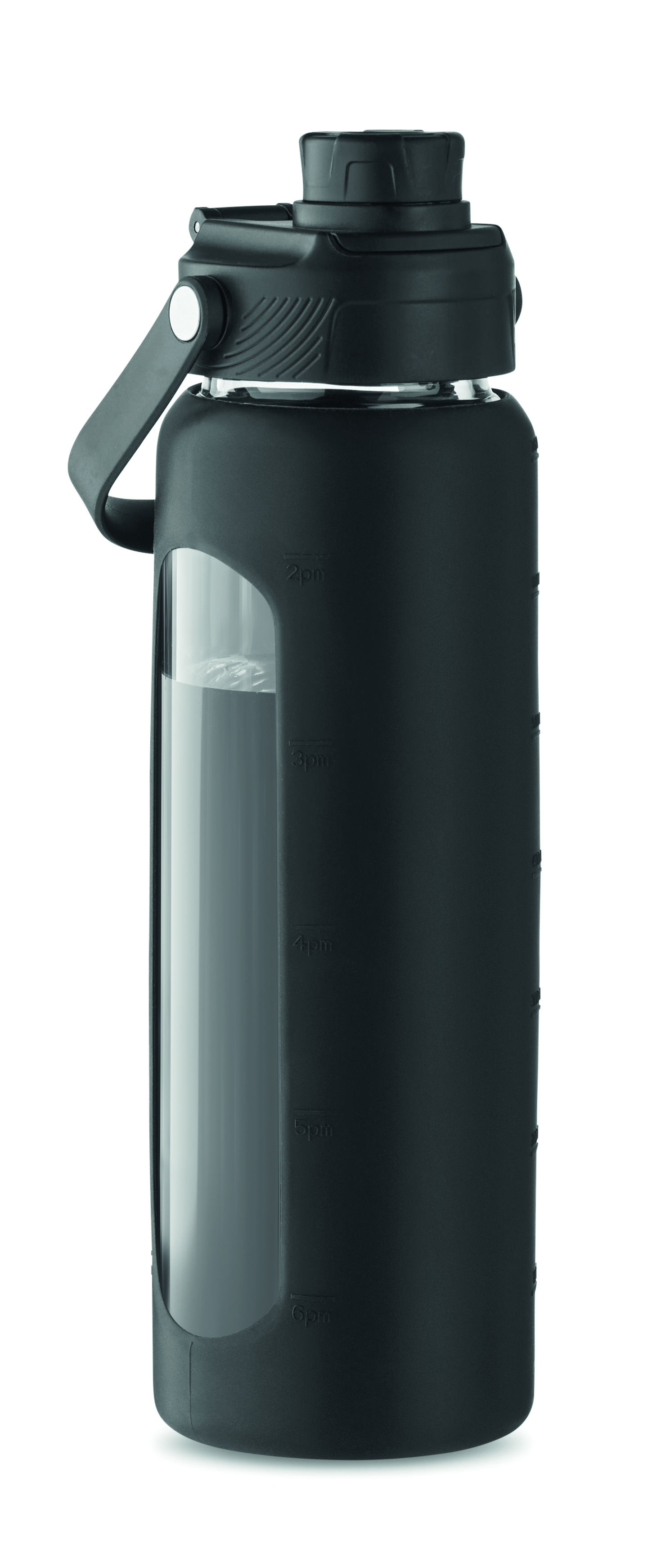 Wysoka butelka ze szkła borosilikatowego z silikonową osłoną, z zakrętką z PP z uchwytem. Szczelna. Pojemność: 750 ml.