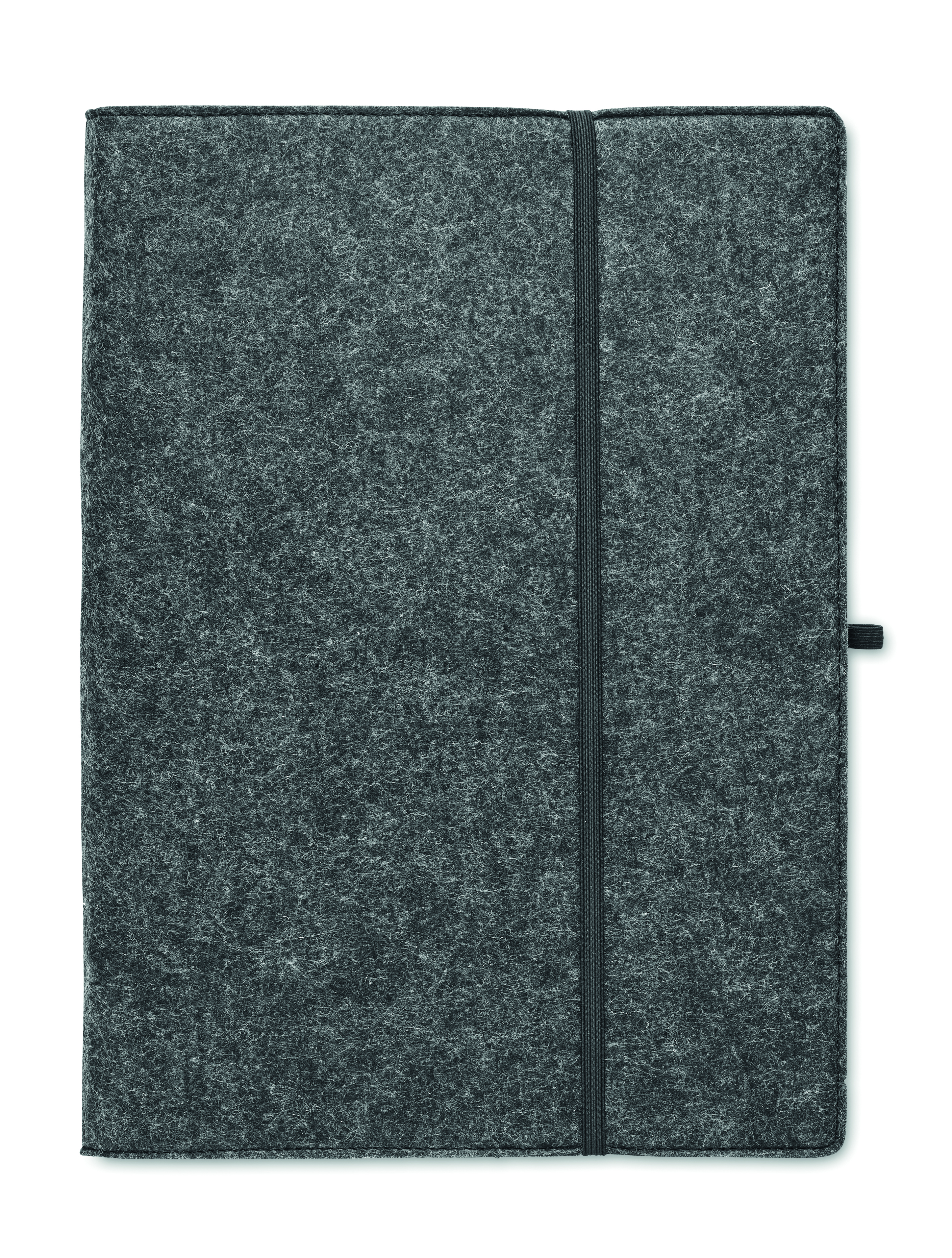 Teczka konferencyjna A4 z filcu RPET. Notatnik na 100 kartek w linie z papieru z recyklingu z elastycznym uchwytem na długopis.
