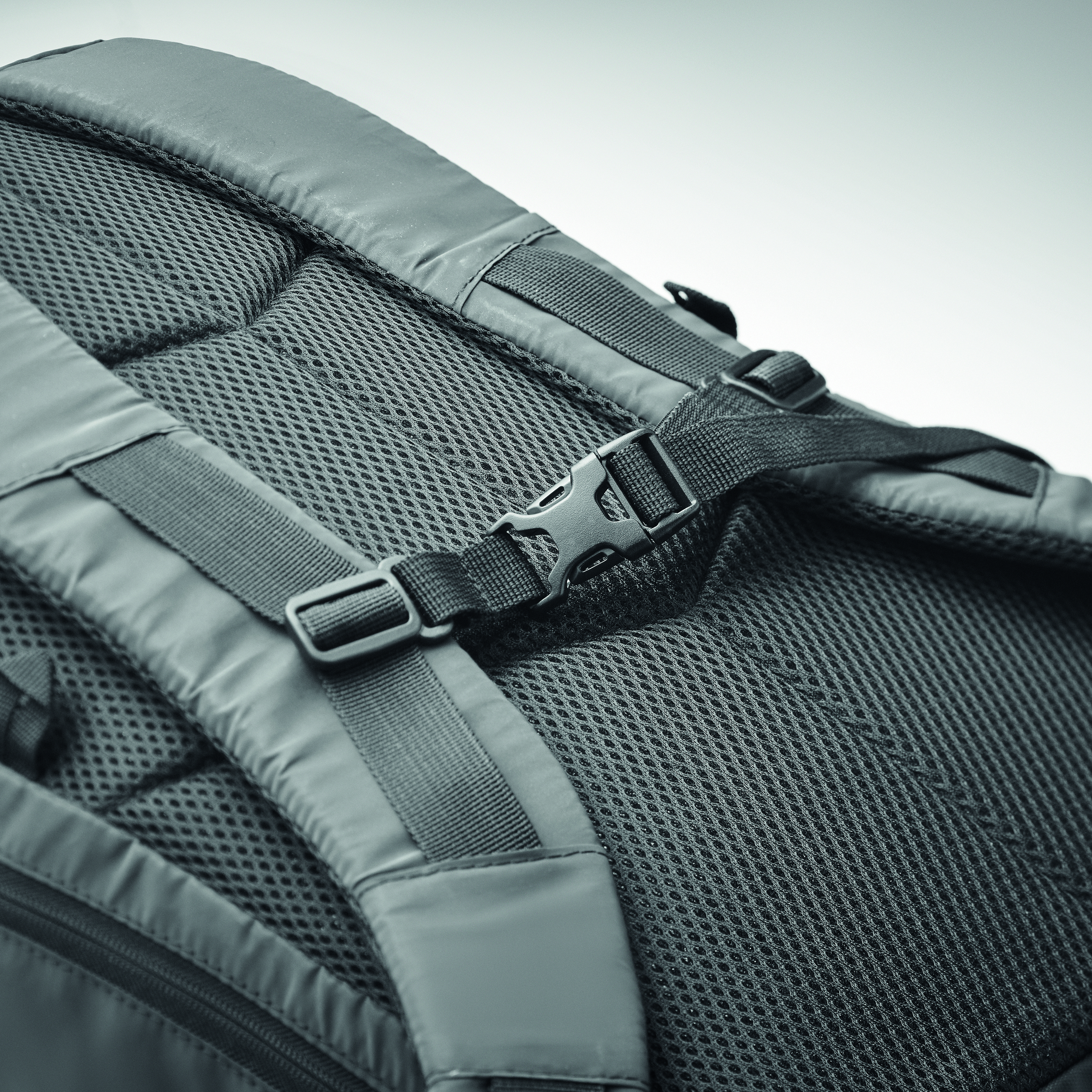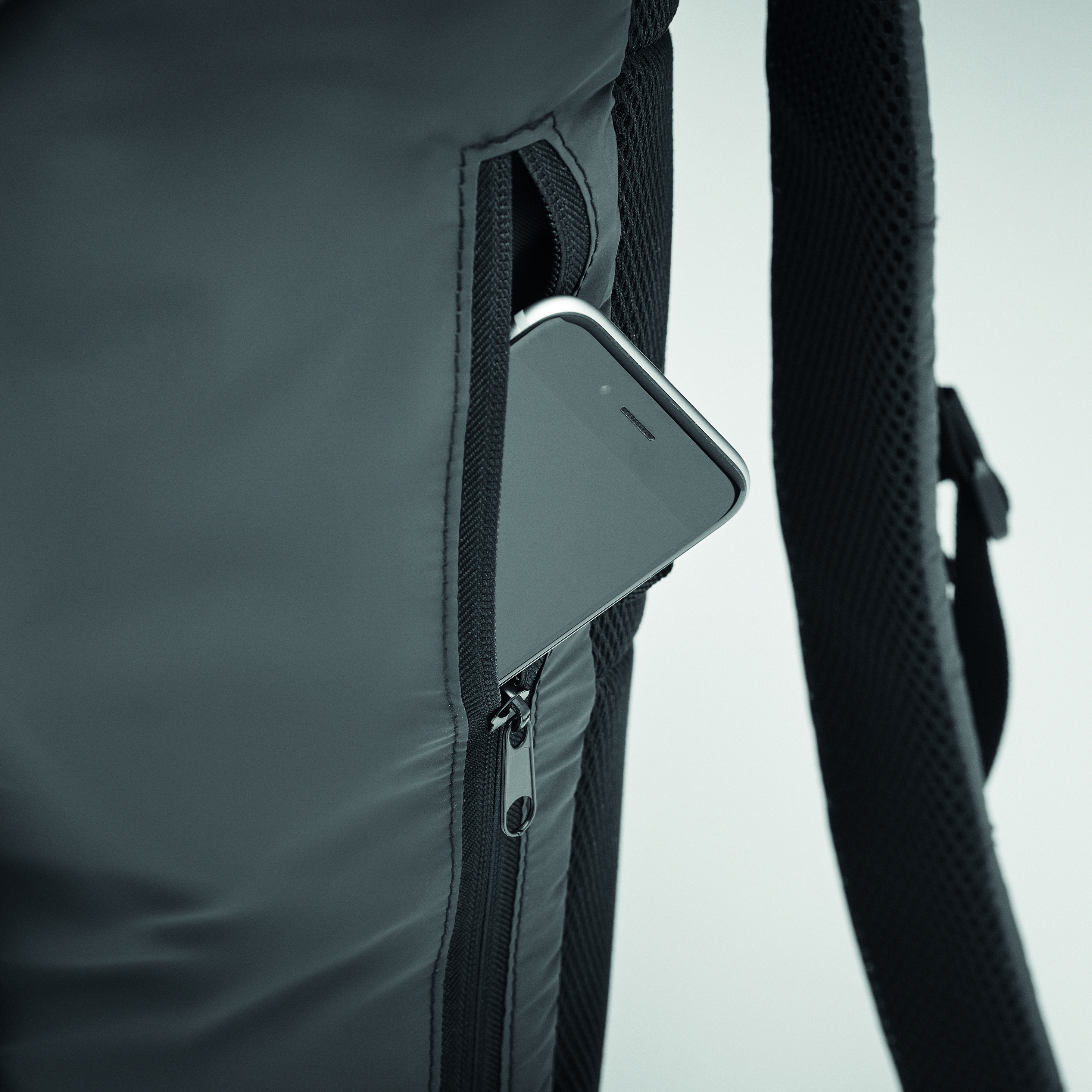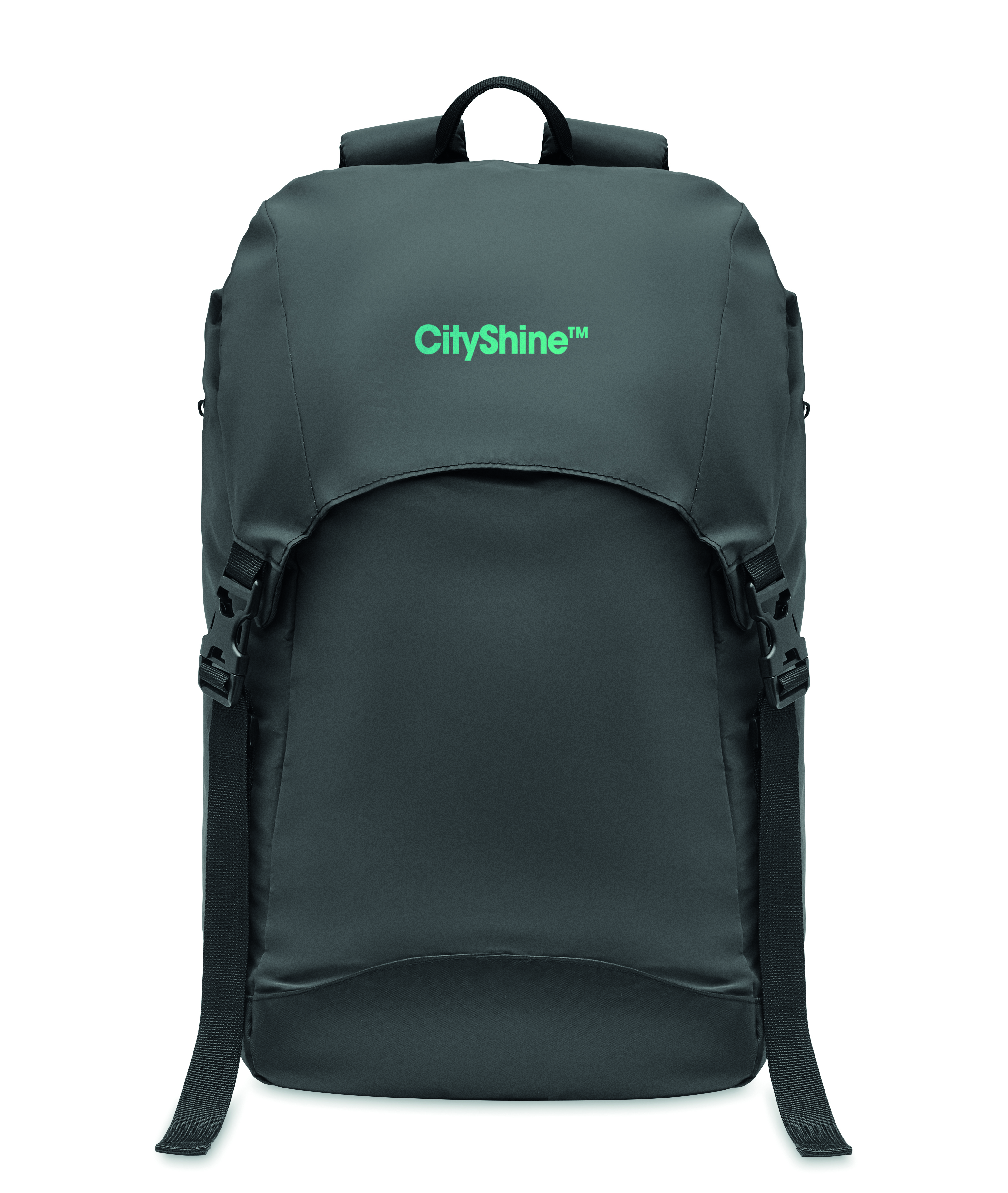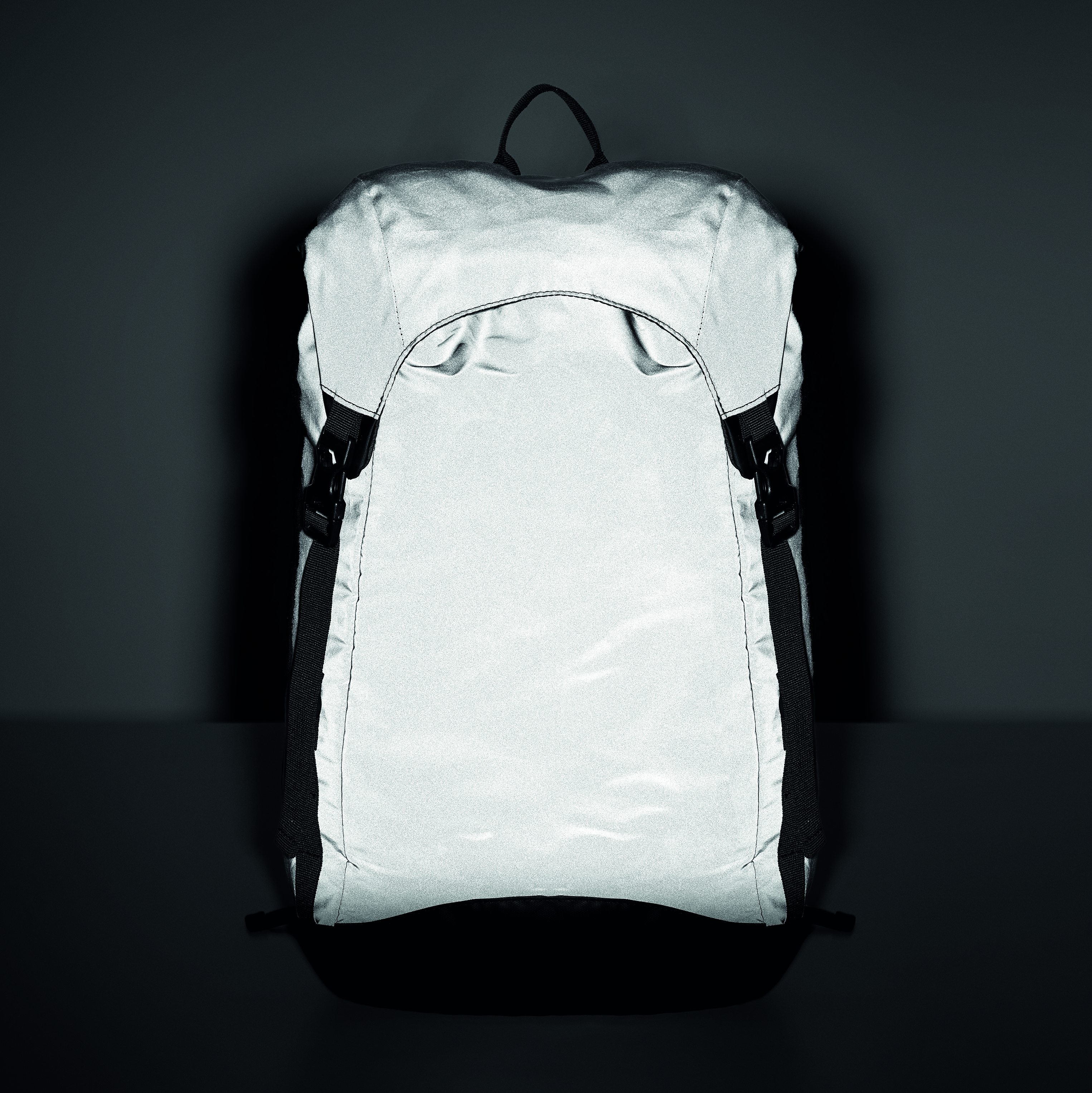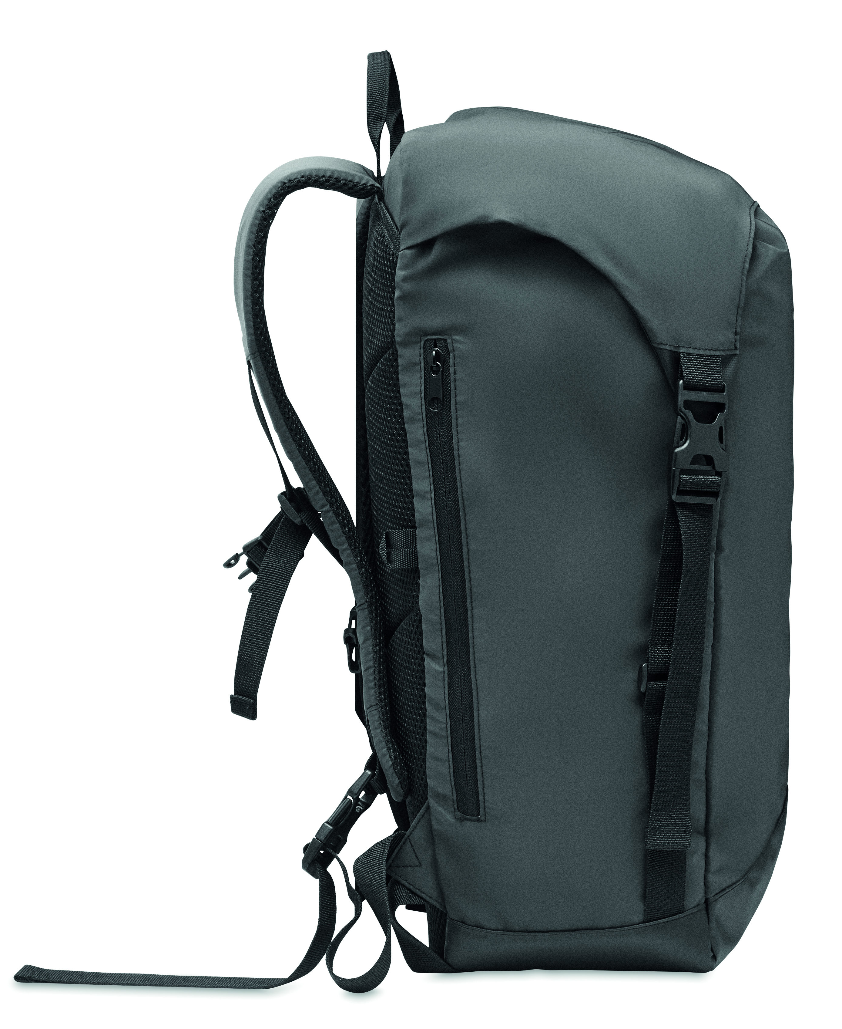 Plecak outdoorowy z poliestru 190T pokrytego odblaskowymi granulkami. Boczna kieszeń zewnętrzna zapinana na zamek i wyściełane plecy, wewnętrzna podszewka z zapięciem na sznurek. Jedna duża wyściełana wewnętrzna przegroda na laptopa. Posiada regulowane wyściełane szelki oraz regulowany pas piersiowy i biodrowy z zapięciem na klamrę. Wodoodporny.