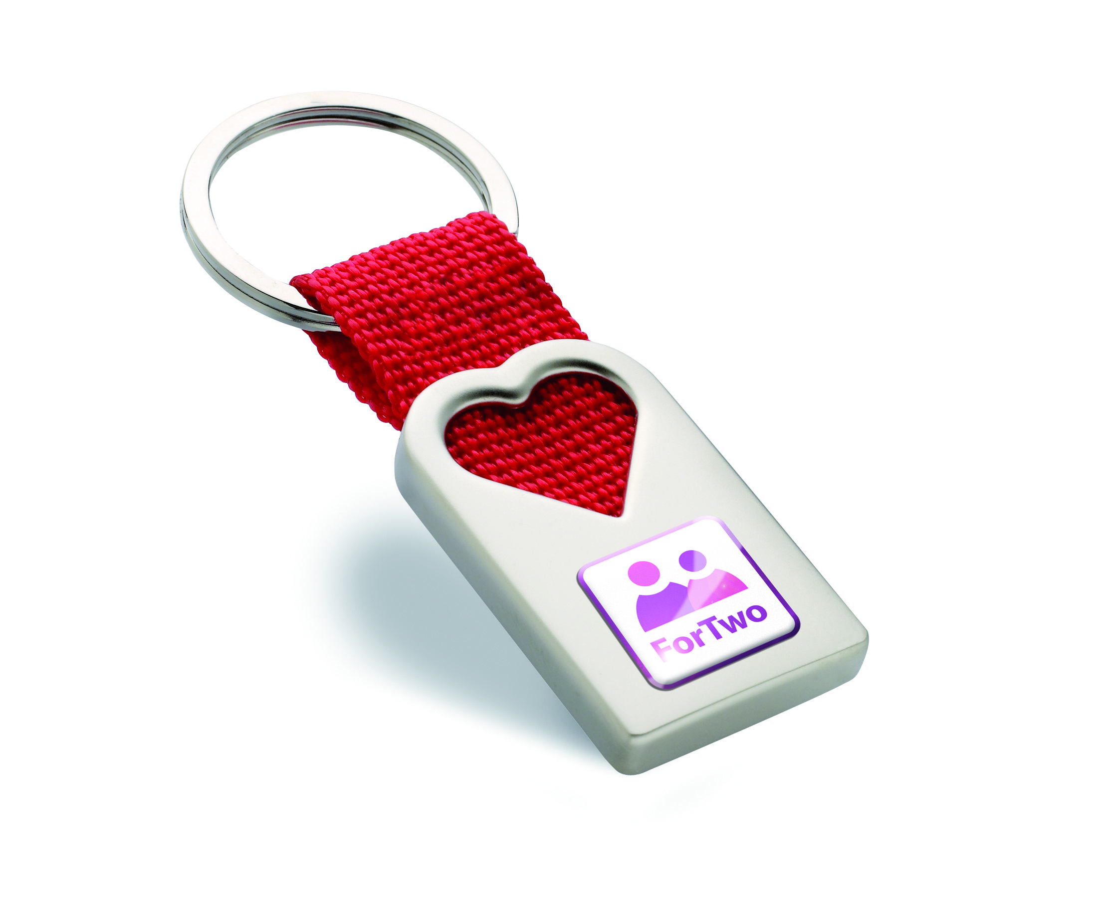 Metalowy brelok - serce, matowe wykończenie i czerwony pasek z polyestru. Indywidualne ozdobne pudełko.