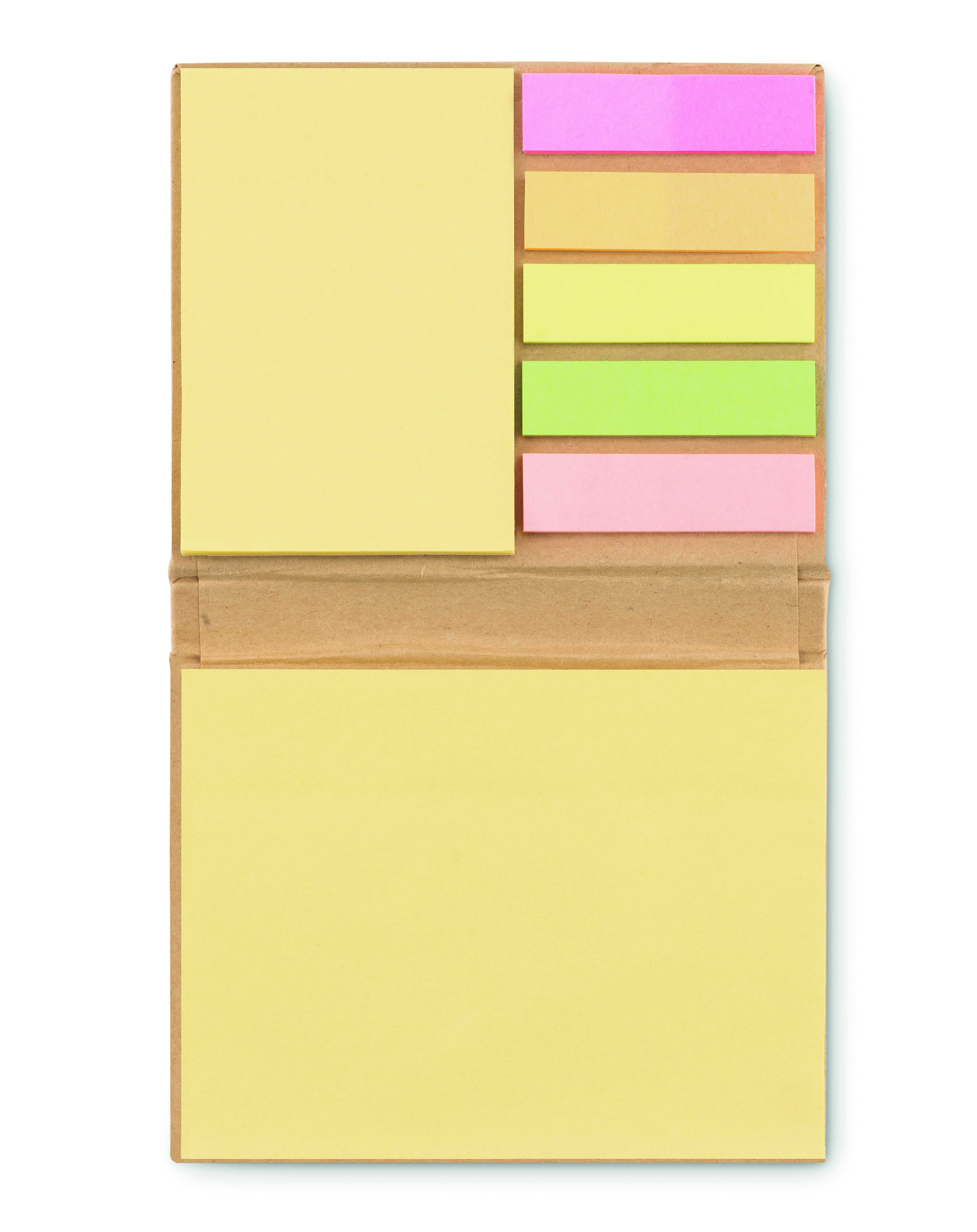 3-częściowy notatnik z karteczkami samoprzylepnymi w okładce z kartonu pochodzącego z recyklingu. Duże i średnie żółte karteczki samoprzylepne oraz 5 znaczników w różnych kolorach.
