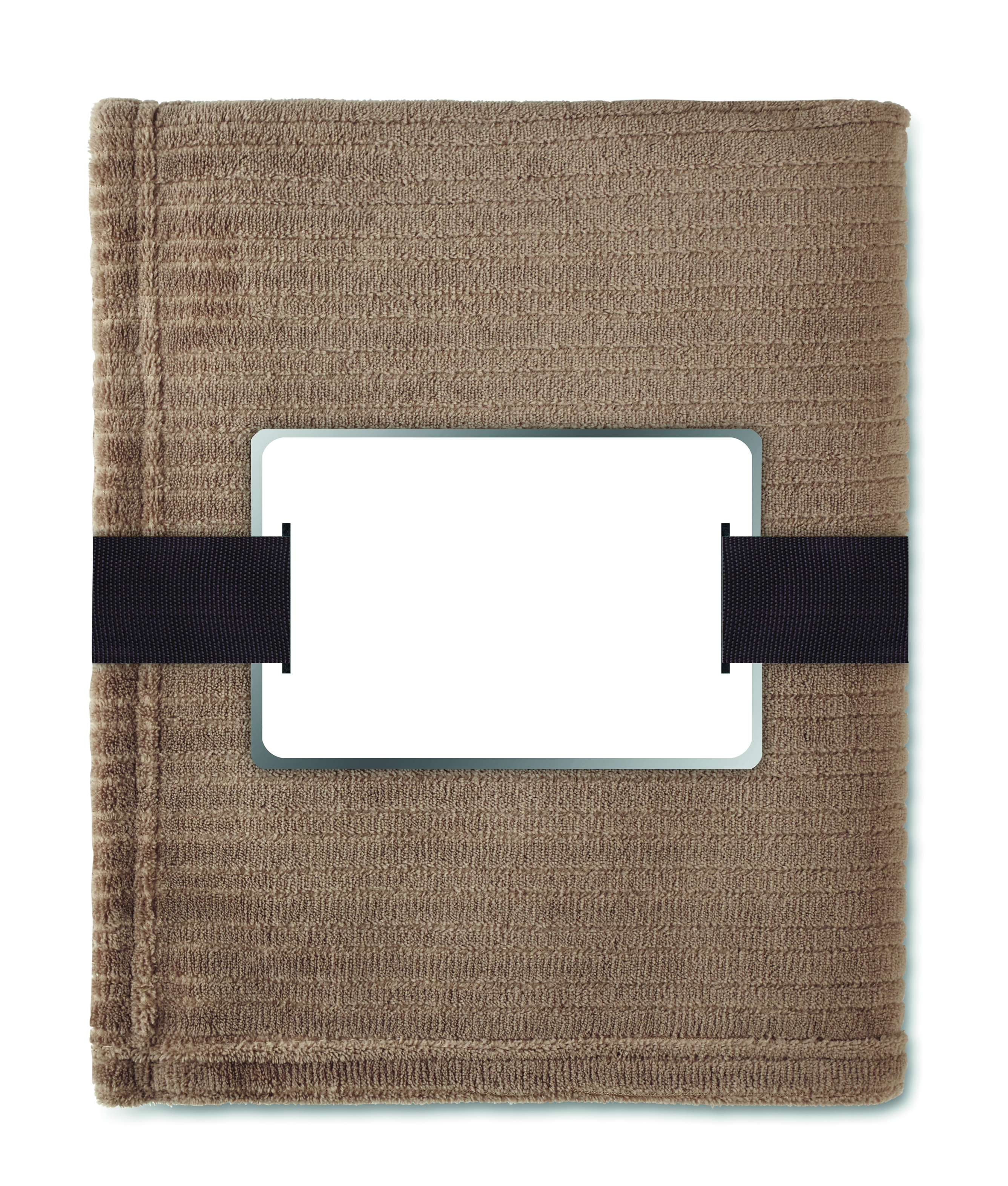 Miękki koc polarowy o gramaturze 240 gr / m²,owinięty wstążką, z kartą do nadruku.