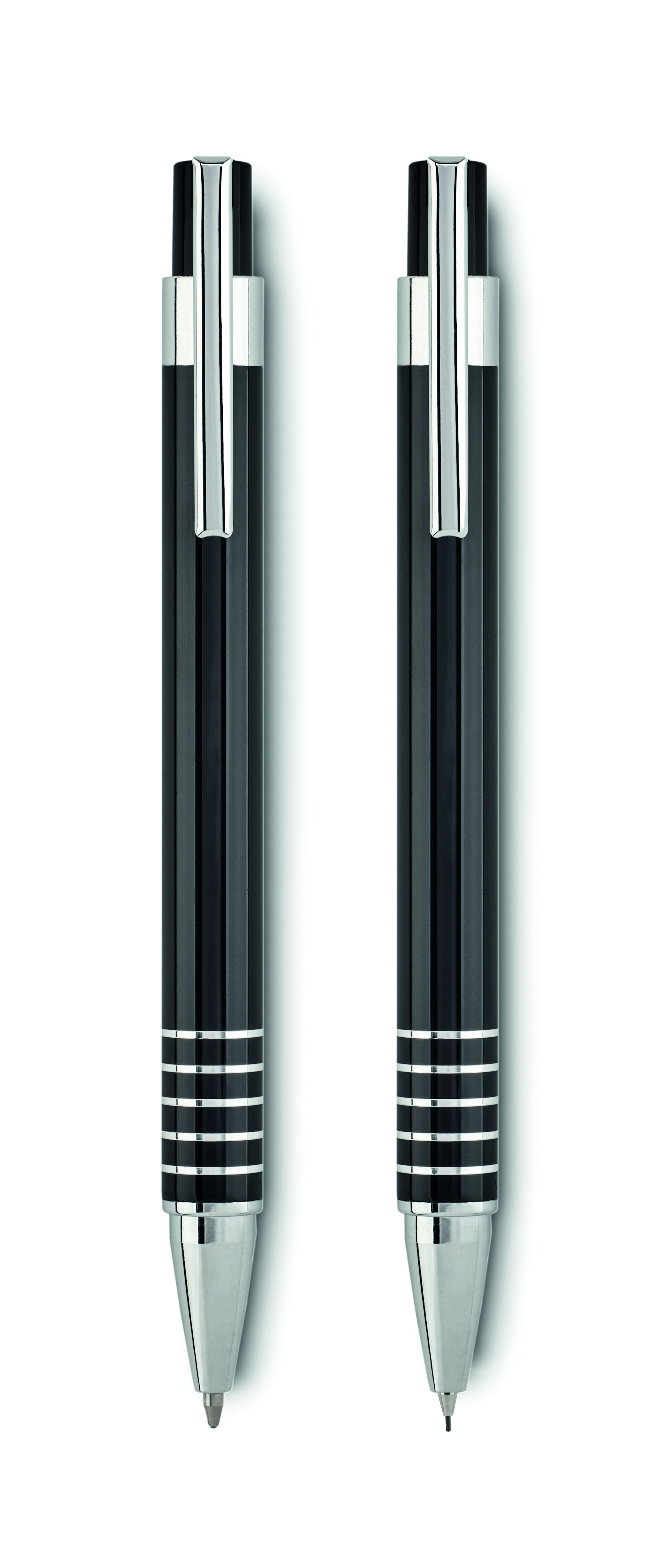 Aluminiowy zestaw do pisania: przyciskany długopis z niebieskim wkładem i mechaniczny ołówek, w dobranym kolorystycznie metalowym pudełku.