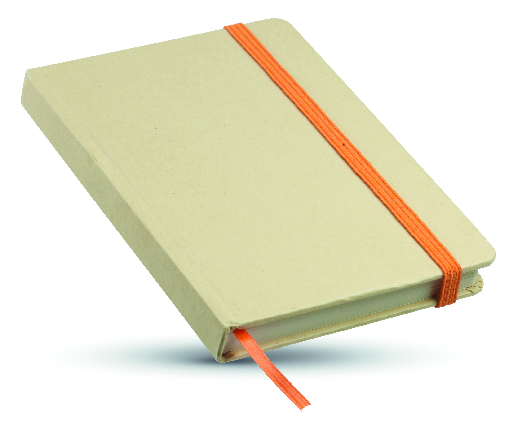 Notatnik A6 z twardą okładką z papieru z recyklingu. Oprawa kartonowa. 192 strony z czystego papieru makulaturowego (96 arkuszy). Elastyczny pasek zamykający i zakładka ze wstążki. FSC®-certified | FSC MIX CREDIT, P7.1, FSC-C213206