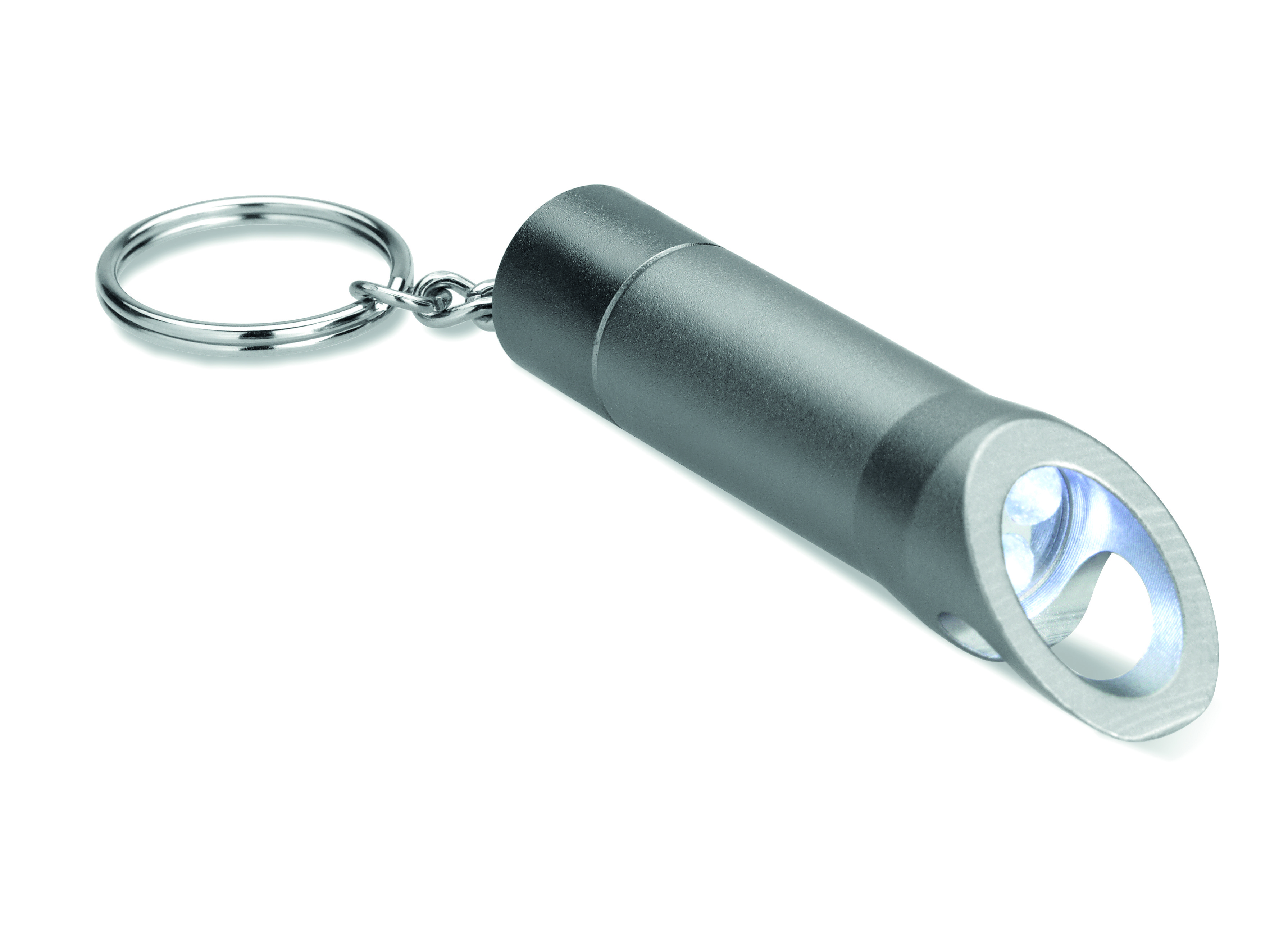 Metalowa latarka Led zawieszona na breloczku, zawierająca otwieracz do butelek.