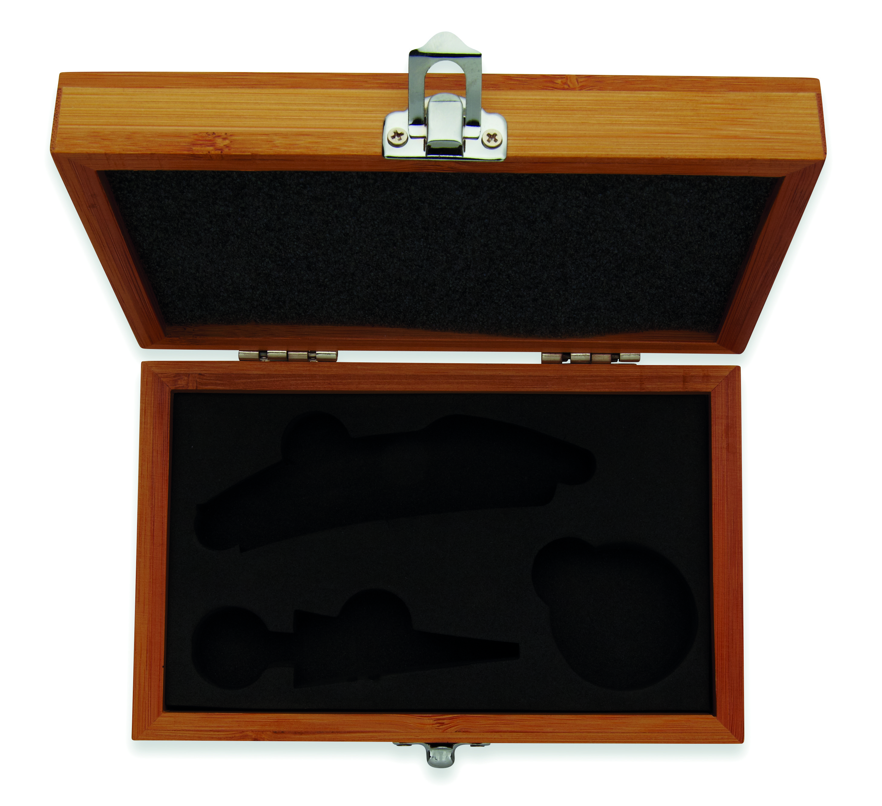 Zestaw do wina w bambusowym pudełku zawiera korkociąg, kołnierz do wina i korek ze stali nierdzewnej i bambusa. Bambus jest produktem naturalnym, dlatego mogą wystąpić nieznaczne różnice w kolorze, wzorze i rozmiarze.