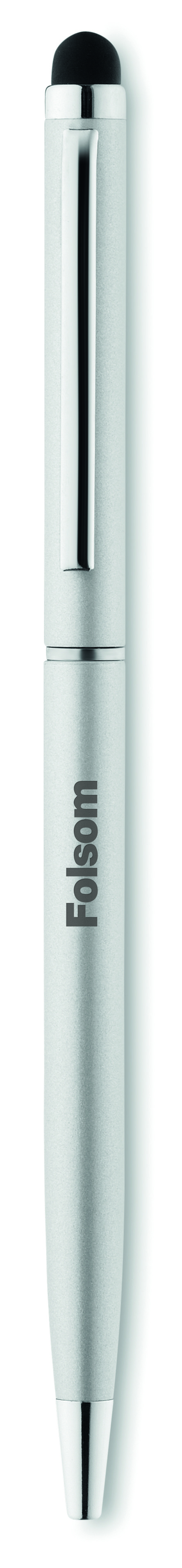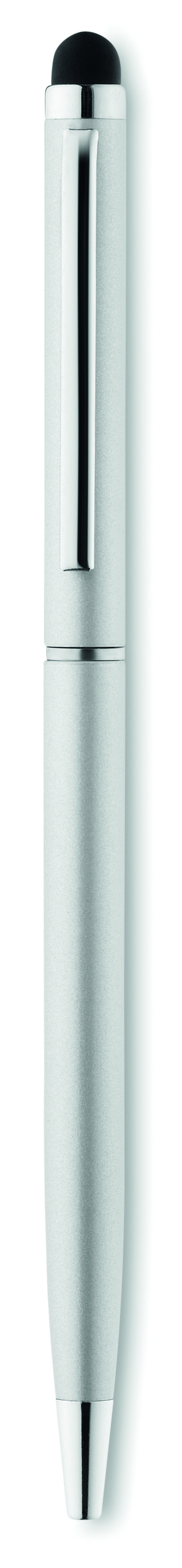 Obrotowy długopis z aluminium pochodzącego z recyklingu z rysikiem i błyszczącym chromowanym klipem. Niebieski tusz.