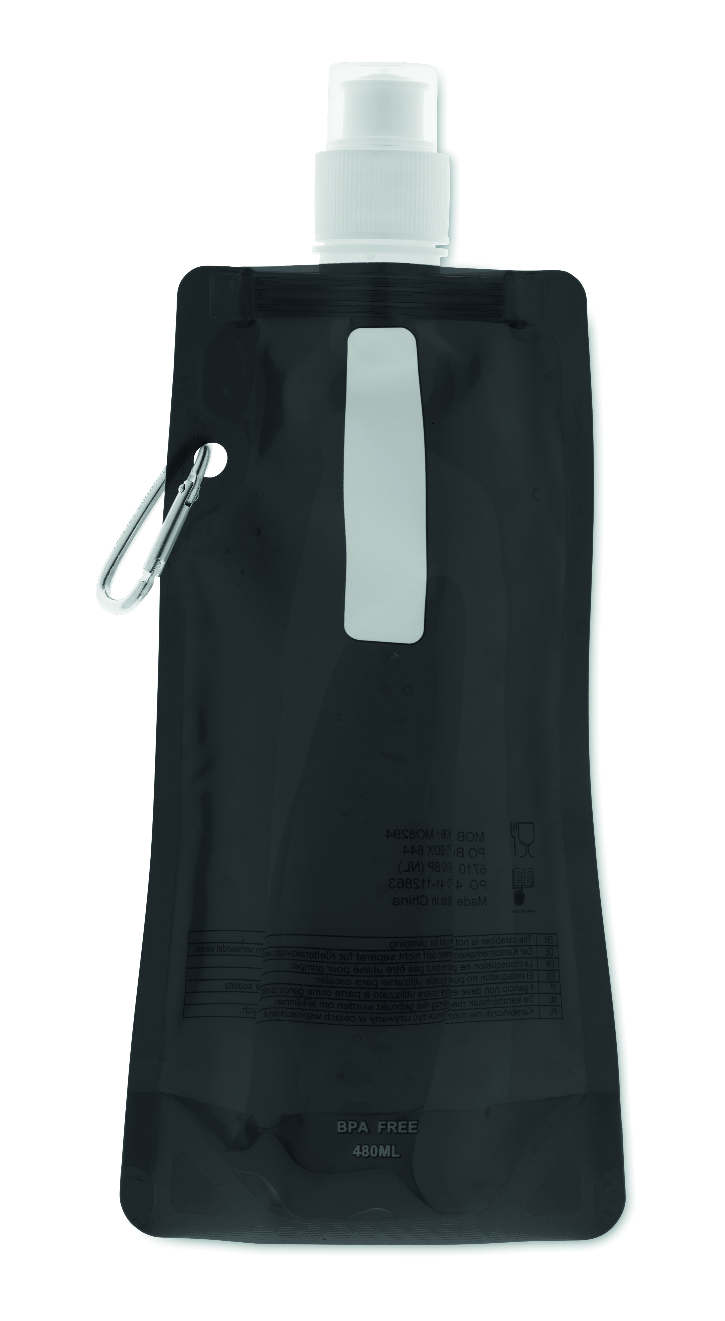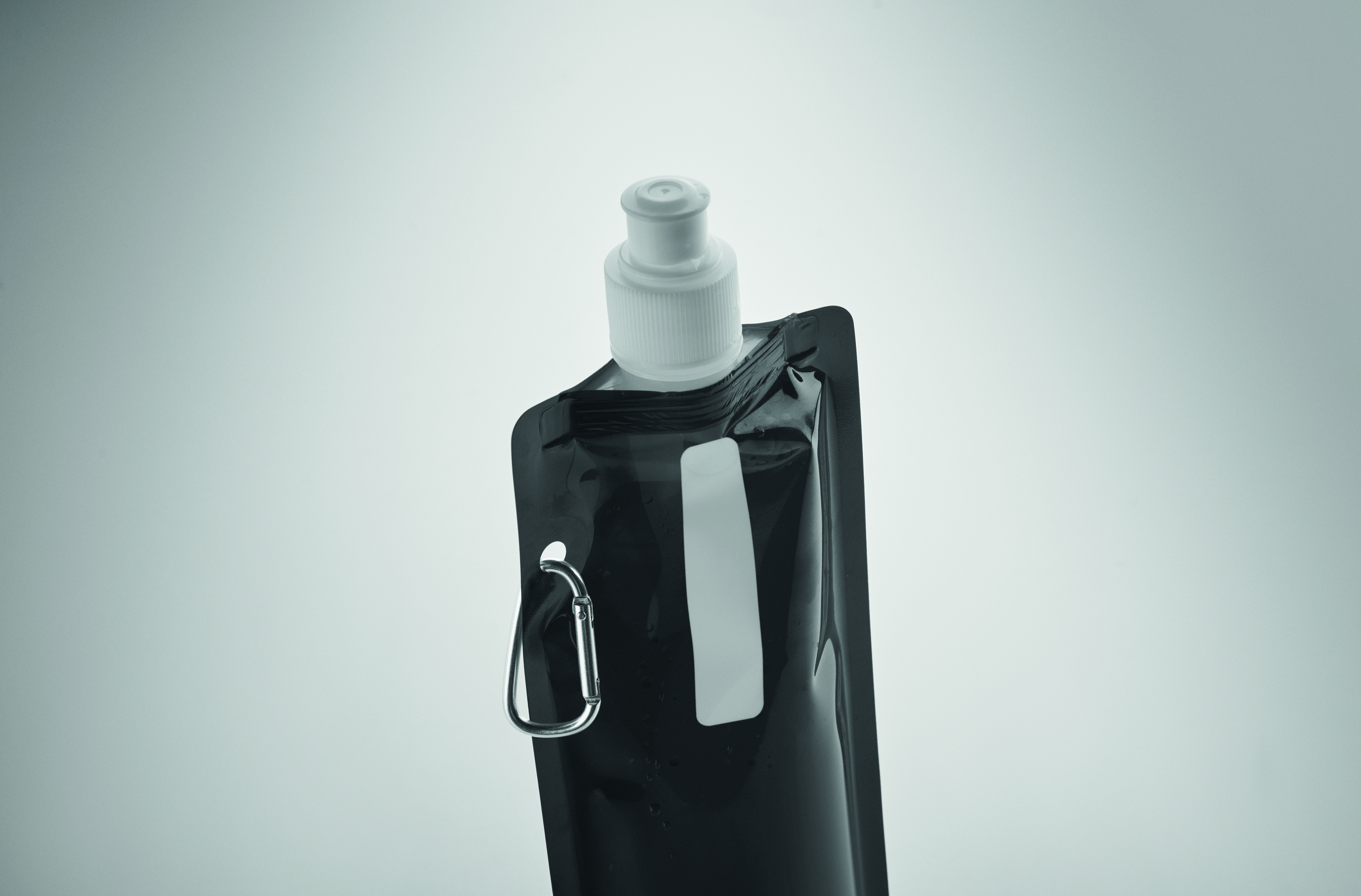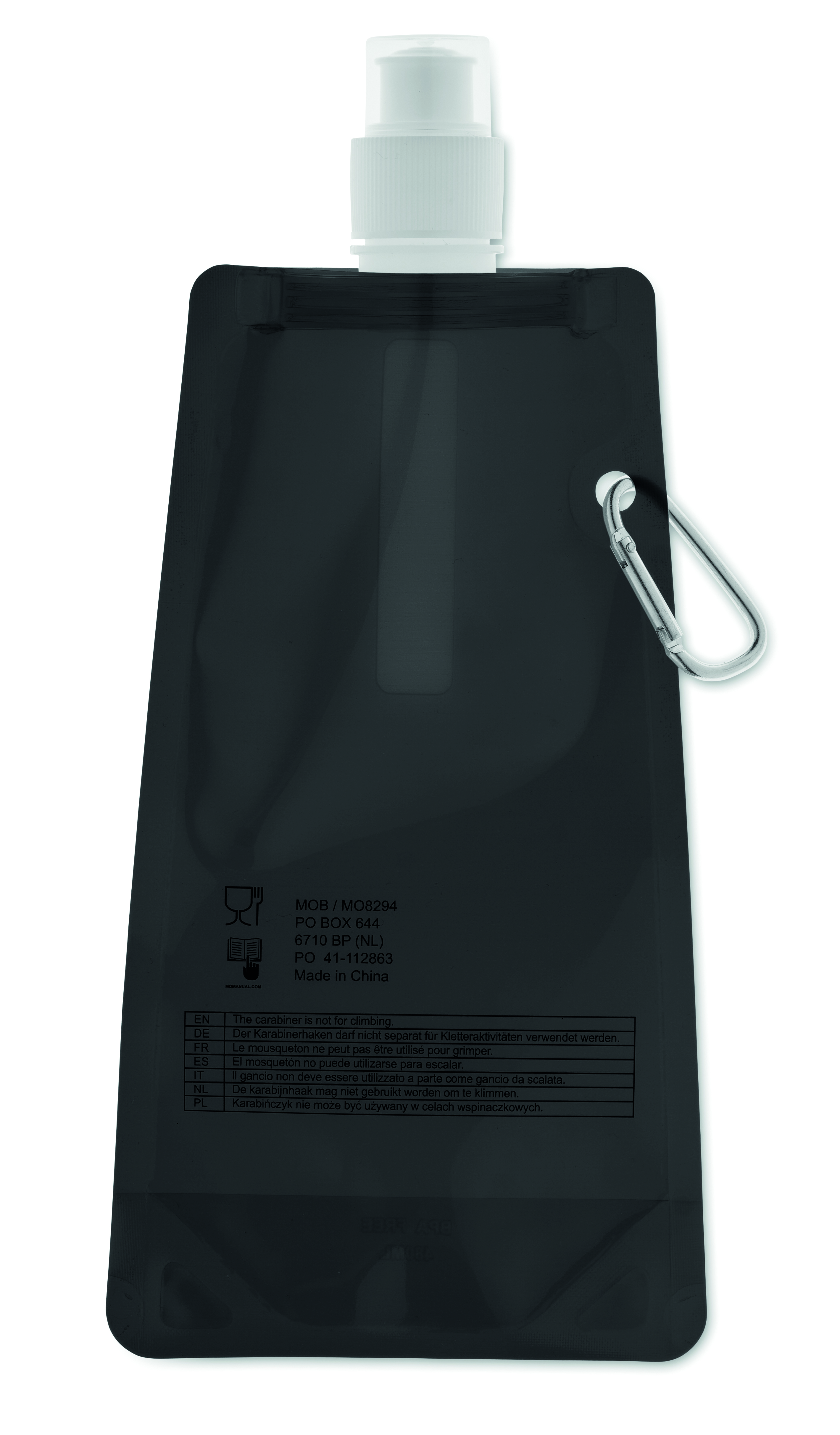 Składany plastikowy pojemnik na wodę z PET (nie zawiera BPA), z aluminiowym karabinkiem. Pojemność 480ml. Szczelna.