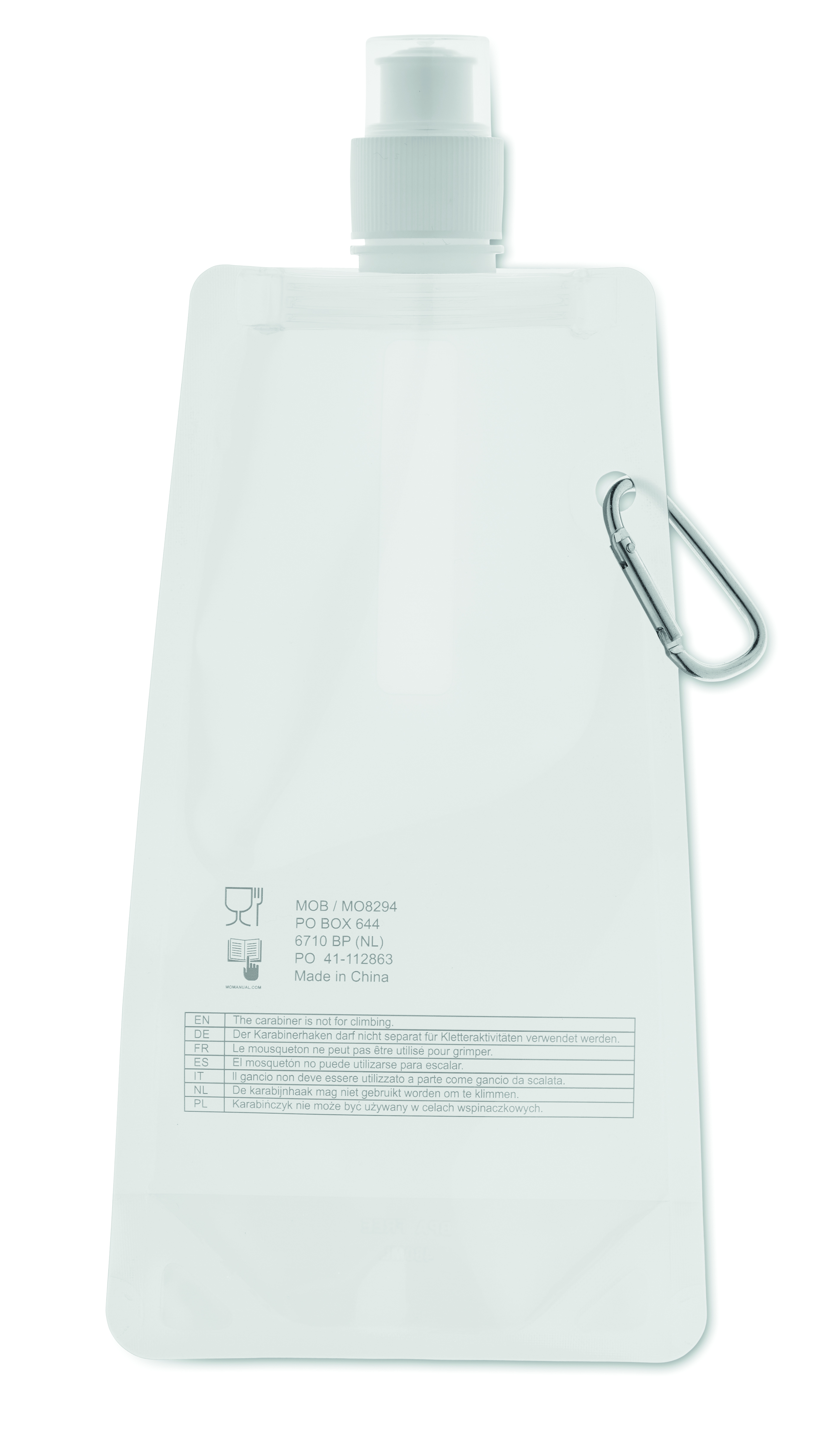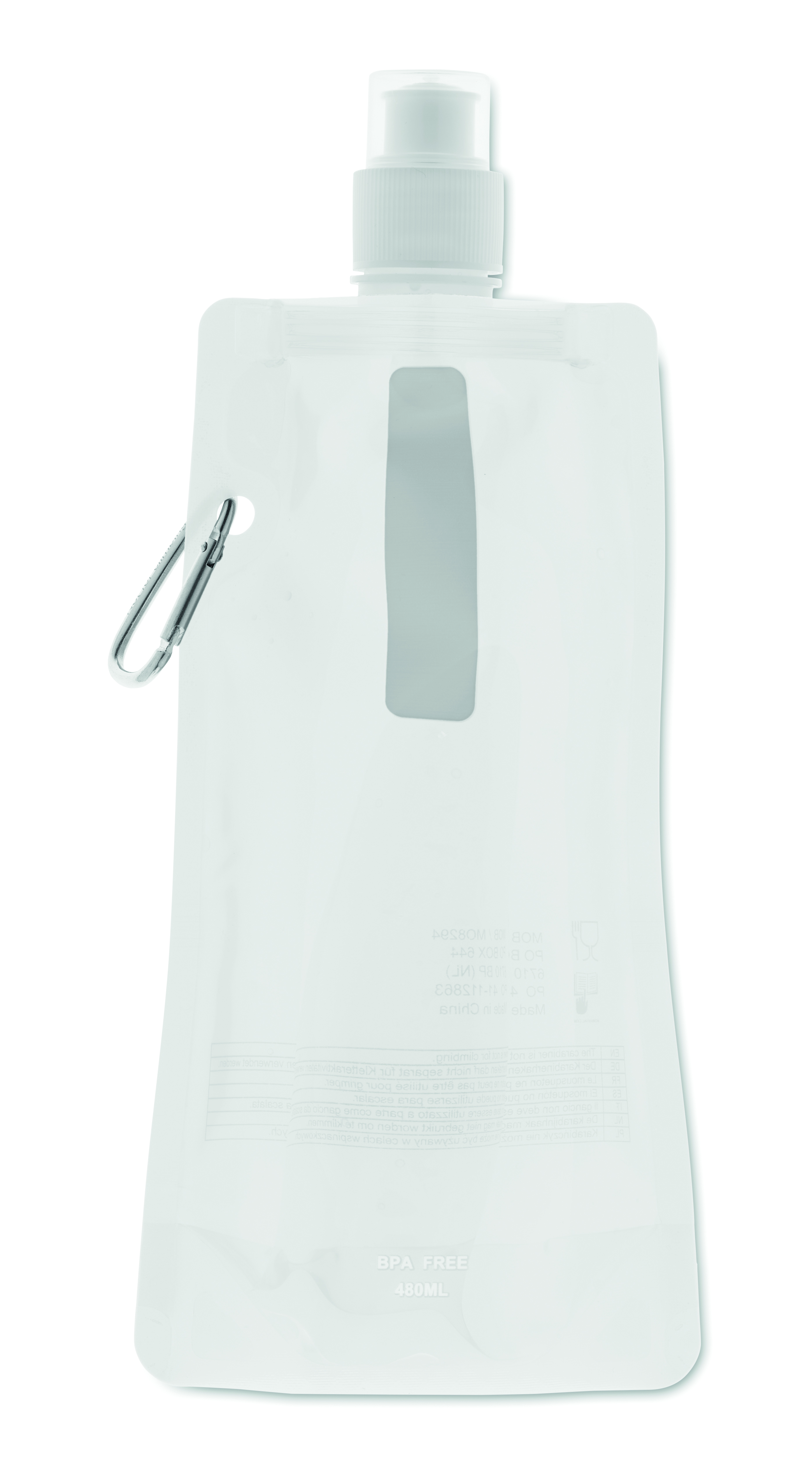 Składany plastikowy pojemnik na wodę z PET (nie zawiera BPA), z aluminiowym karabinkiem. Pojemność 480ml. Szczelna.