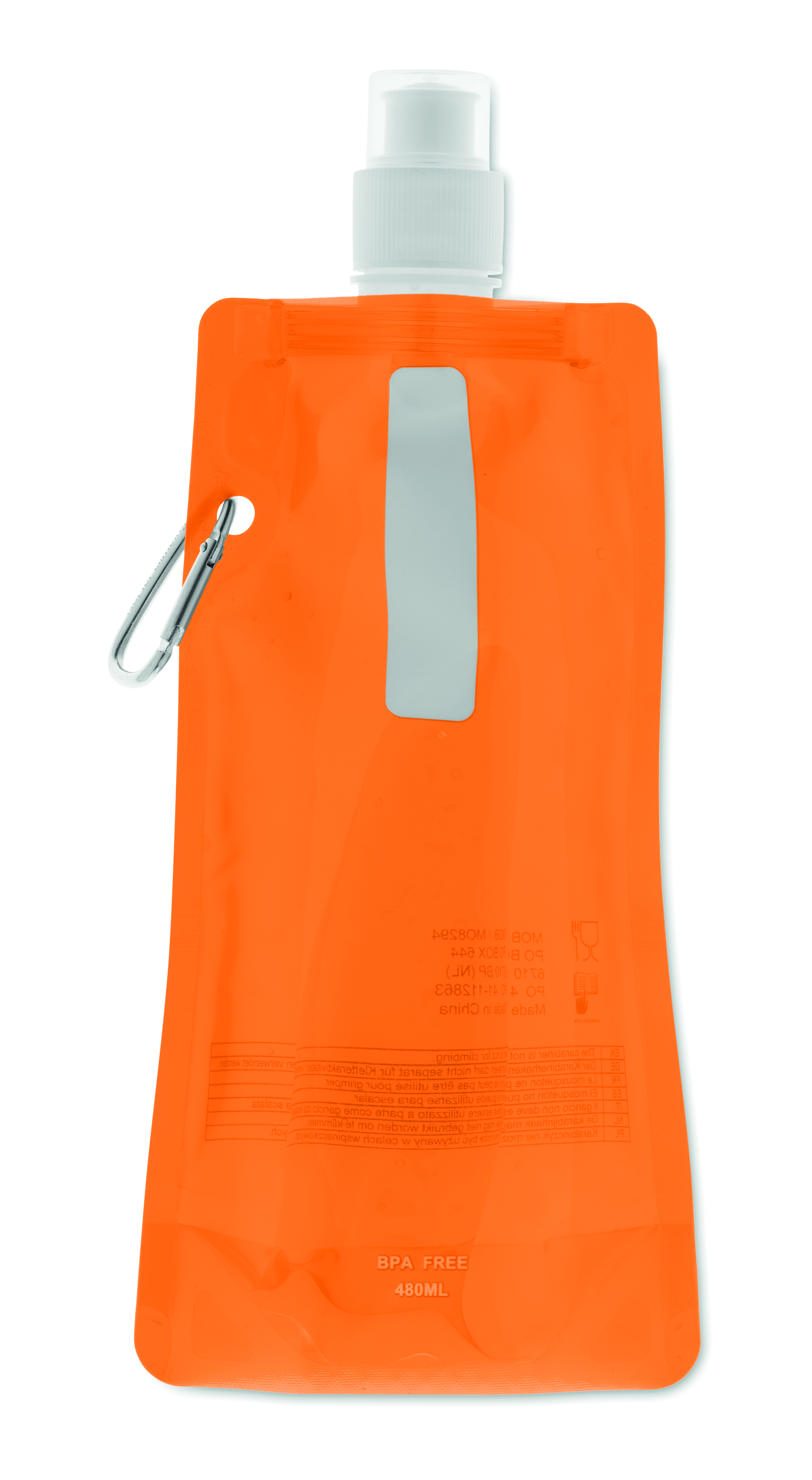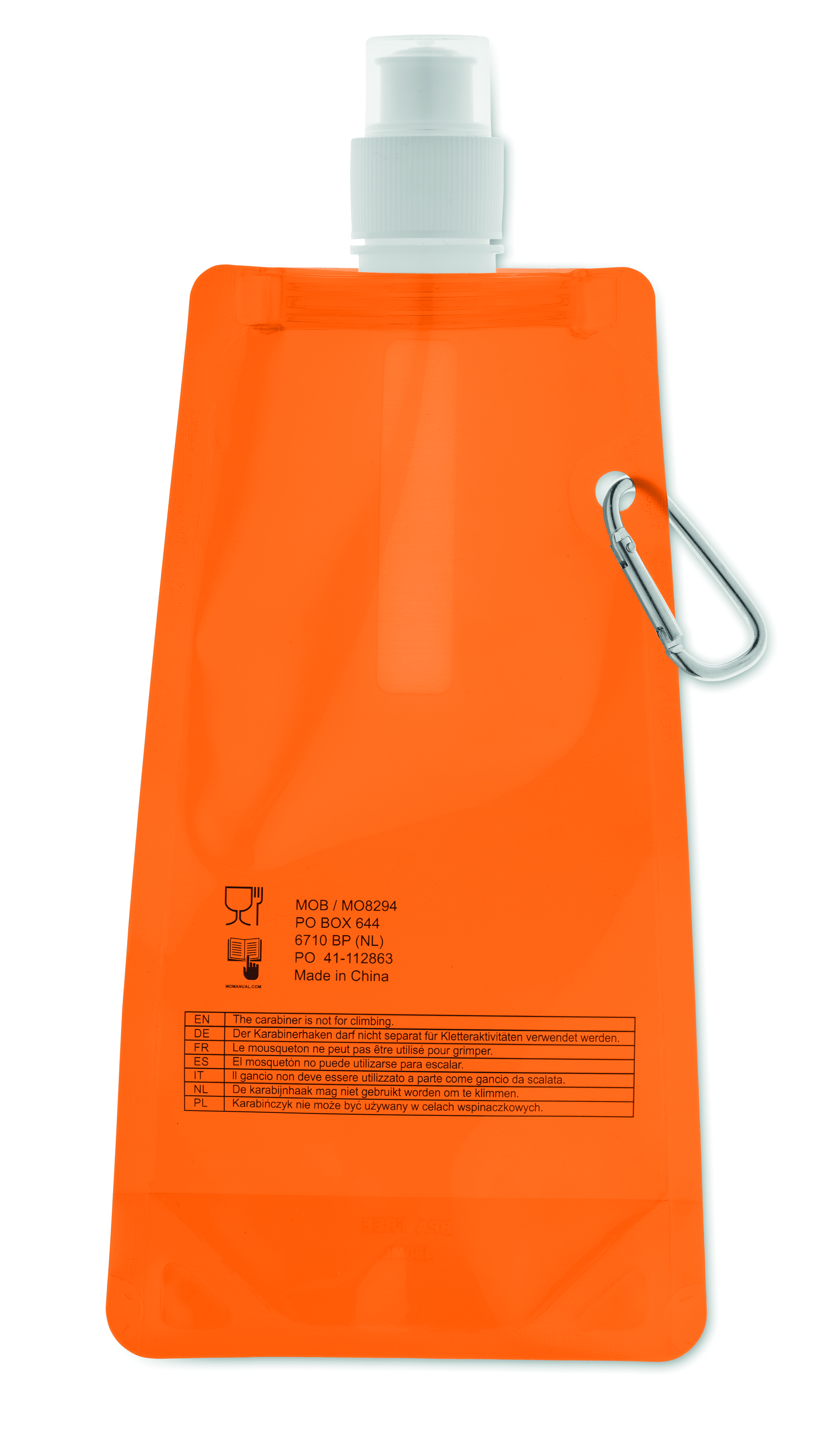 Składany plastikowy pojemnik na wodę z PET (nie zawiera BPA), z aluminiowym karabinkiem. Pojemność 480ml. Szczelna.