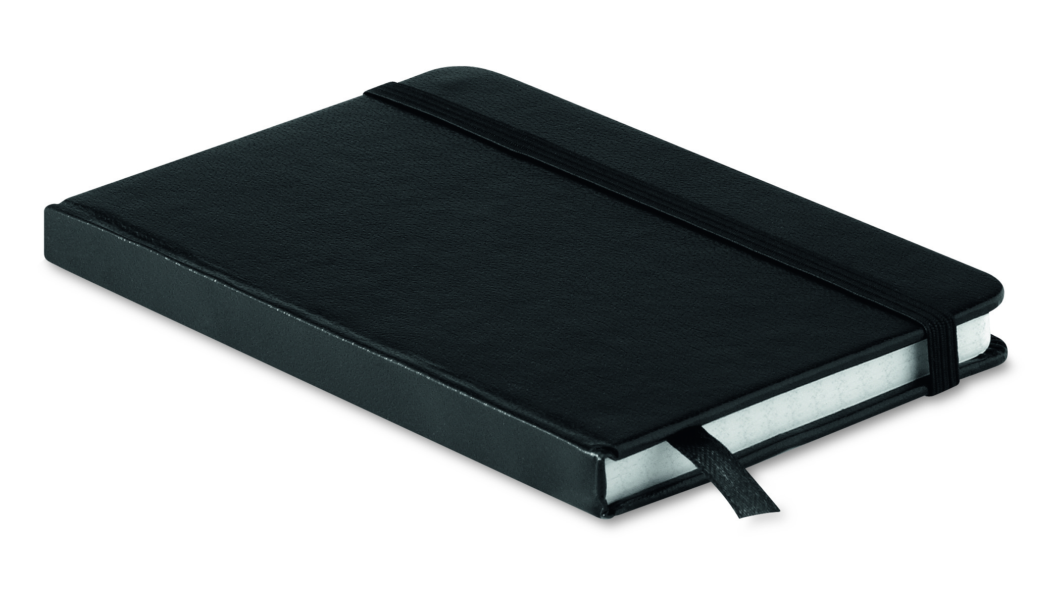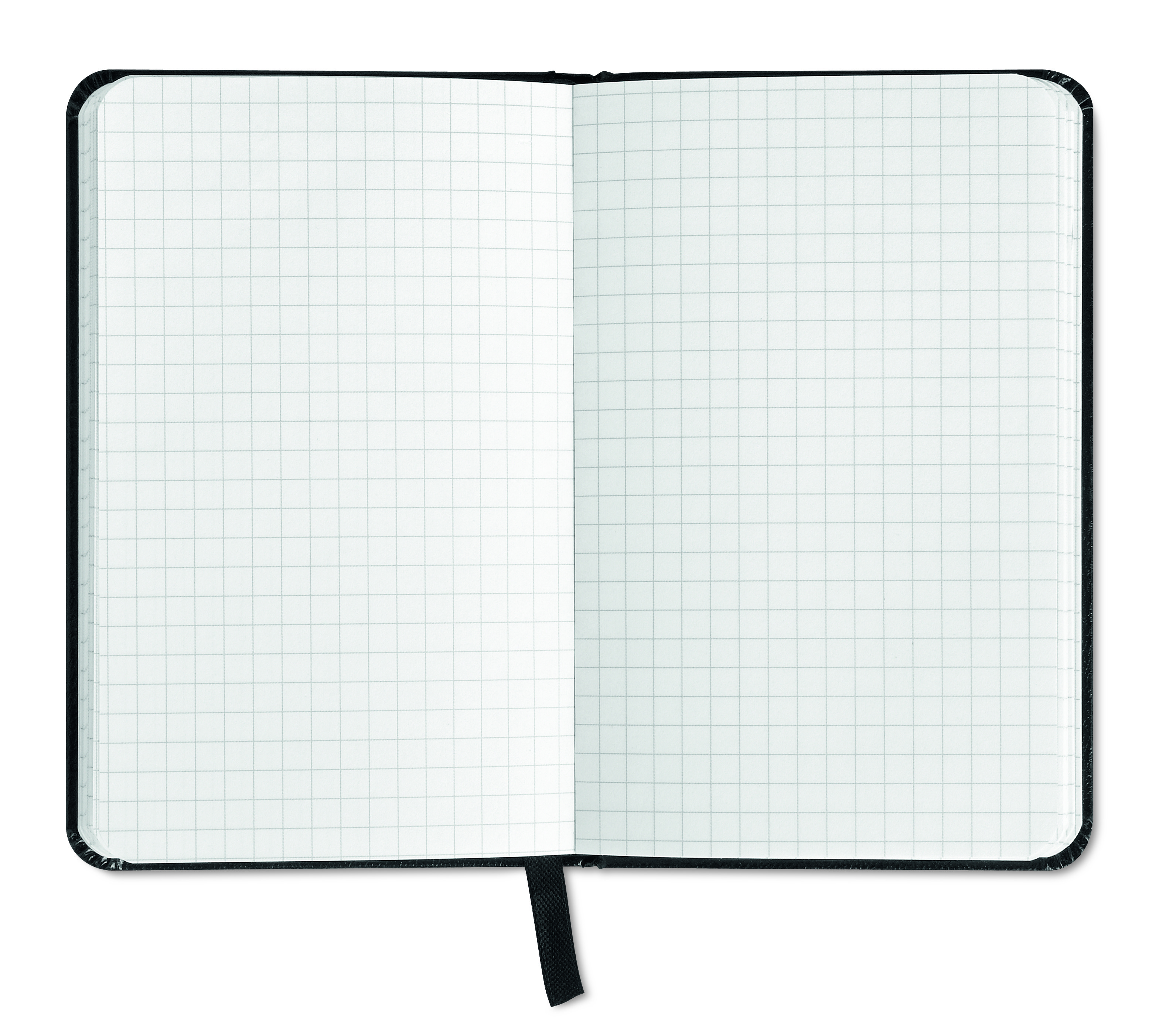 Notatnik A5 z twardą okładką z PVC. 192 strony w kratkę z papieru z recyklingu (96 kartek). Dopasowany elastyczny pasek zamykający i zakładka ze wstążki.
