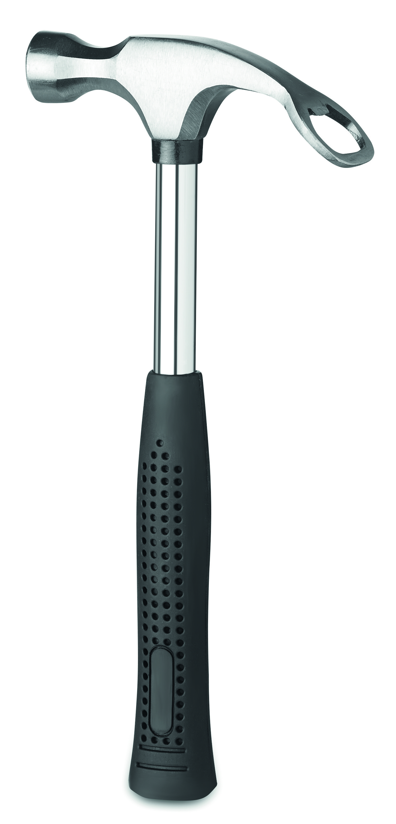 Młotek imprezowy z otwieraczem butelek. Wykonany ze stali węglowej. Rączka pokryta termoplastycznym elastomerem.