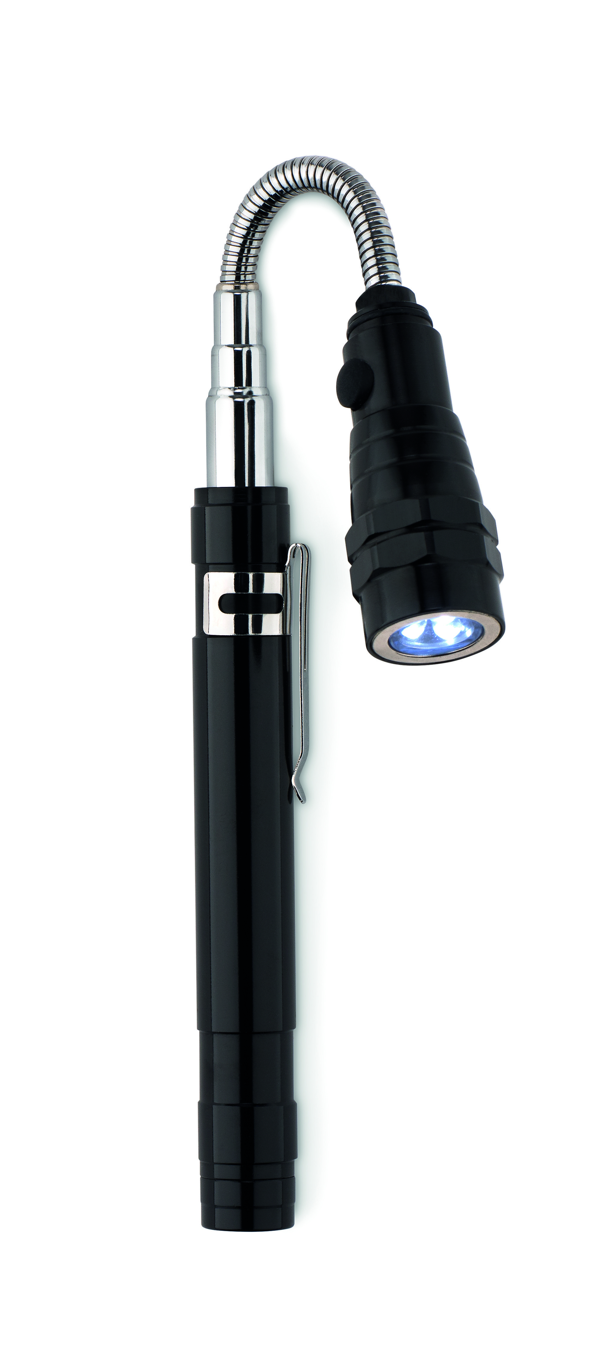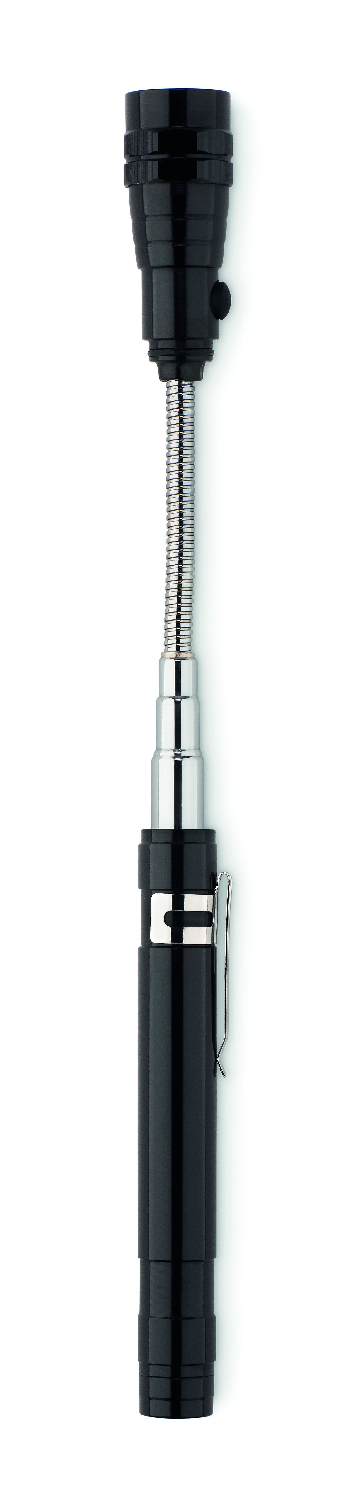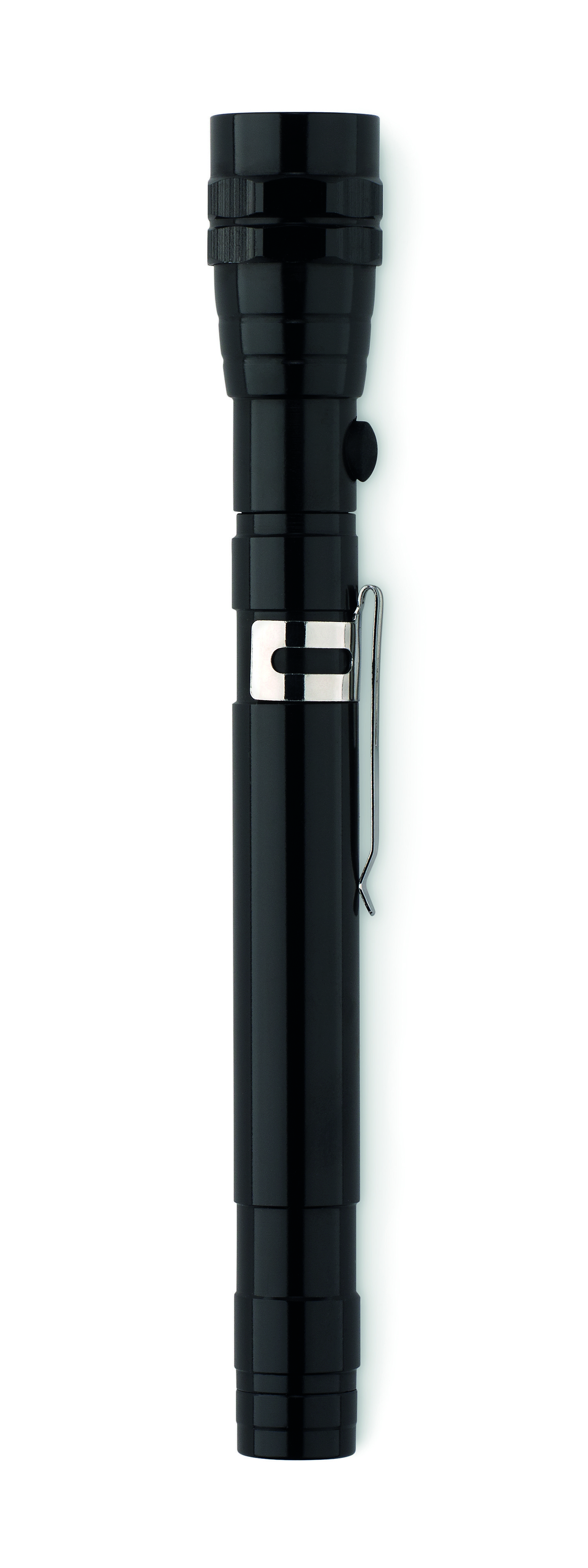 Teleskopowa, aluminiowa latarka z 3 diodami LED, magnesem na głowicy oraz klipem umieszczonym z boku. Max. dł. 57cm. Dołączone 4 baterie LR44.