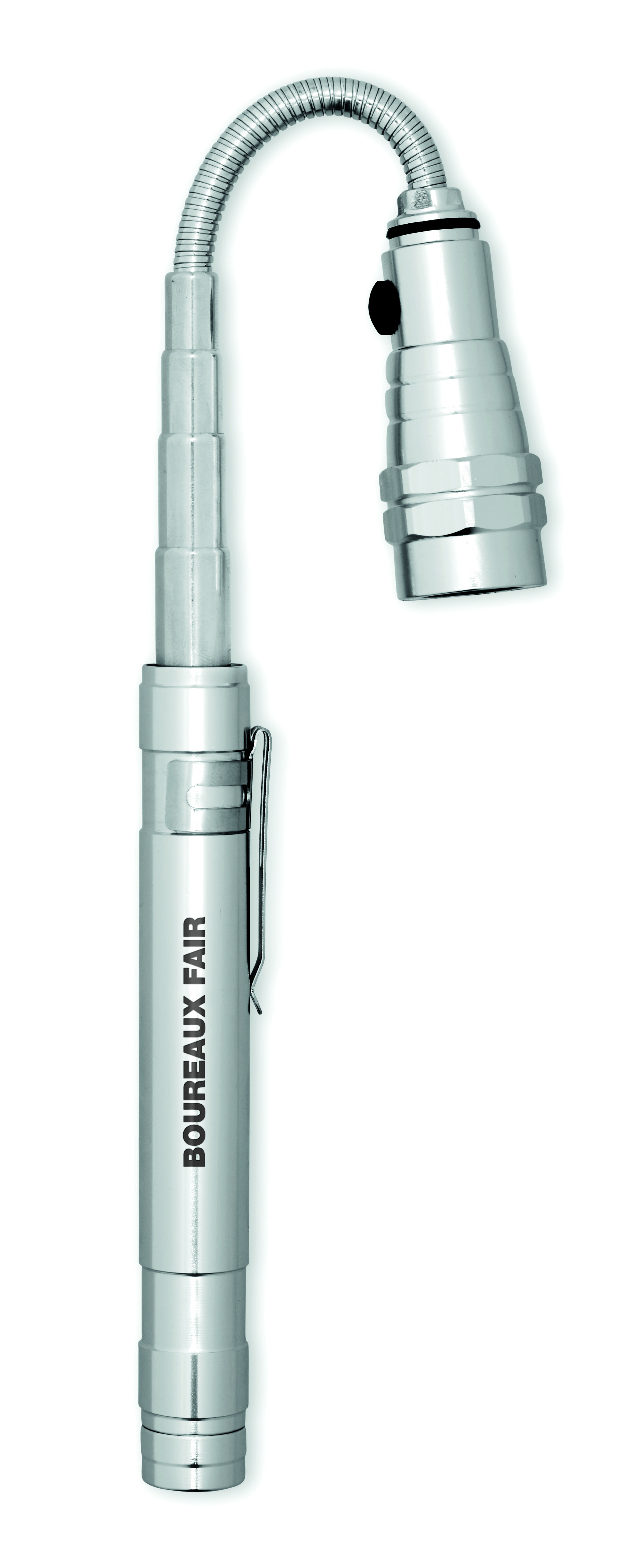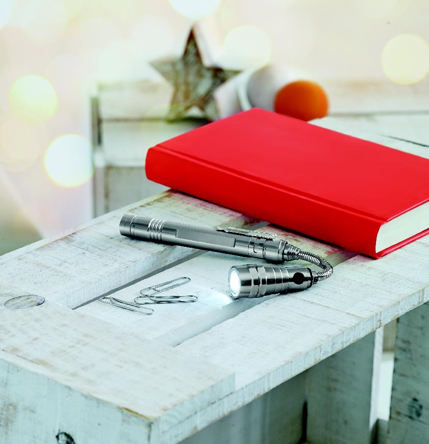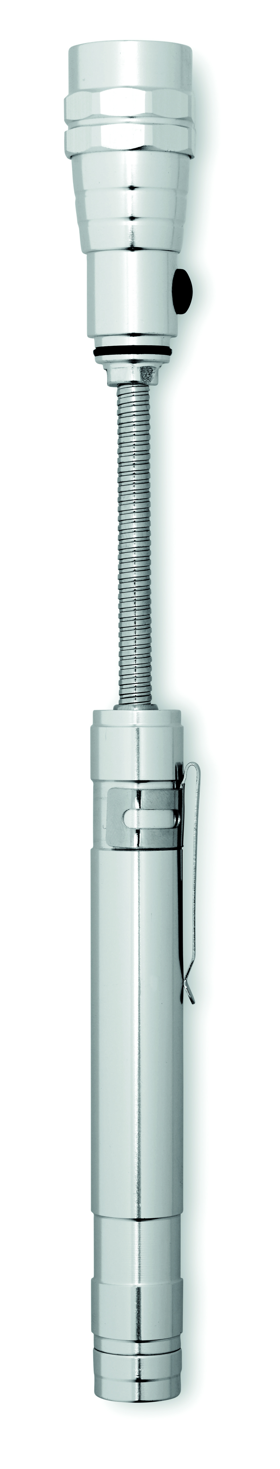 Teleskopowa, aluminiowa latarka z 3 diodami LED, magnesem na głowicy oraz klipem umieszczonym z boku. Max. dł. 57cm. Dołączone 4 baterie LR44.