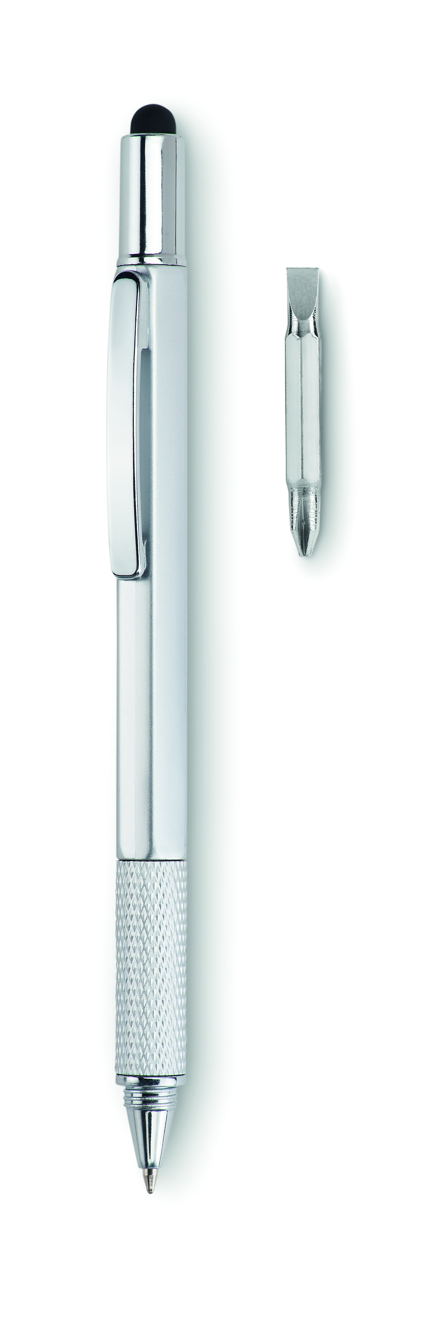 Przekręcany długopis z poziomicą, wykonany z ABS. Wyposażony w linijkę, rysik oraz podwójny śrubokręt gwiazdka i płaski. Czarny tusz.
