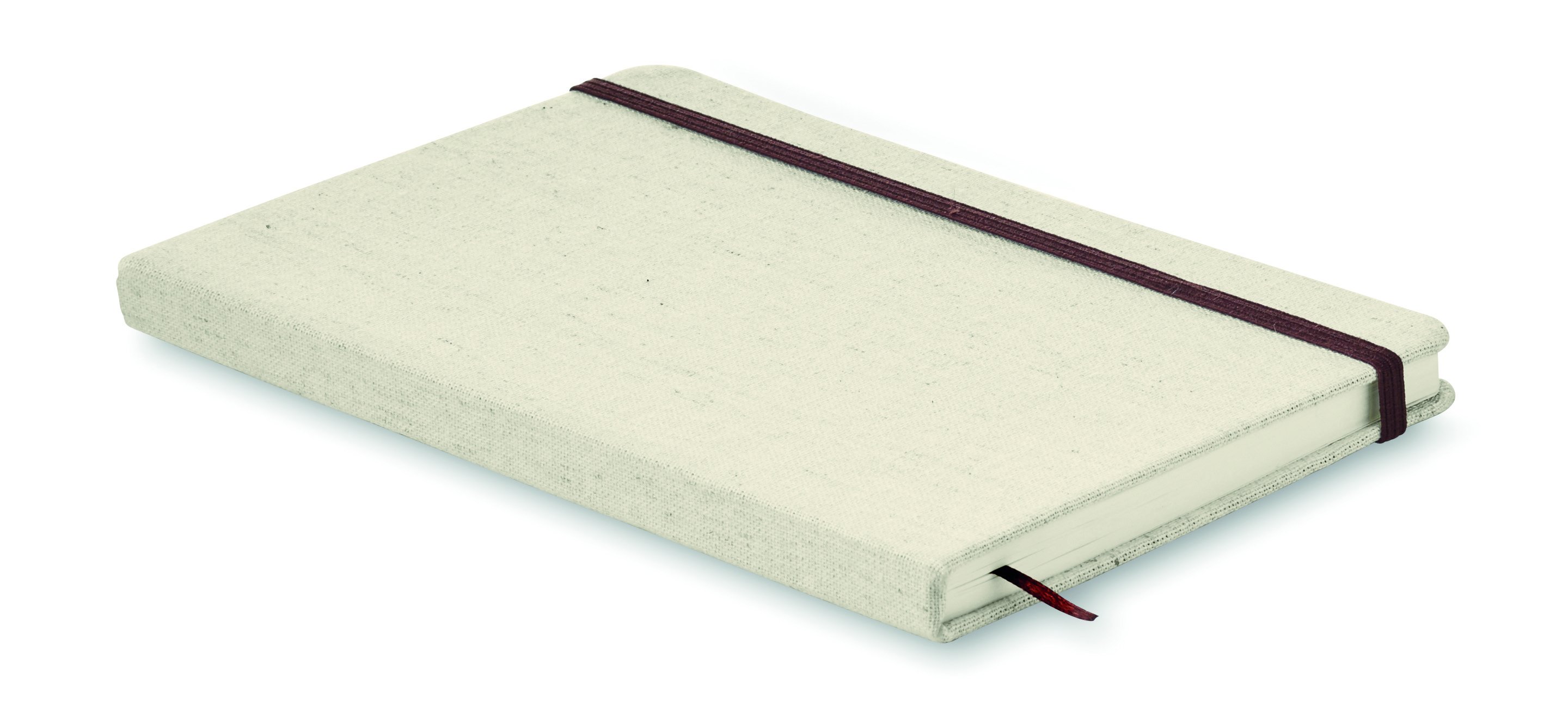 Notatnik A5 z twardą płócienną okładką. Oprawiony. 192 strony w linie z papieru z recyklingu (96 arkuszy). Kontrastowy elastyczny pasek i wstążka do oznaczania stron.