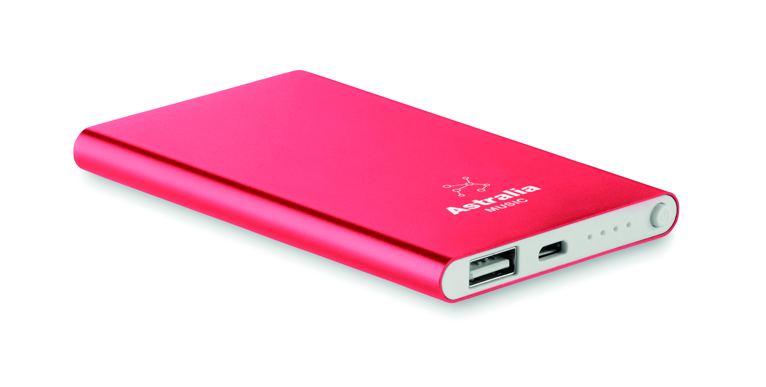Power bank 4000 mAh z aluminium pochodzącego z recyklingu. Pojemność do smartfonów, prąd wyjściowy DC5V/1A. Zawiera lampkę kontrolną i kabel USB z wtyczką micro USB.