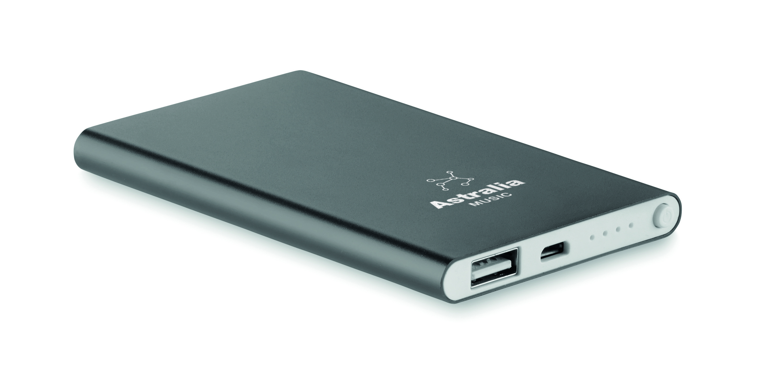 Power bank 4000 mAh z aluminium pochodzącego z recyklingu. Pojemność do smartfonów, prąd wyjściowy DC5V/1A. Zawiera lampkę kontrolną i kabel USB z wtyczką micro USB.