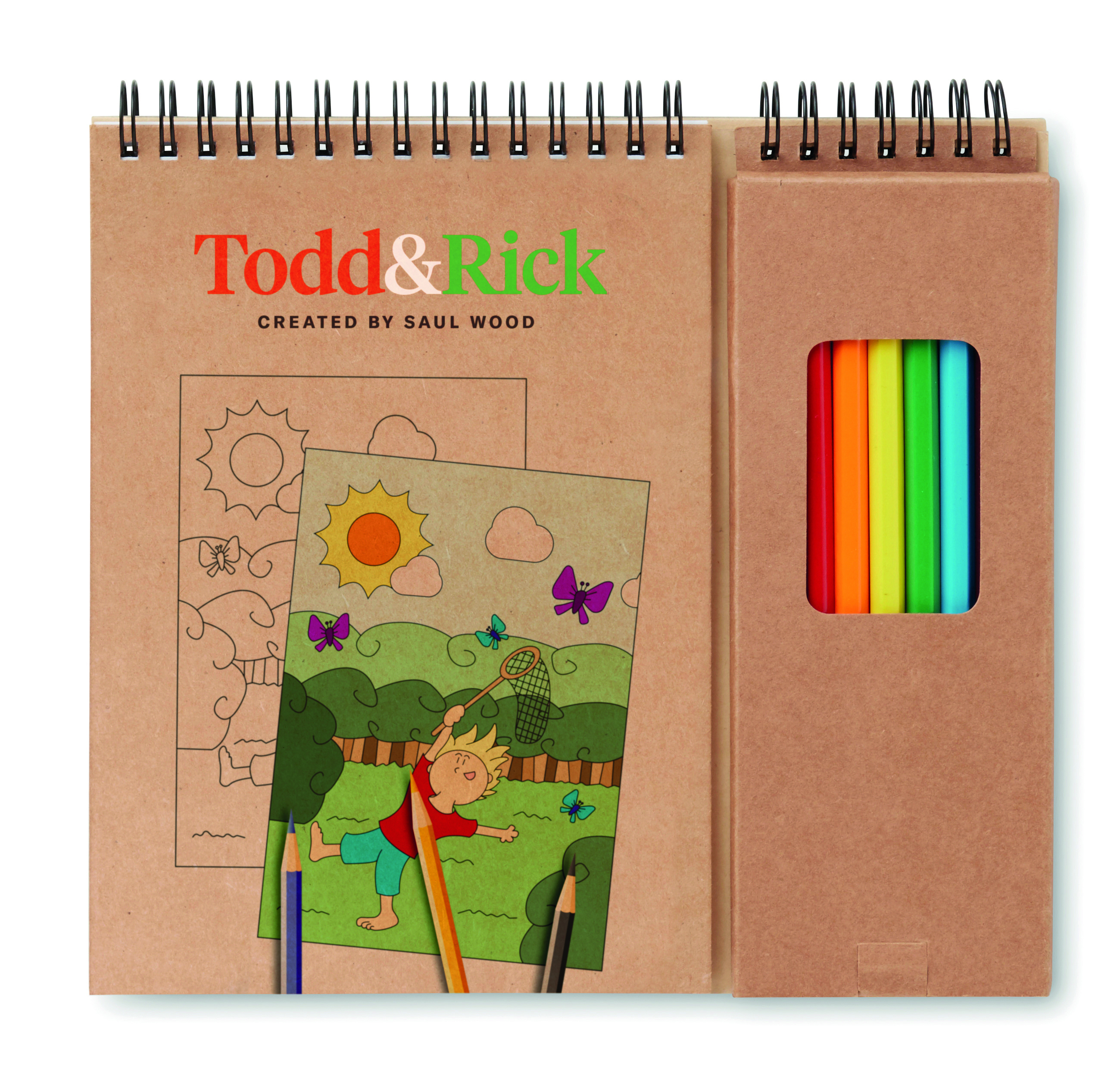Zestaw do kolorowania składający się z 24 kartek. 6 do kolorowania i 18 pustych. Zestaw zawiera 8 kredek