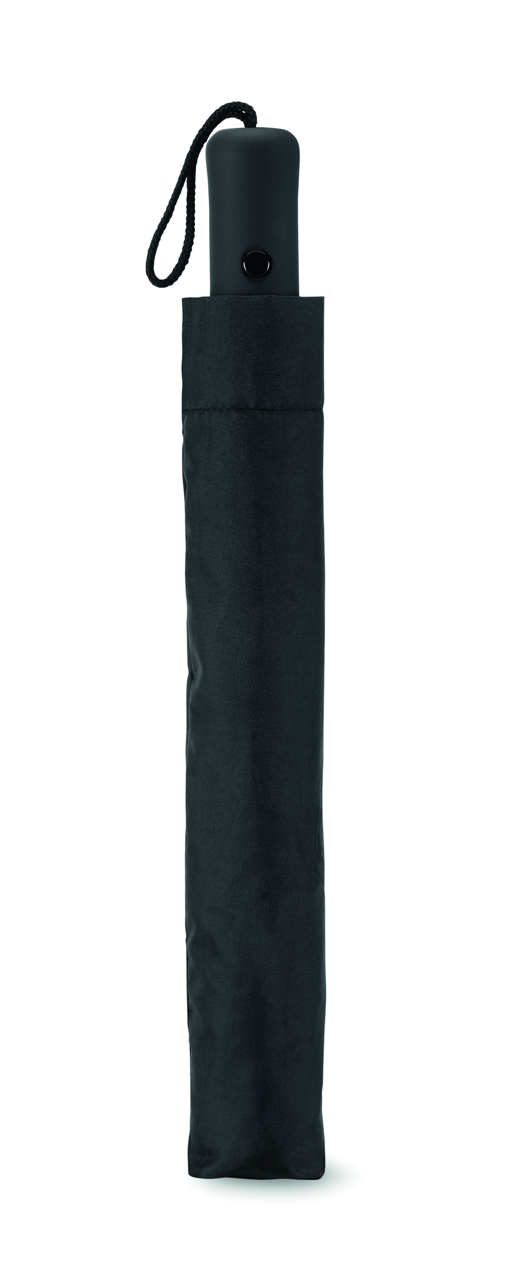 Parasol 21cali, otwierany automatycznie, składany na 2. Wykonany z wysokiej jakości poliestru pongee 190T, trzon, żebra i końcówki ocynkowane. Czarna gumowana rączka z ABS. Posiada dopasowane etui. Zamykany manualnie.