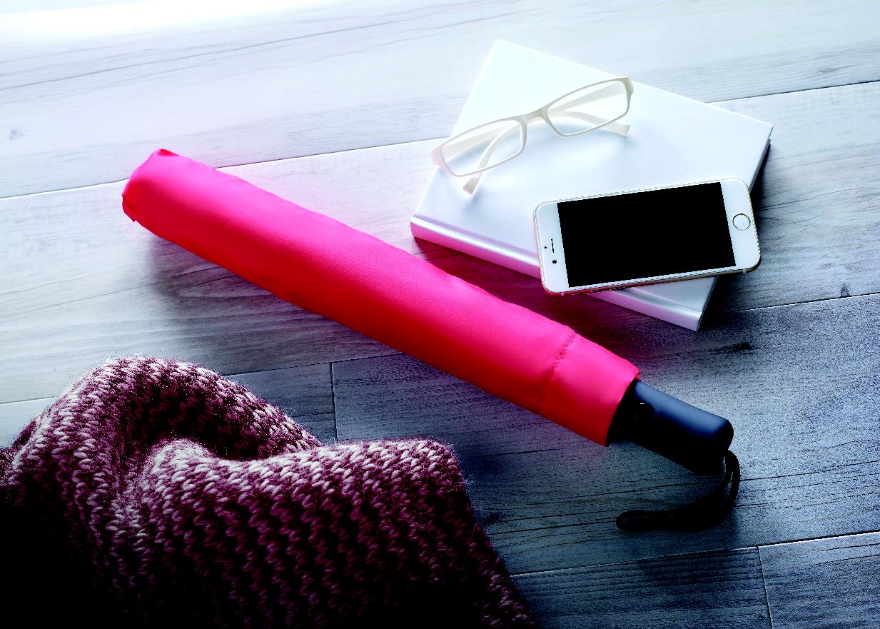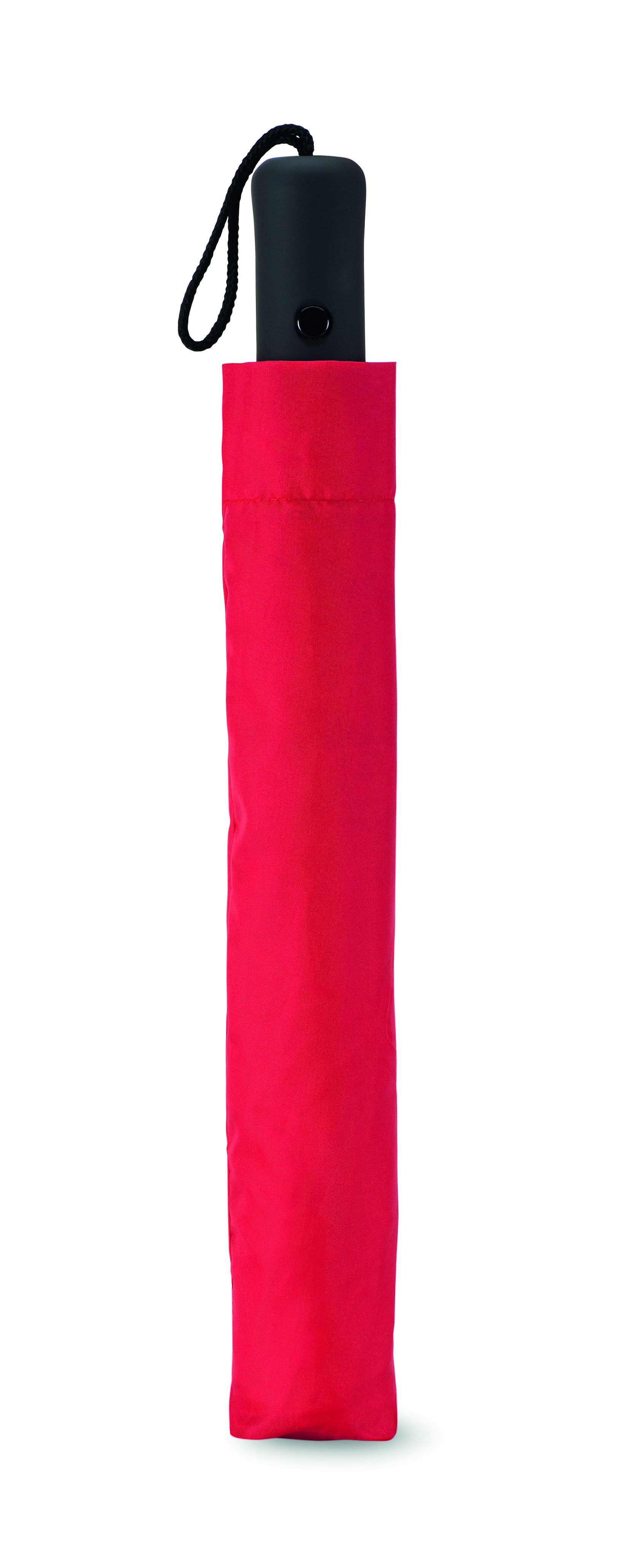 Parasol 21cali, otwierany automatycznie, składany na 2. Wykonany z wysokiej jakości poliestru pongee 190T, trzon, żebra i końcówki ocynkowane. Czarna gumowana rączka z ABS. Posiada dopasowane etui. Zamykany manualnie.