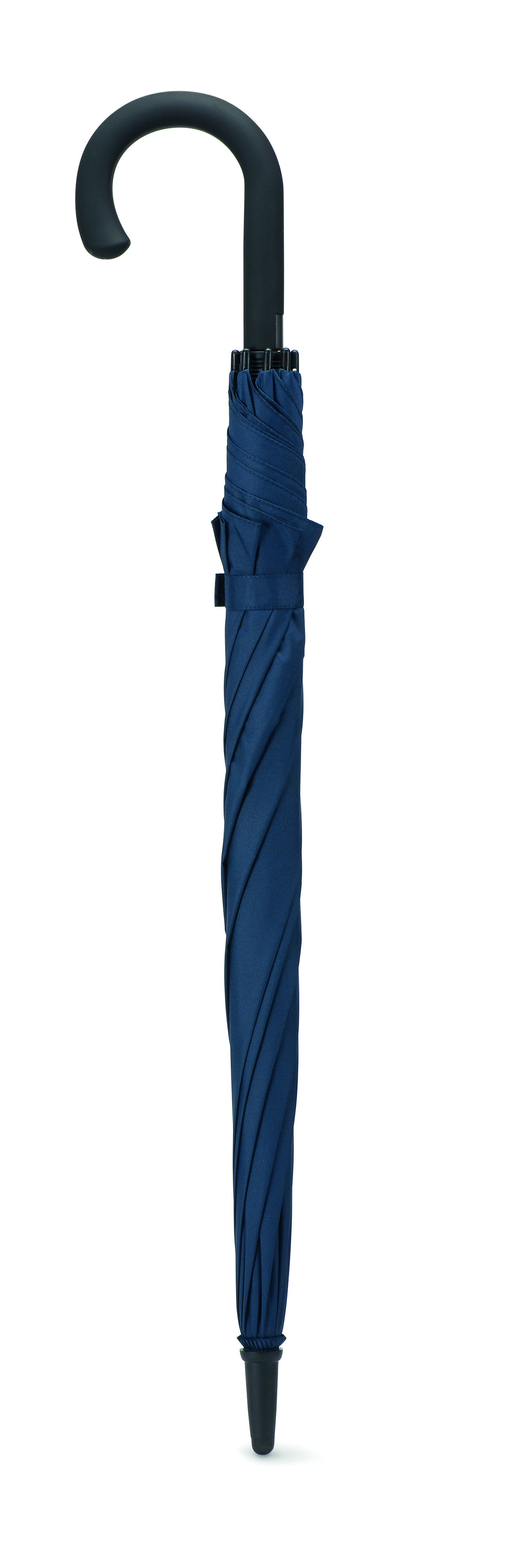 Elegancki 23 calowy parasol automatyczny odporny na działanie silnego wiatru wykonany z tkaniny 190T. Trzon czerniony, żebra wykonane z włókna szklanego, zakończenia plastikowe. Zakrzywiona rączka z gumowanego plastiku. Zapięcie manualne.