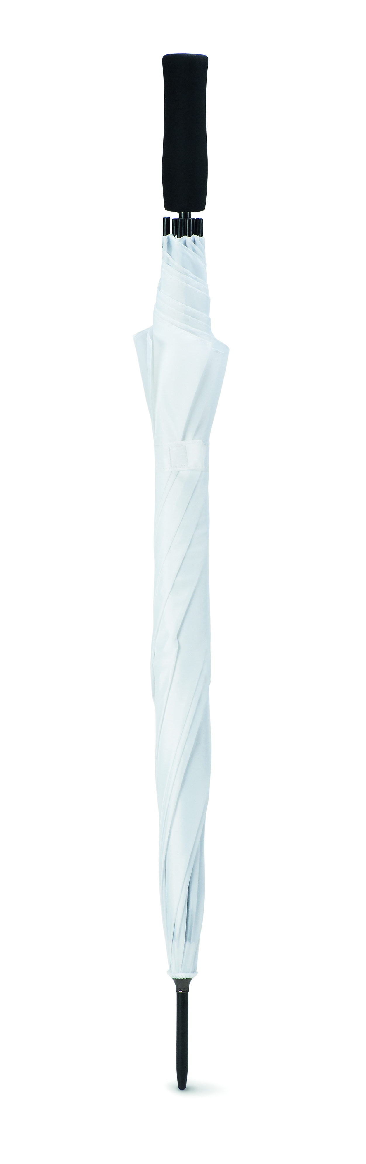 Parasol automatyczny 23 cale wykonany z pongee 190T, z czernionym metalowym trzonem i ożebrowaniem, czarne plastikowe zakończenia. Rączka wykonana z pianki EVA, zapięcie manualne.
