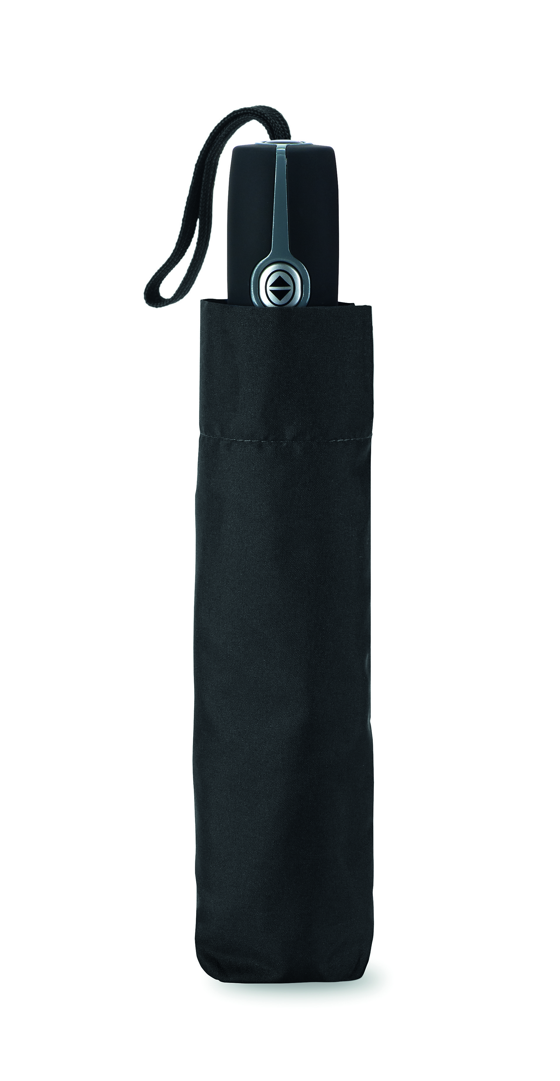 Ekskluzywny 21 calowy automatyczny parasol wykonany z wysokogatunkowego materiału 190T. Trzon metalowy, czarne ożebrowanie 2 sekcyjne wykonane z włókna szklanego zakończenia chromowane. Czarna gumowana rączka z automatycznym zamknięciem.