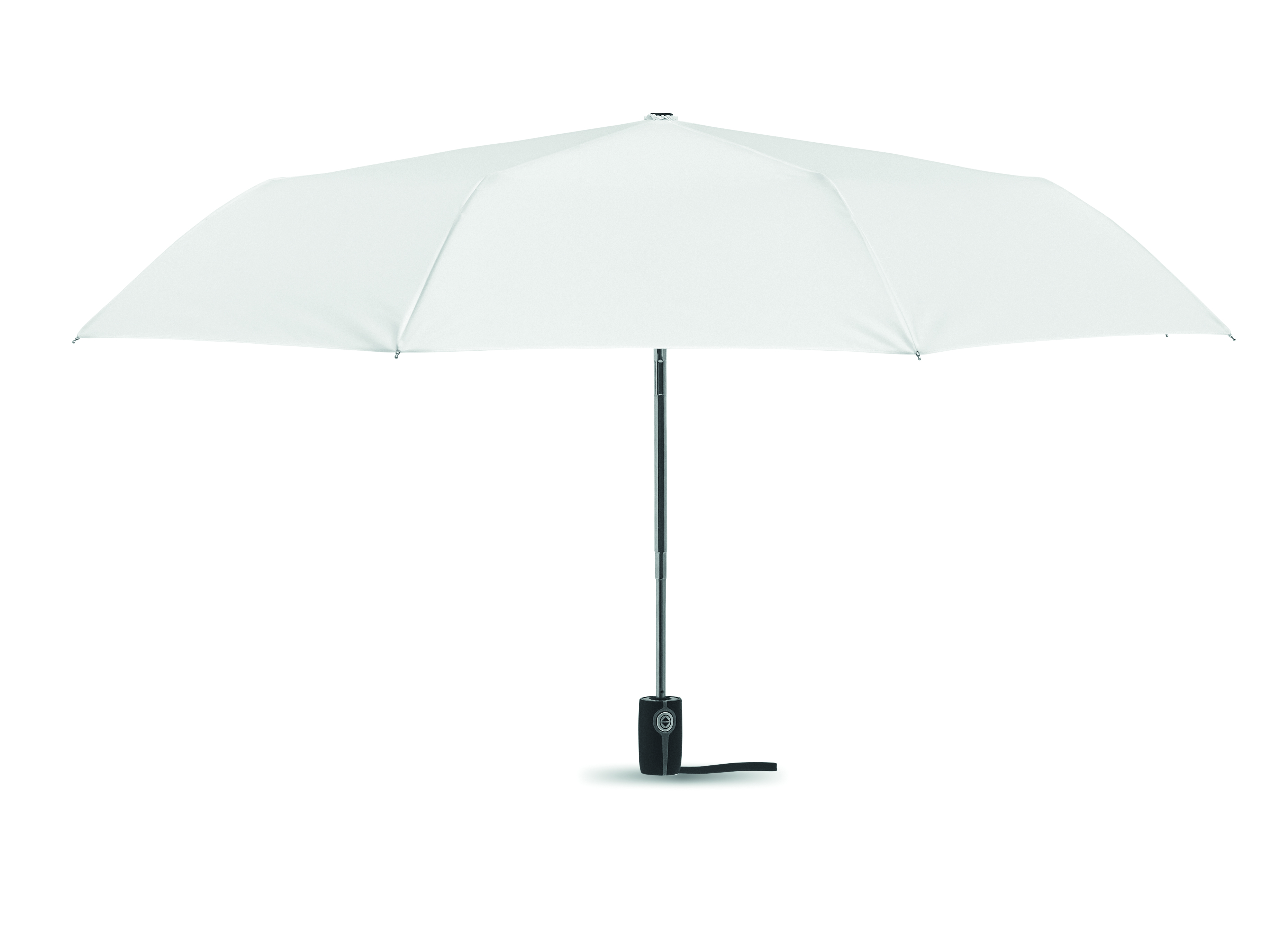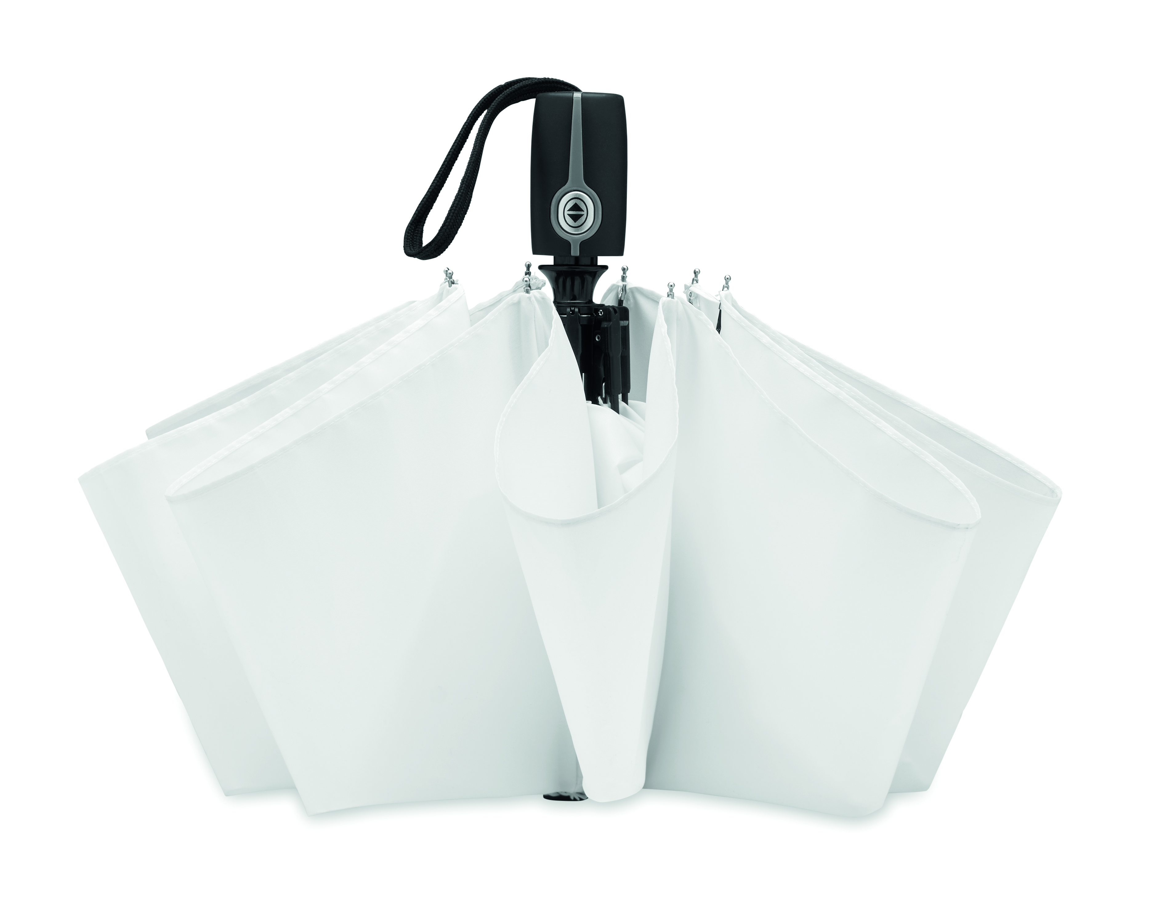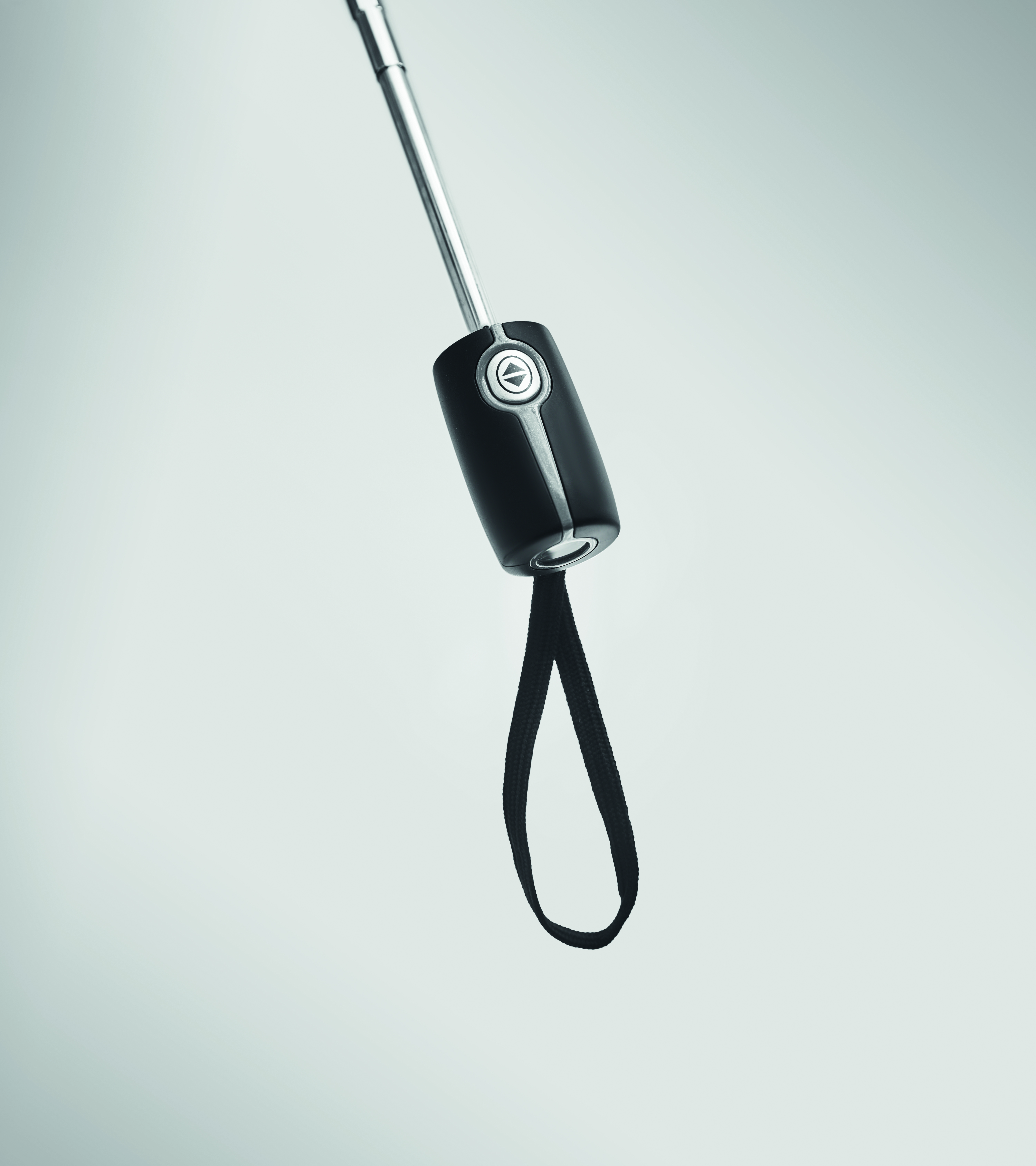 Ekskluzywny 21 calowy automatyczny parasol wykonany z wysokogatunkowego materiału 190T. Trzon metalowy, czarne ożebrowanie 2 sekcyjne wykonane z włókna szklanego zakończenia chromowane. Czarna gumowana rączka z automatycznym zamknięciem.